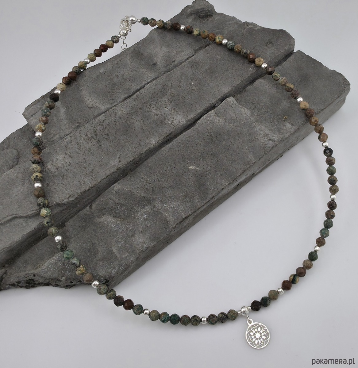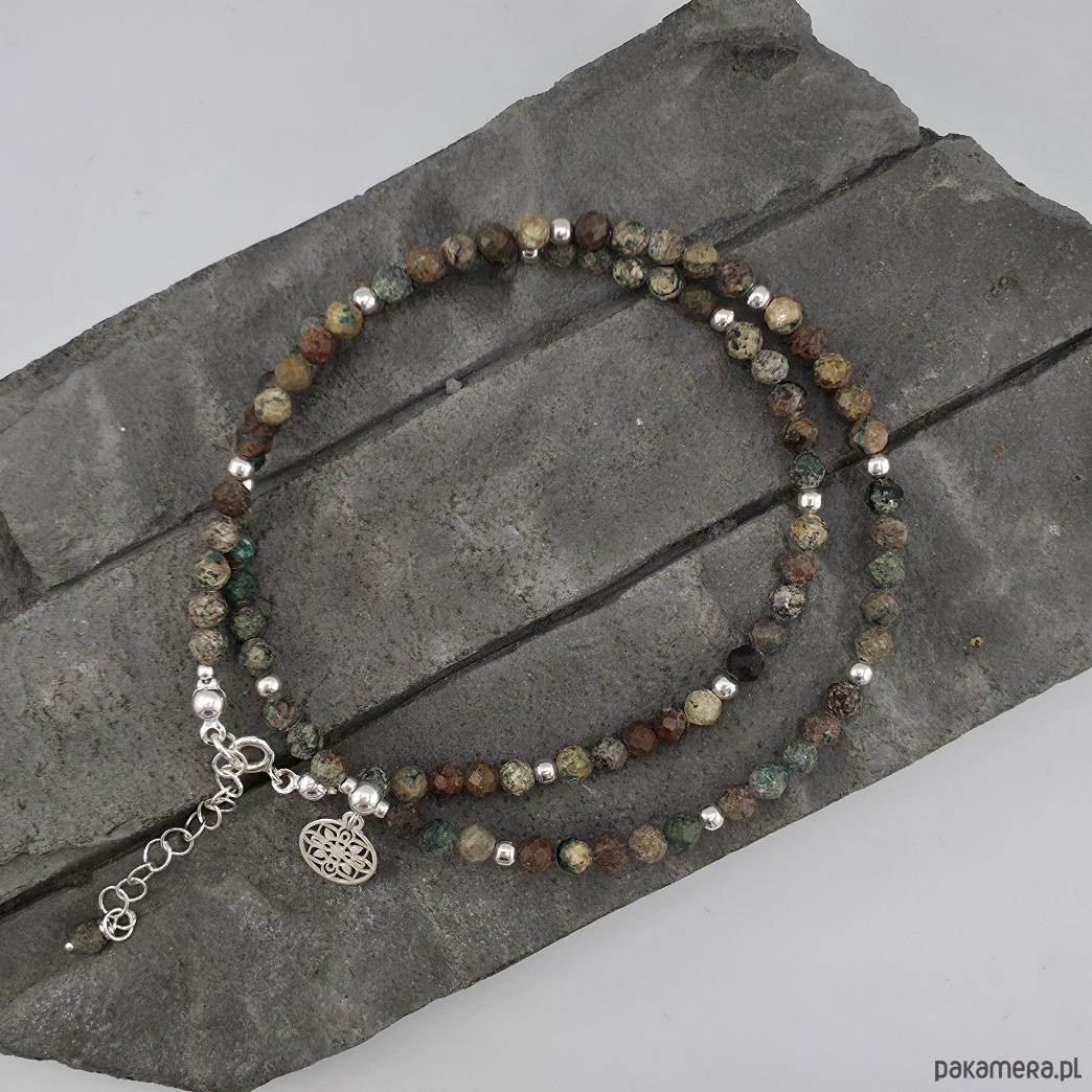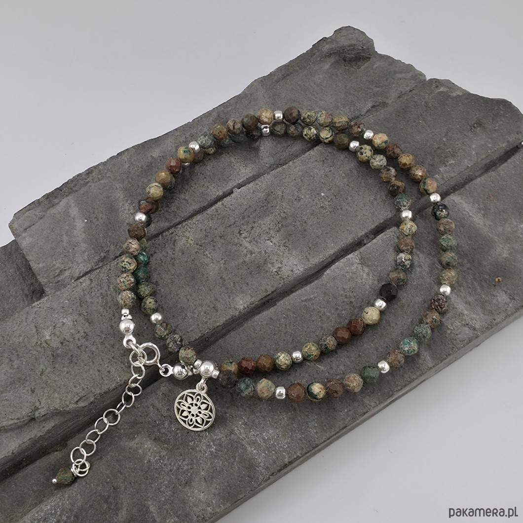 Delikatny naszyjnik wykonany w całości ze srebra próby 925 oraz fasetowanych kulek turkusu wielkości ok. 4 mm. Całkowita długość naszyjnika to 44 mm plus regulacja 4 cm. Wielkość srebrnej rozety to 10 mm. Naszyjnik mogę zoksydować lub wykonać podobny z innymi kamieniami. Ozdobnie zapakowany.