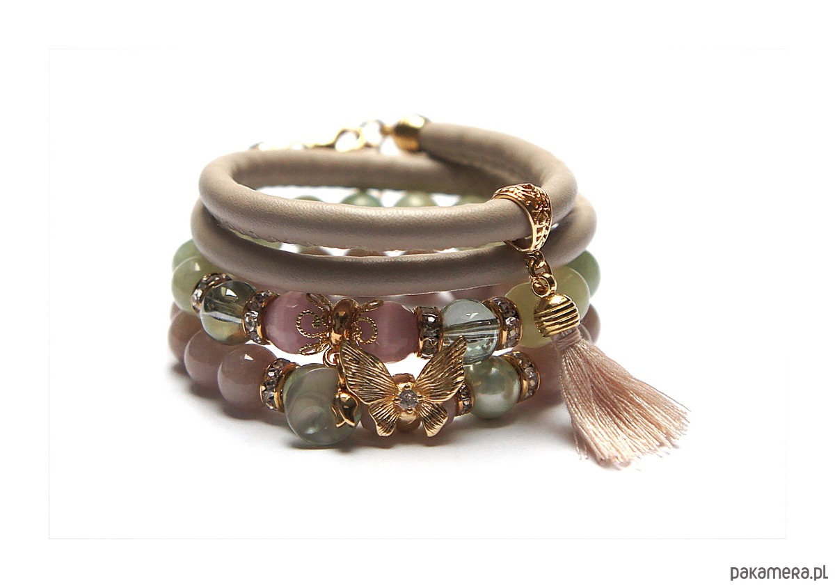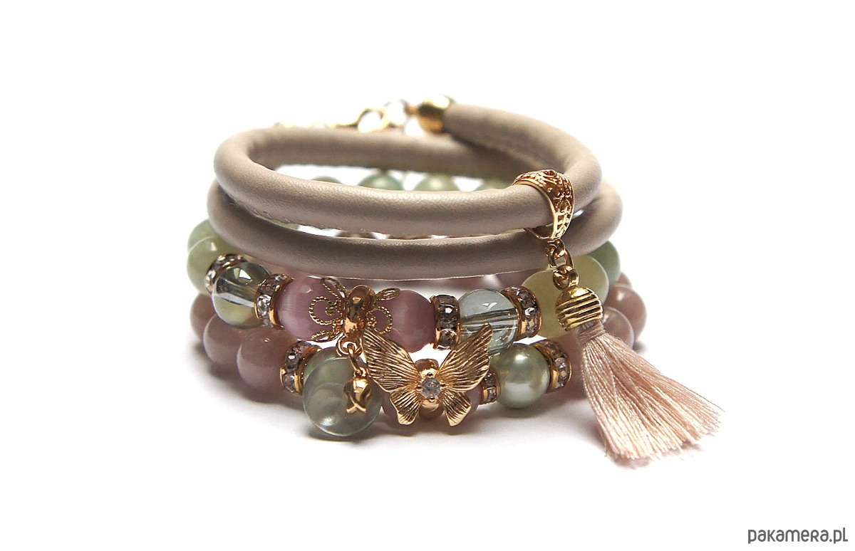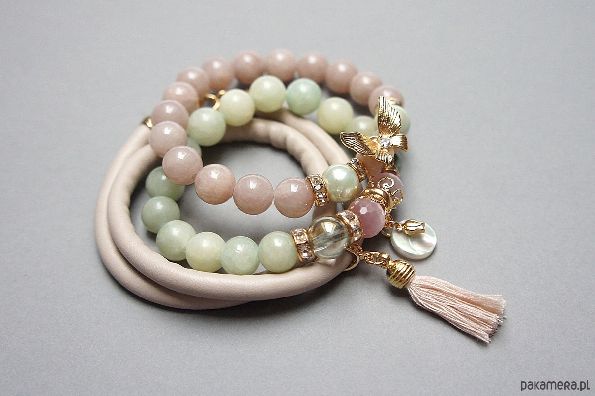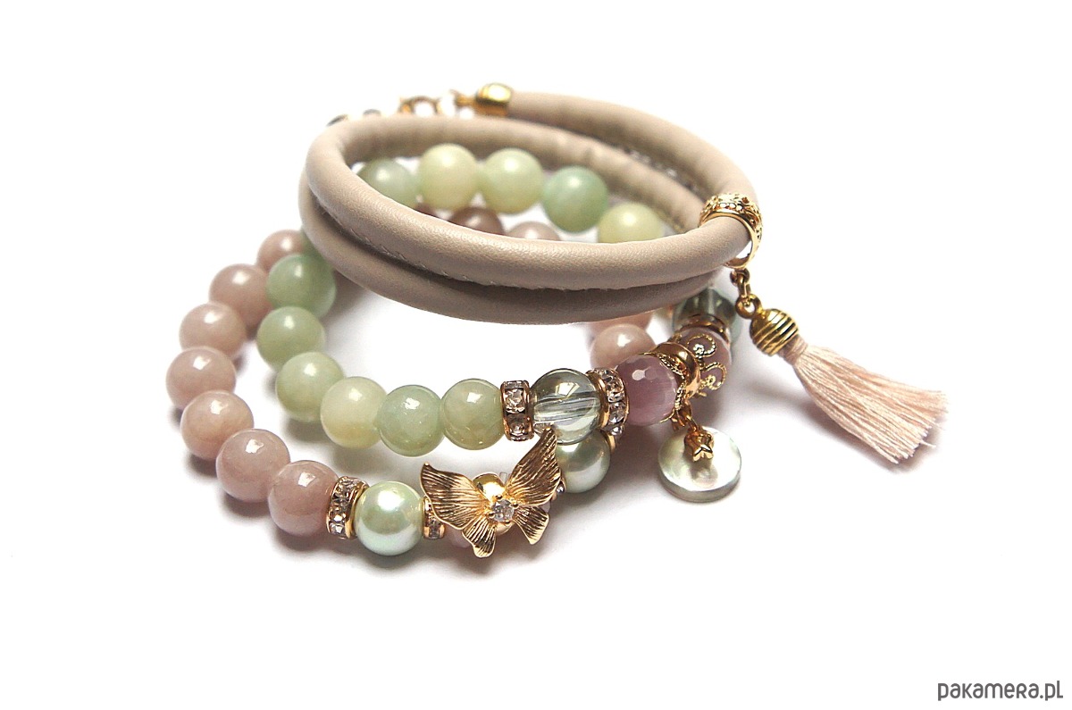 Komplet trzech bransoletek wykonanych z naturalnych kamieni - jadeity [10mm], kocie oko fasetowane [10mm], perły majorka [10mm], kryształki fasetowane [8mm], szkło opalizujące [10mm], rzemienia z ekologicznej skóry, zawieszki z żywicy, chwostu oraz elementów metalowych w kolorze złotym. Bransoletki pasują na nadgarstek 15cm - 16cm. Biżuteria ozdobnie zapakowana