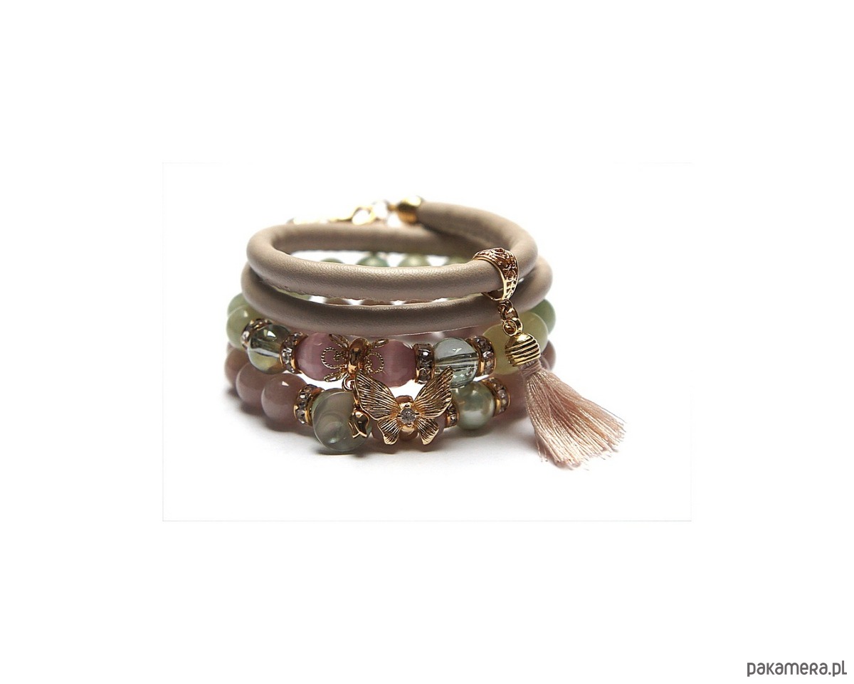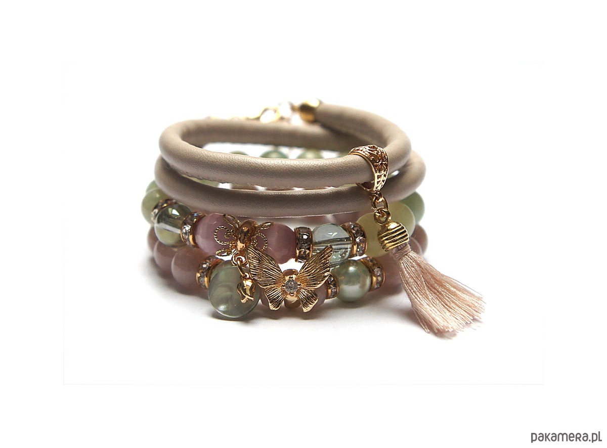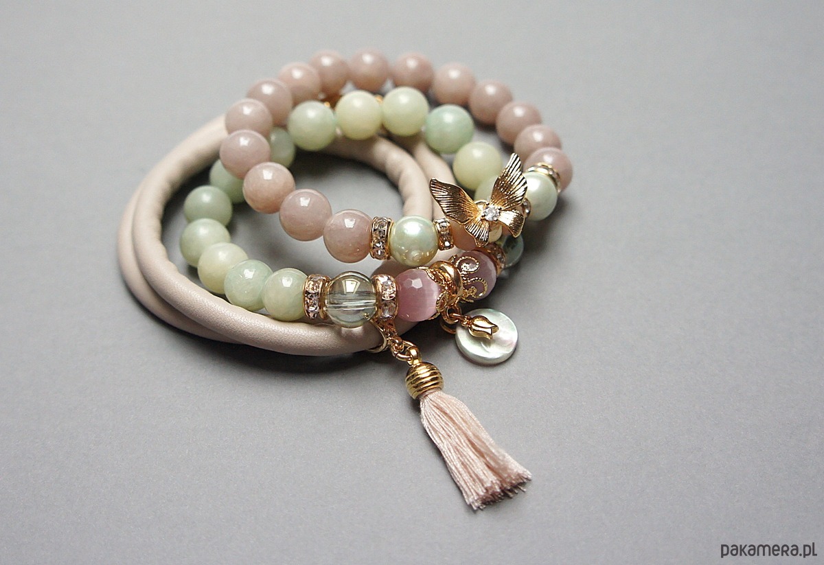 Komplet trzech bransoletek wykonanych z naturalnych kamieni - jadeity [10mm], kocie oko fasetowane [10mm], perły majorka [10mm], kryształki fasetowane [8mm], szkło opalizujące [10mm], rzemienia z ekologicznej skóry, zawieszki z żywicy, chwostu oraz elementów metalowych w kolorze złotym. Bransoletki pasują na nadgarstek 15cm - 16cm. Biżuteria ozdobnie zapakowana