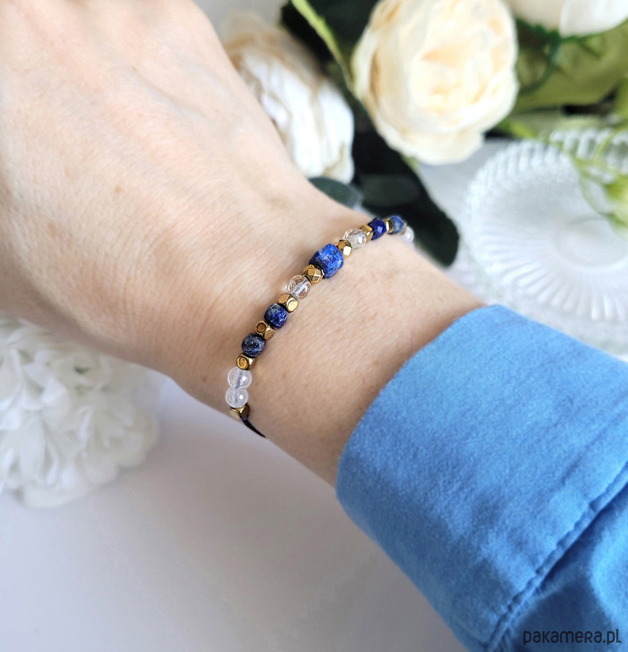 JEDYNA SZTUKA- Przepiękna bransoletka zrobiona z kamieni naturalnych: Lapisu lazuli, Cytrynu, Kryształu górskiego oraz Hematytu w kolorze złota.