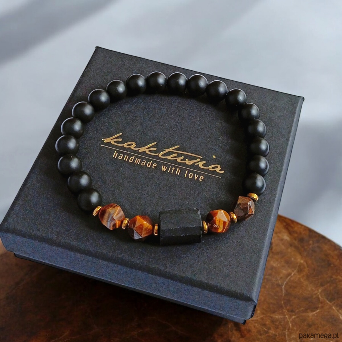 wykonana z surowej bryłki czarnego turmalinu, matowego onyksu (8mm), tygrysiego oka (9-10mm) o ciekawym szlifie gwiazdkowym, przekładek ze złotego hematytu.