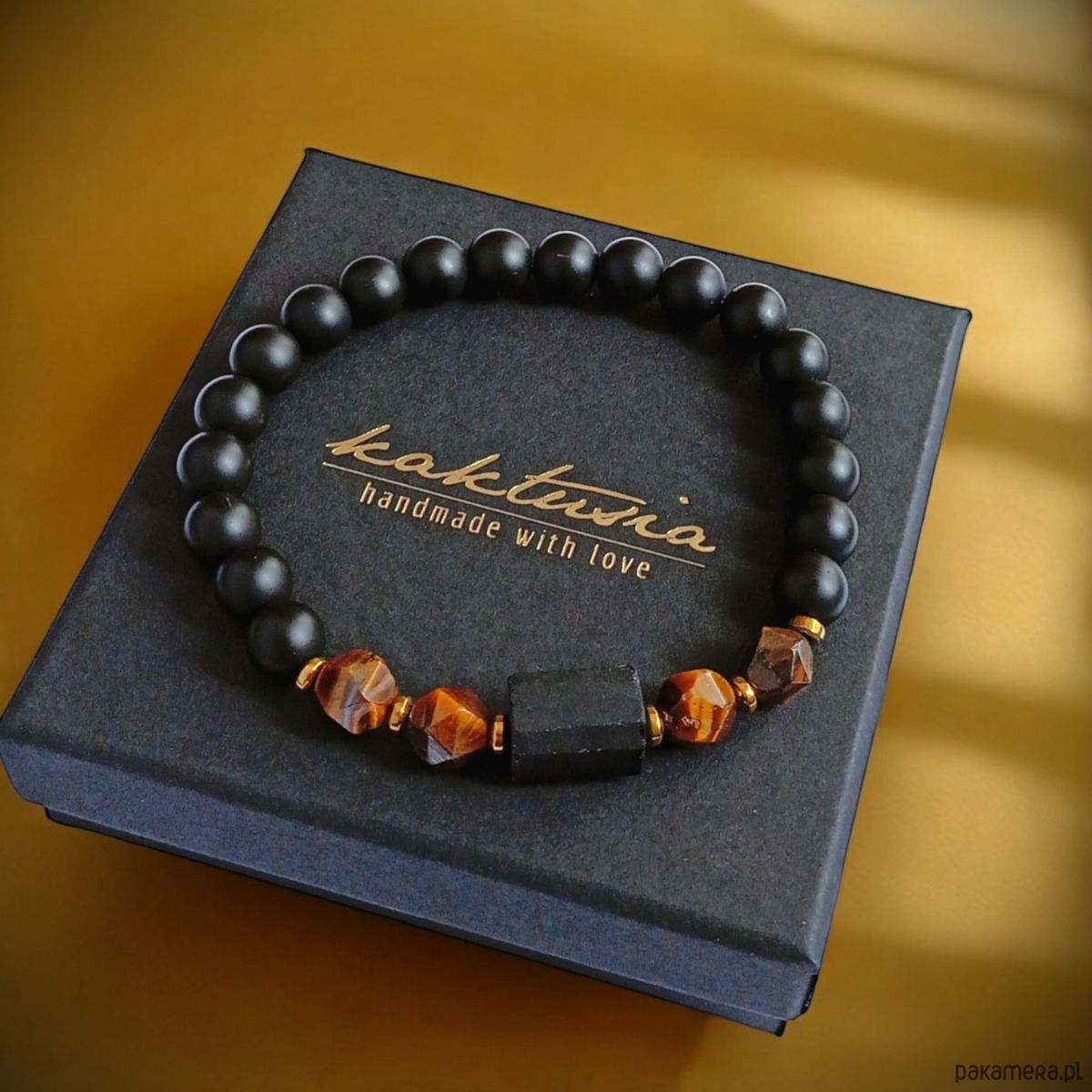wykonana z surowej bryłki czarnego turmalinu, matowego onyksu (8mm), tygrysiego oka (9-10mm) o ciekawym szlifie gwiazdkowym, przekładek ze złotego hematytu.
