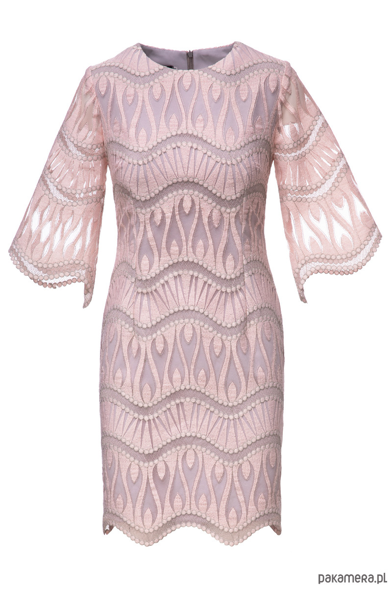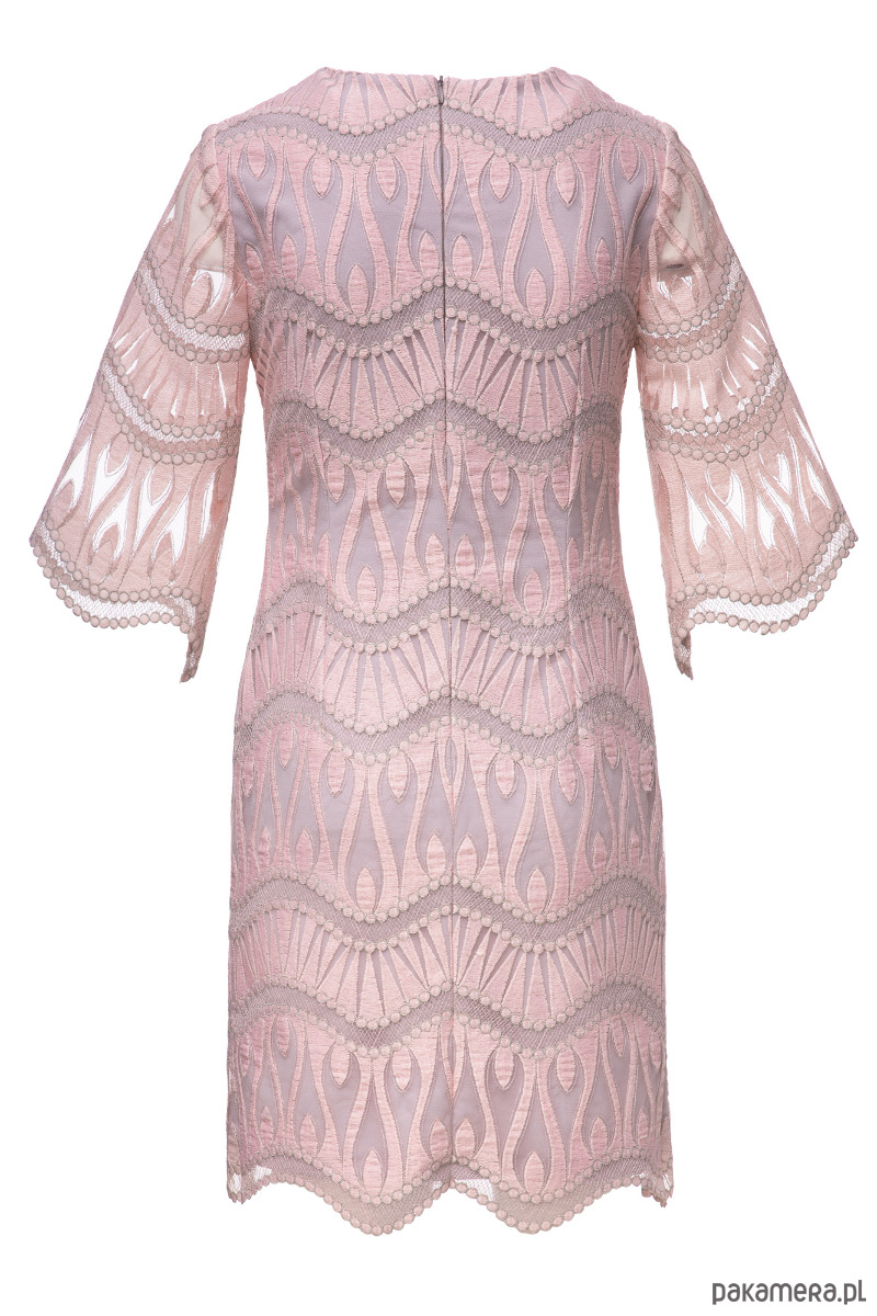 Sukienka uszyta z pięknej koronki w kolorze jasnego różu na szarej podszewce. Materiały są trochę sztywne, minimalnie elastyczne. Prosty fason lekko dopasowany zaszewkami na przodzie i tyle, poszerzone rękawy 3/4, zamek kryty z tyłu, długość około 94-97 cm w zależności od rozmiaru. Przed zakupem prosimy o dokładne zmierzenie sylwetki i przemyślane zakupy.