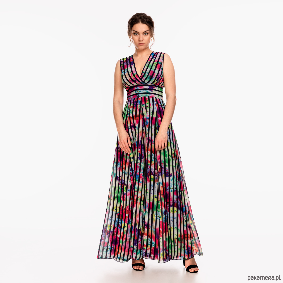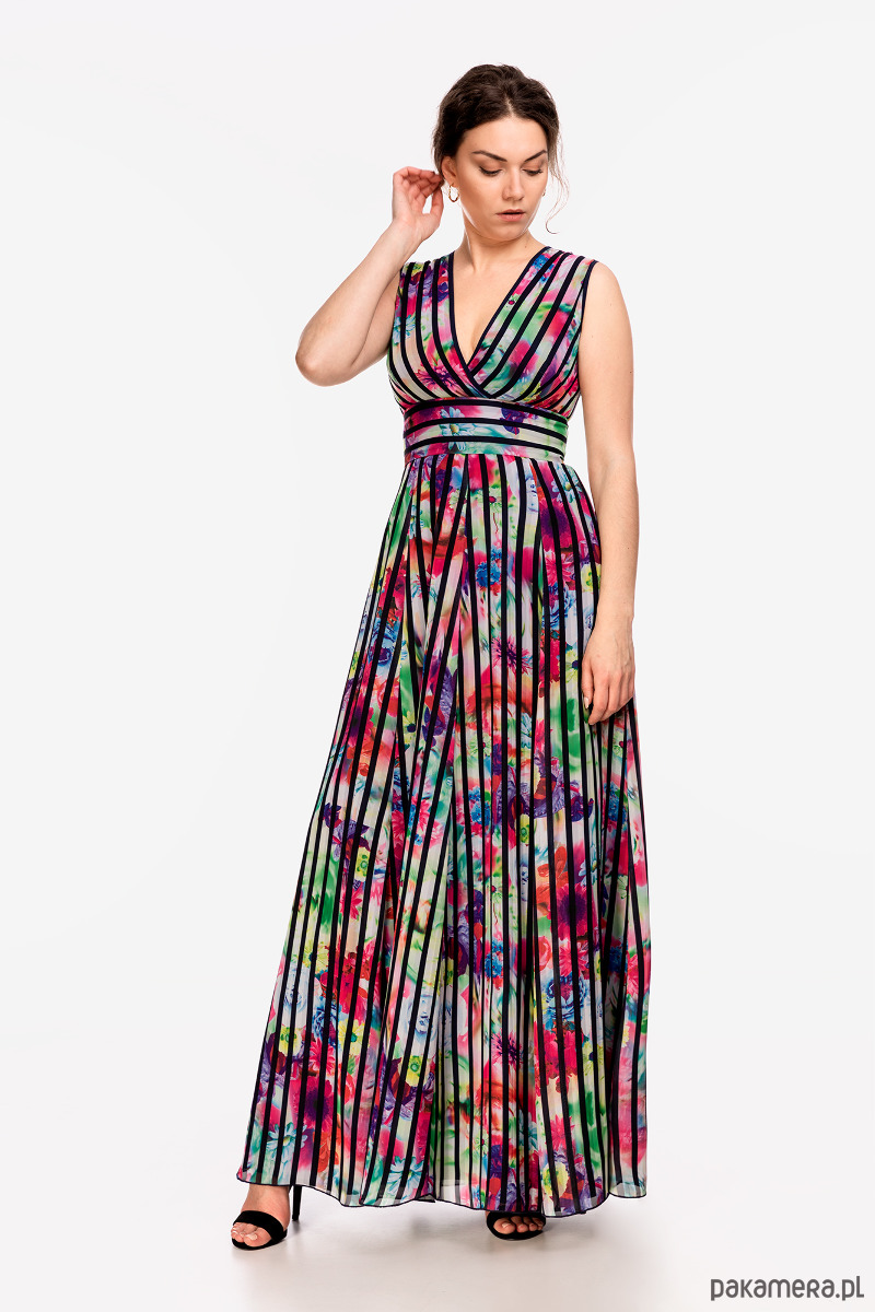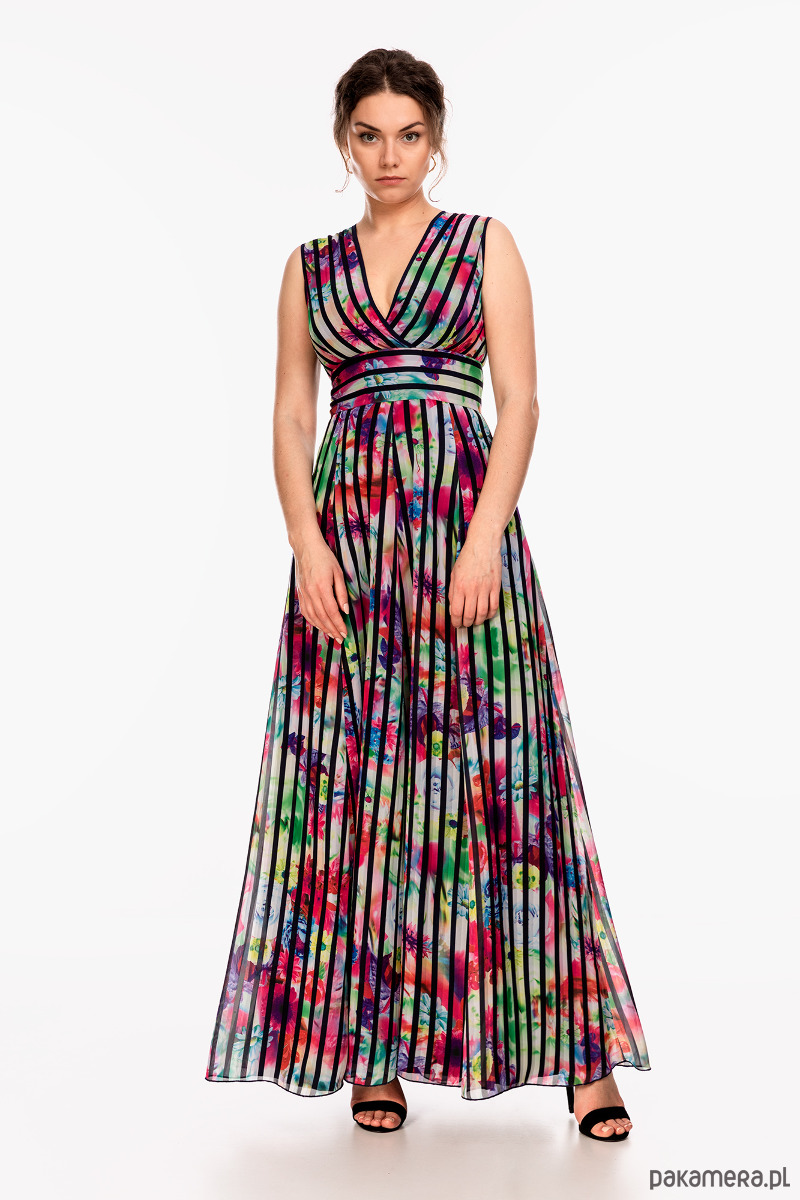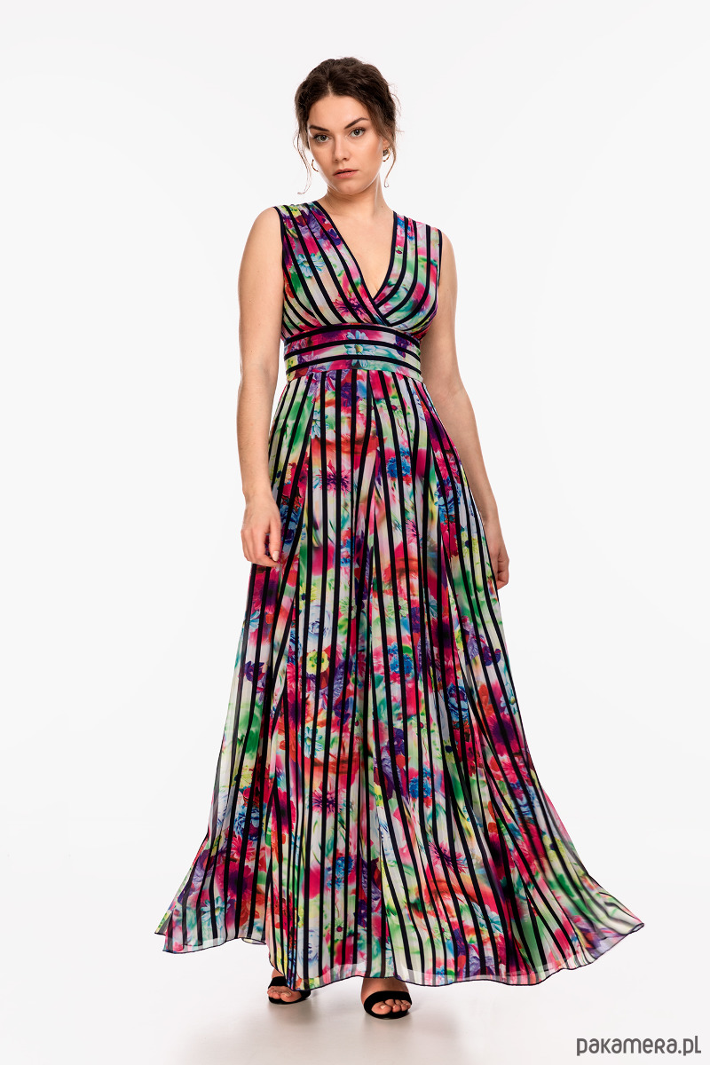 Letnia sukienka uszyta szyfonu, na podszewce. Tkaniny nie są elastyczne. Góra dopasowana z kopertowym dekoltem i szerokim pasem w talii, dół rozkloszowany, zamek kryty. Przed zakupem prosimy o dokładne zmierzenie sylwetki. Modelka na zdjęciu ma 178 cm.