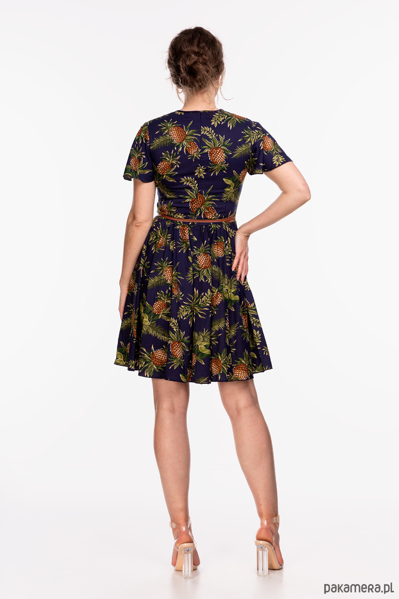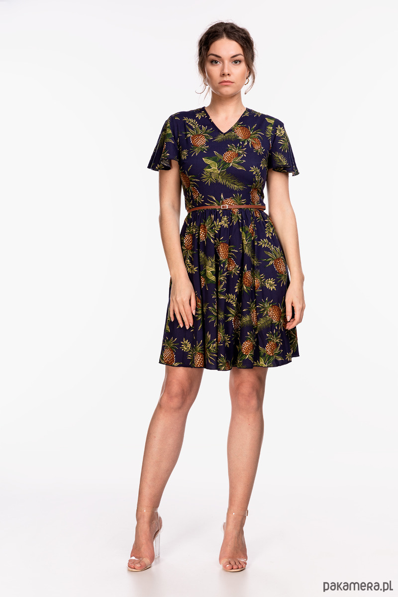 Sukienka uszyta wysokiej jakości tkaniny wiskozowej 100% w ananasy na granatowym tle. Góra dopasowana, krótkie i luźne rękawki, dół rozkloszowany troszkę przymarszczony, zamek kryty z tyłu, długość około 98 cm. W sprzedaży bez paska. Modelka na zdjęciu ma 178 cm. Przed zakupem prosimy o dokładne zmierzenie sylwetki.