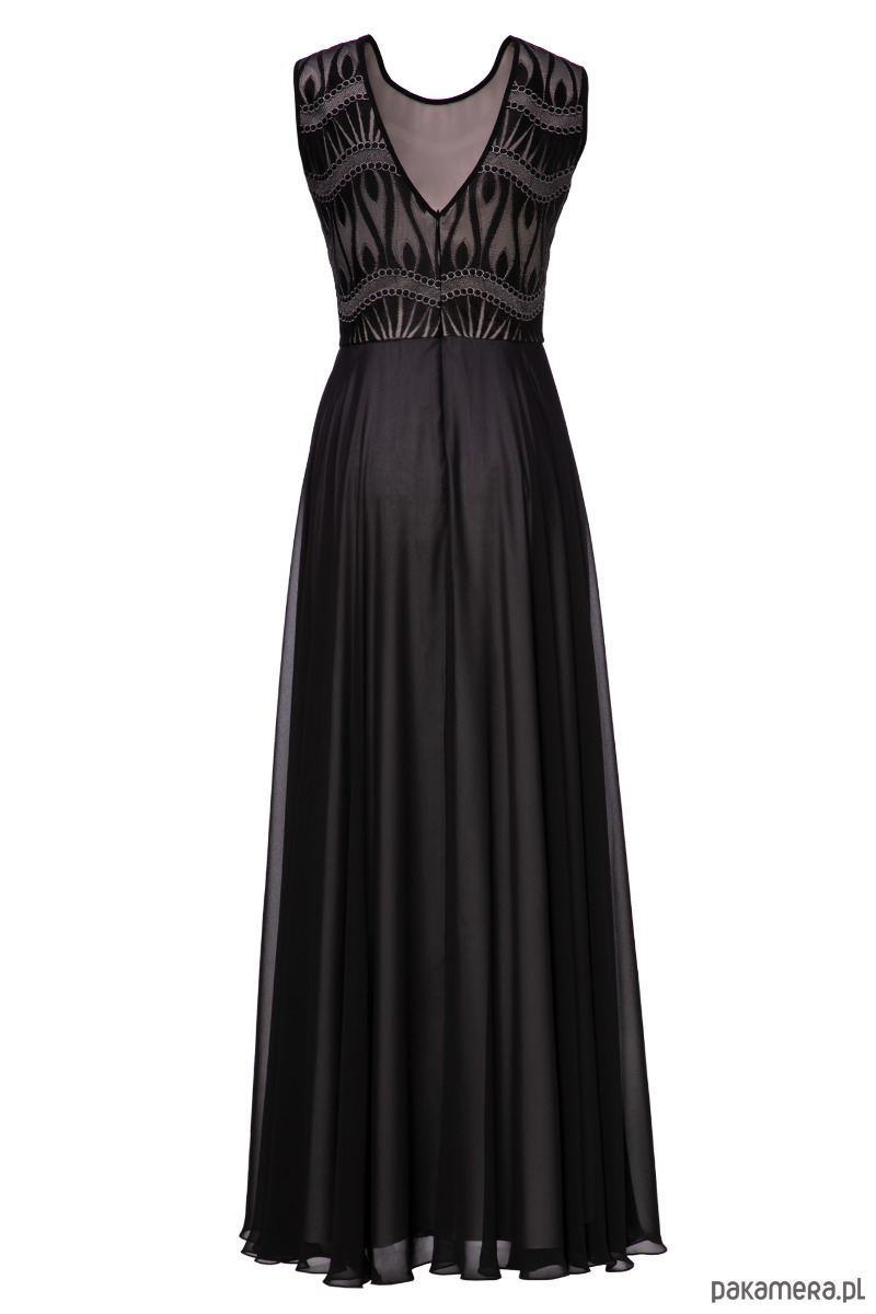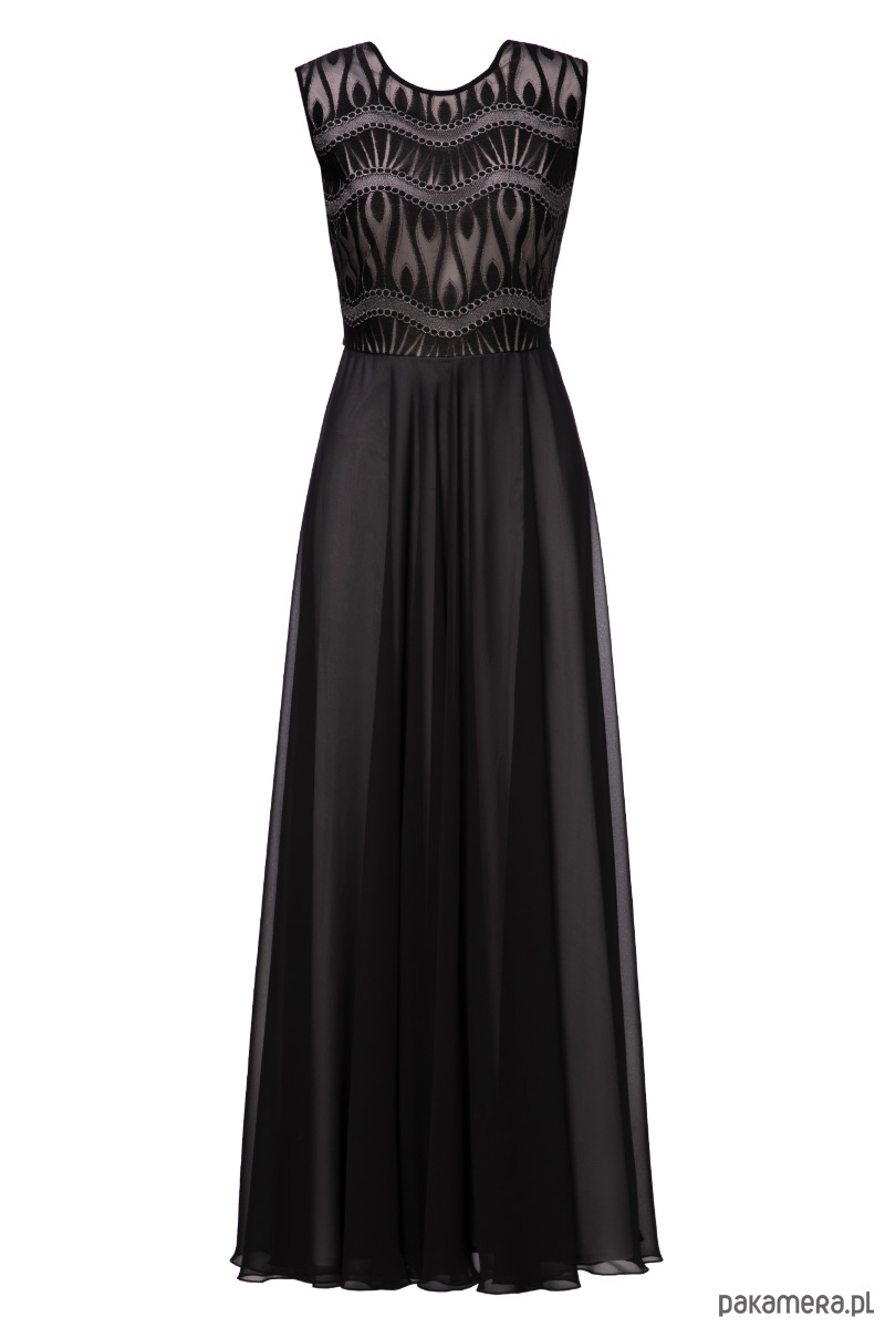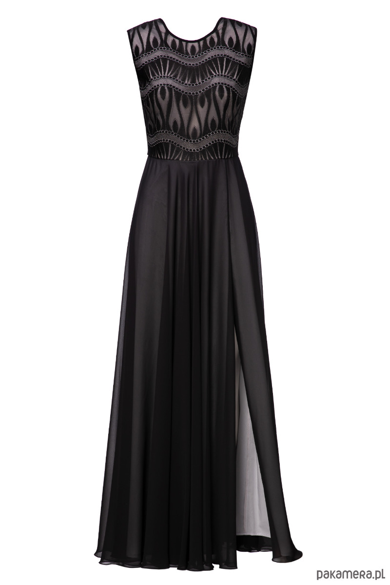 Sukienka uszyta czarno srebrnej koronki i szyfonu na szarej podszewce z bawełny. Materiał jest lejący i lekko elastyczny. Góra dopasowana z dekoltem na plecach. Dół rozkloszowany z rozcięciem na nodze, zamek kryty z tyłu. Długość około 115 cm od talii. Przed zakupem prosimy o dokładne zmierzenie sylwetki.