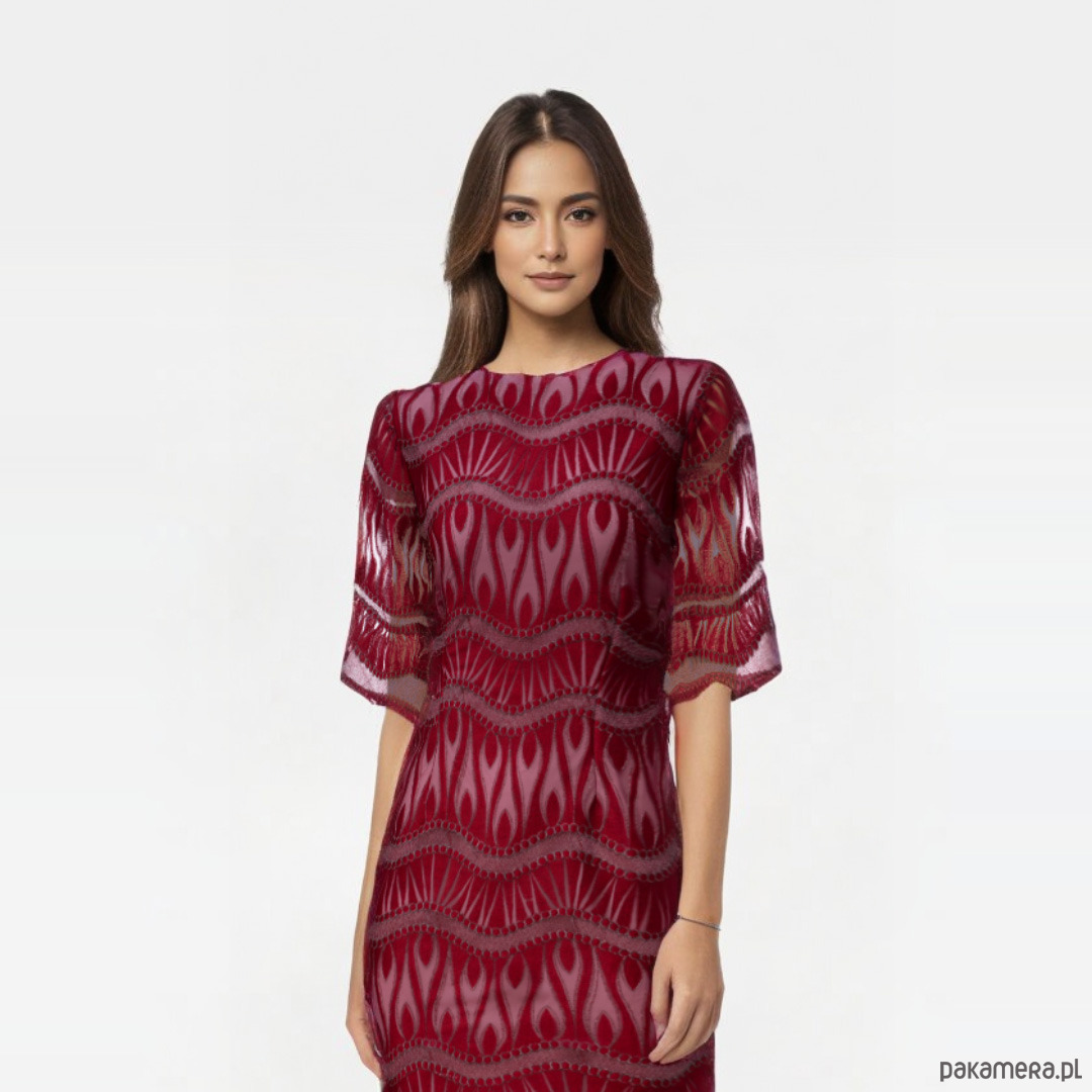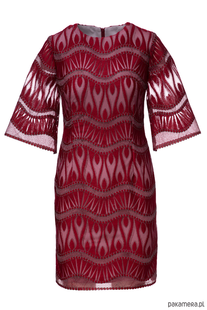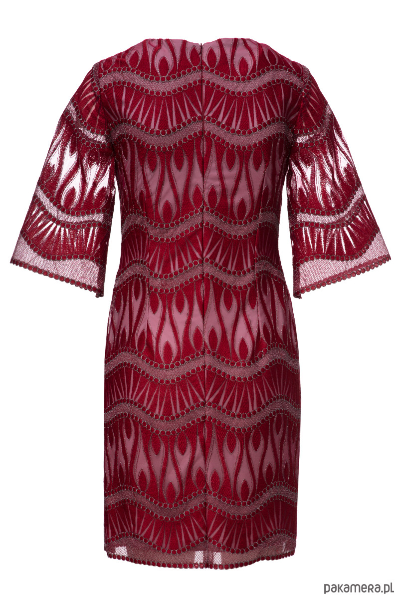 Sukienka uszyta z pięknej koronki w kolorze wina na szarej podszewce. Materiały są trochę sztywne, minimalnie elastyczne. Prosty fason lekko dopasowany zaszewkami na przodzie i tyle, poszerzone rękawy 3/4, zamek kryty z tyłu, długość około 94-97 cm w zależności od rozmiaru. Przed zakupem prosimy o dokładne zmierzenie sylwetki.