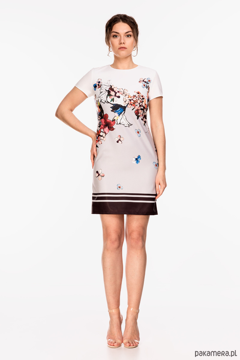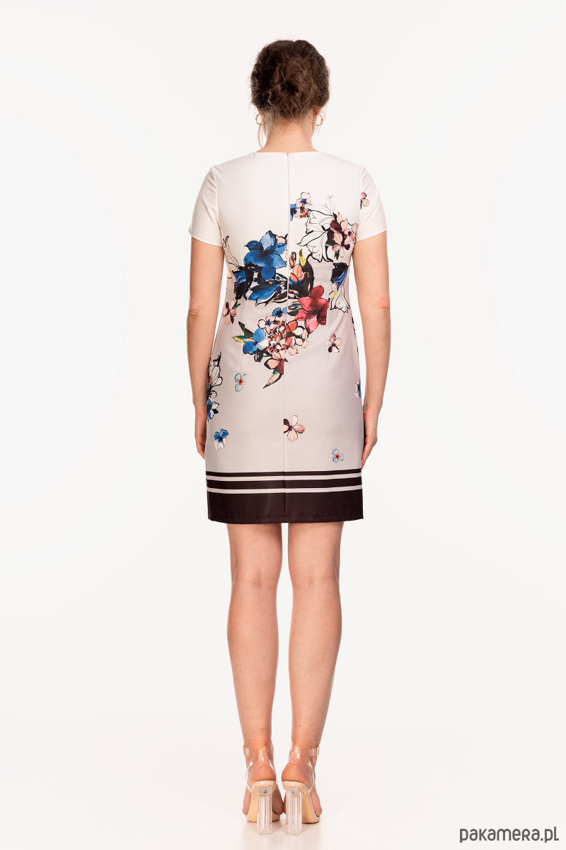 Sukienka uszyta z pięknej tkaniny wiskoza z poliestrem na bawełnianej podszewce. Materiały są minimalnie leastyczne. Prosty fason lekko dopasowany zaszewkami na tyle, zamek kryty z tyłu, długość około 92-95 cm w zależności od rozmiaru. Przed zakupem prosimy o dokładne zmierzenie sylwetki.