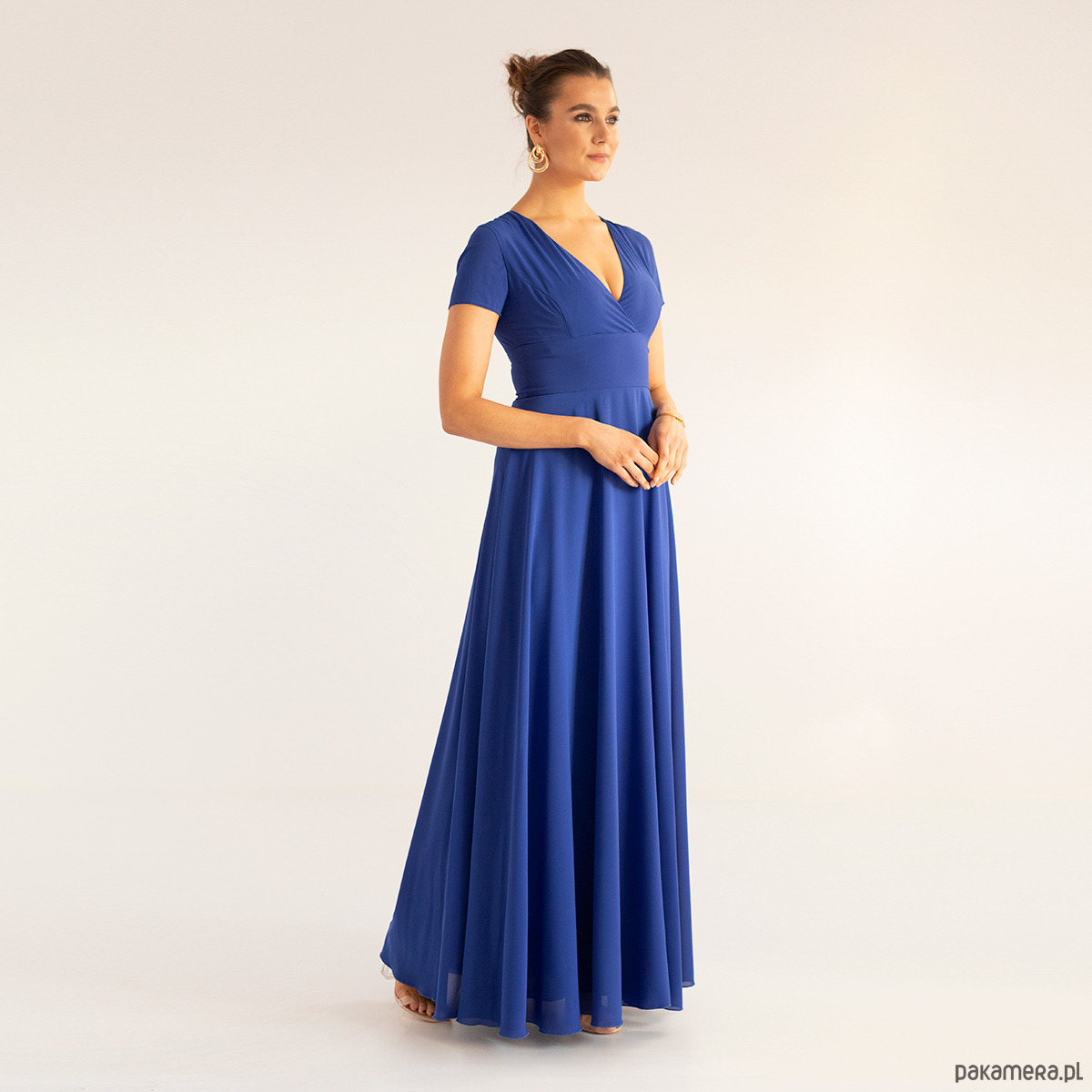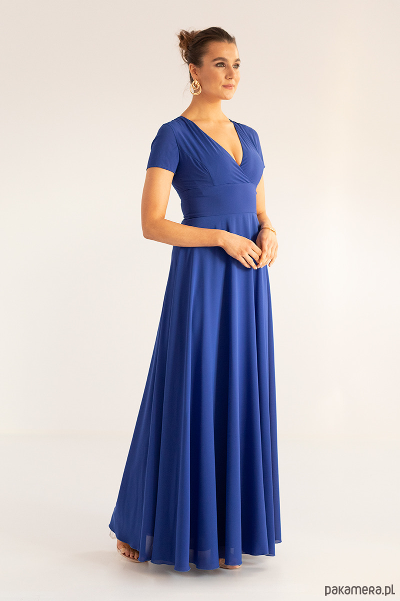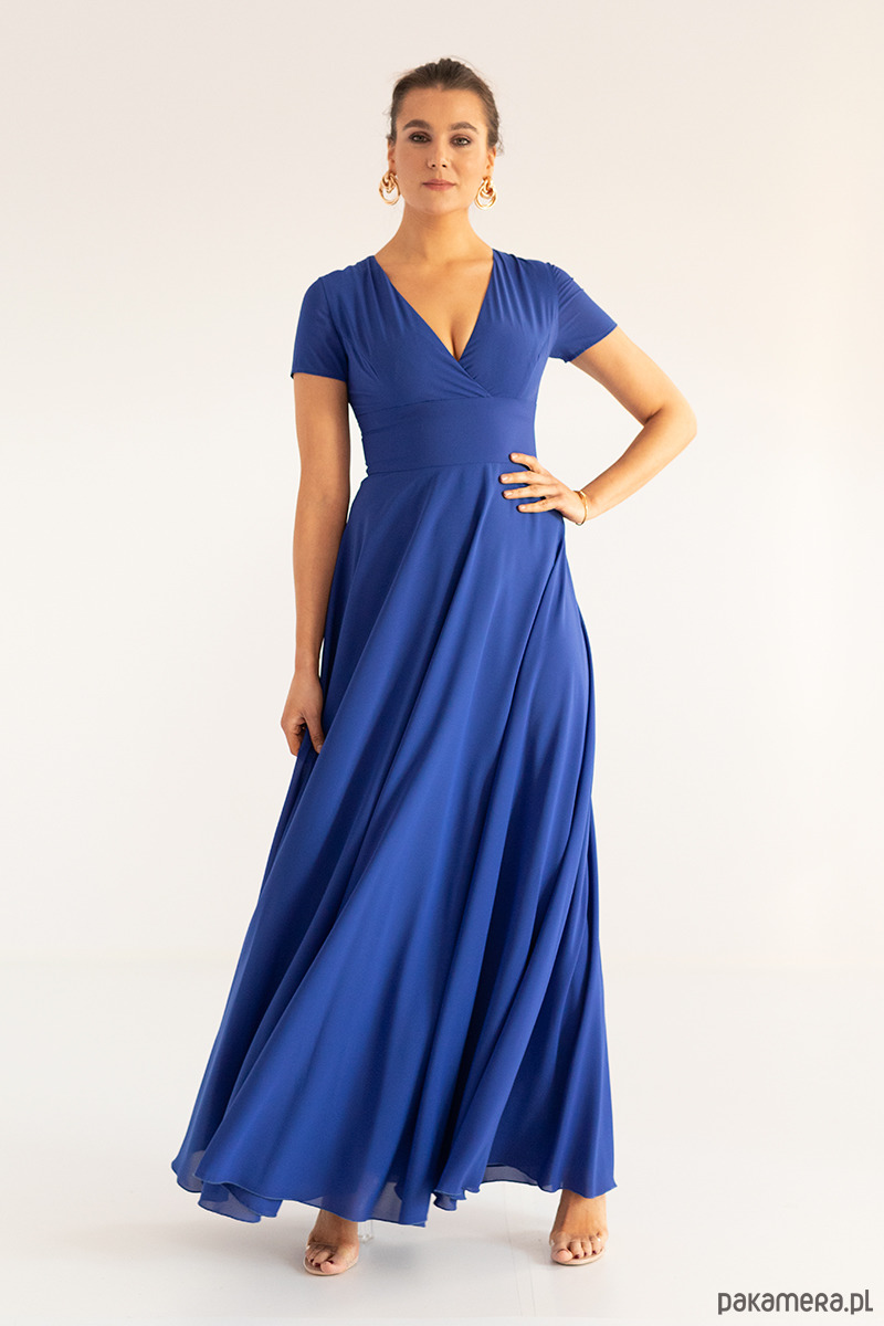 Sukienka uszyta niebieskiego szyfonu na podszewce. Materiał jest lejący, zwiewny i lekko elastyczny. Góra dopasowana z dekoltem kopertowym i pasem w talii, rękawki. Dół rozkloszowany , zamek kryty z tyłu. Długość około 115 cm od talii. Modelka na zdjęciu ma 180 cm. Przed zakupem prosimy o dokładne zmierzenie sylwetki.