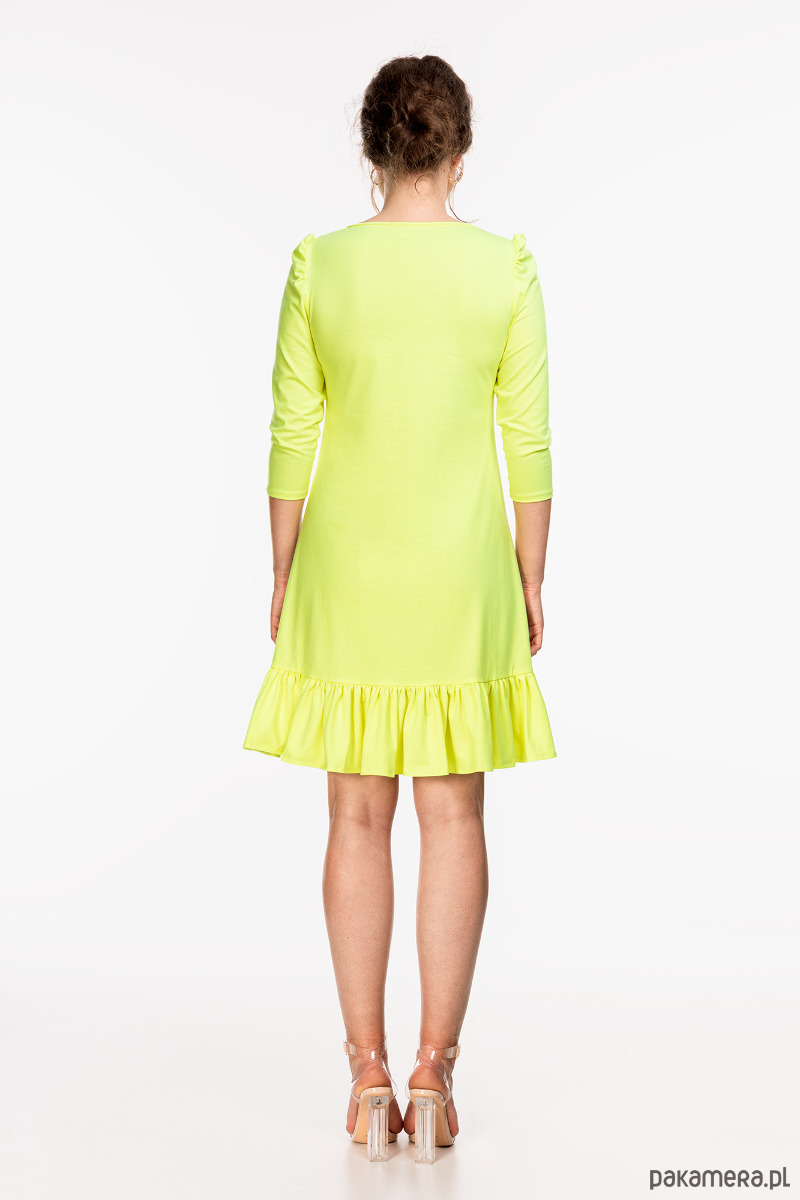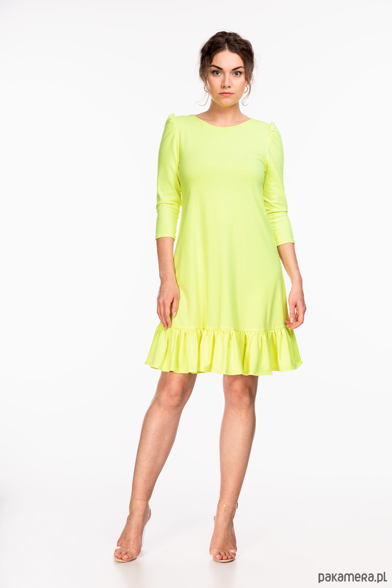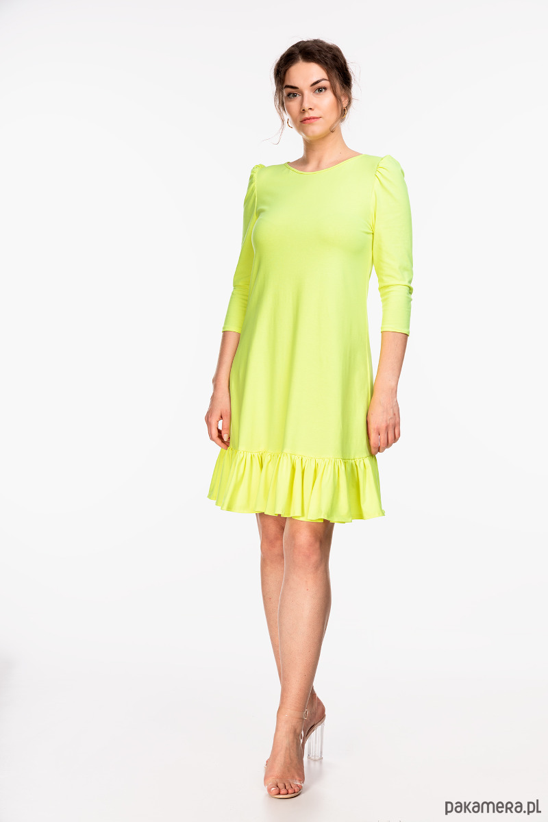 Sukienka uszyta z cienkiej dzianiny bawełnianej w kolorze zółto-zielonym. Materiał jest elastyczny, oddychający i miły w dotyku. Fason lekko rozkloszowany ku dołowi z luźną talią, falbanką na dole i rękawkami z bufkami. Długość około 100 cm. Talia i biodra z luzem. Przed zakupem prosimy o dokładne zmierzenie sylwetki. Modelka ma 178 cm.