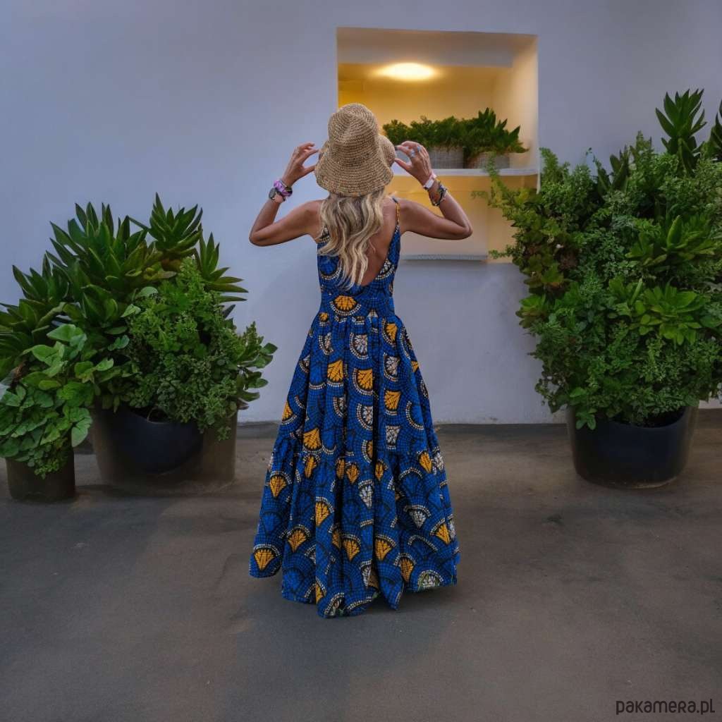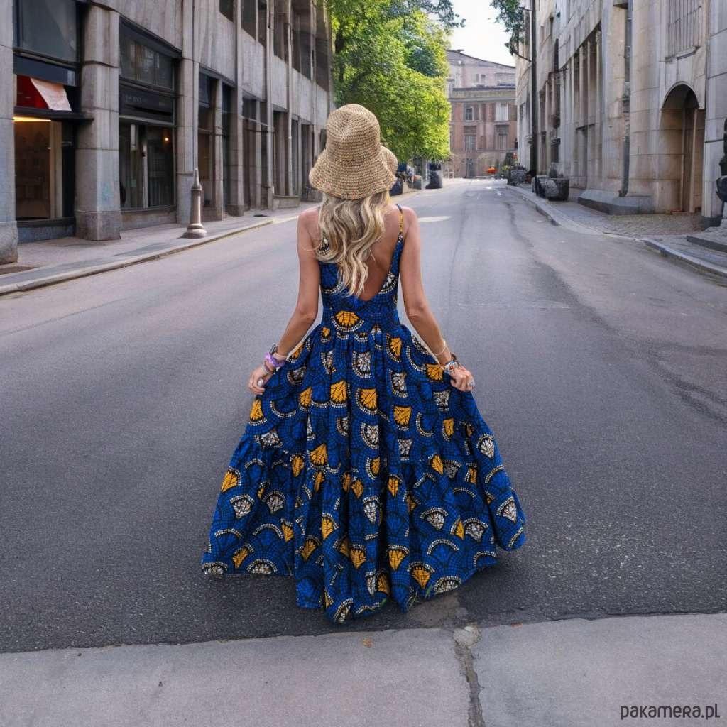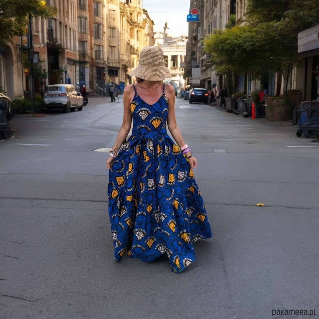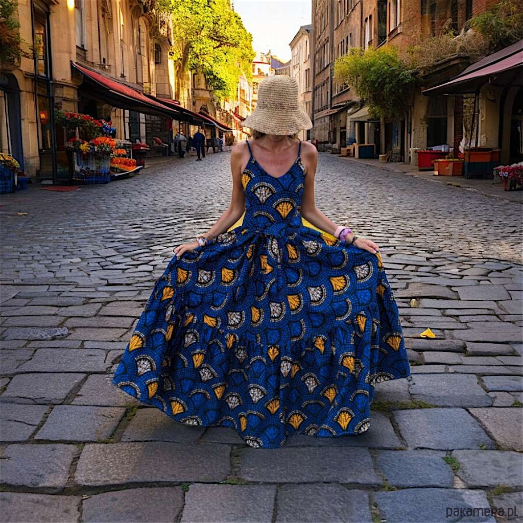 Długa sukienka rozkloszowana uszyta z afrykańskiej tkaniny.