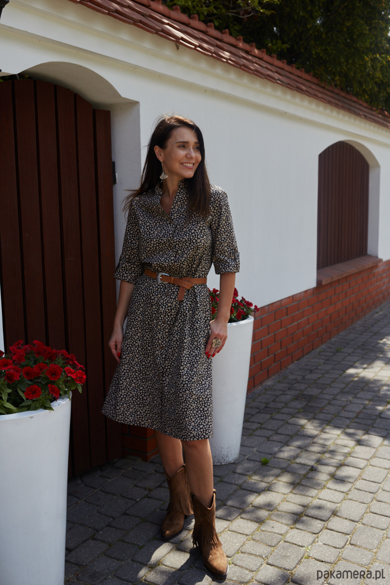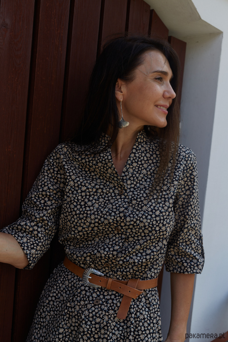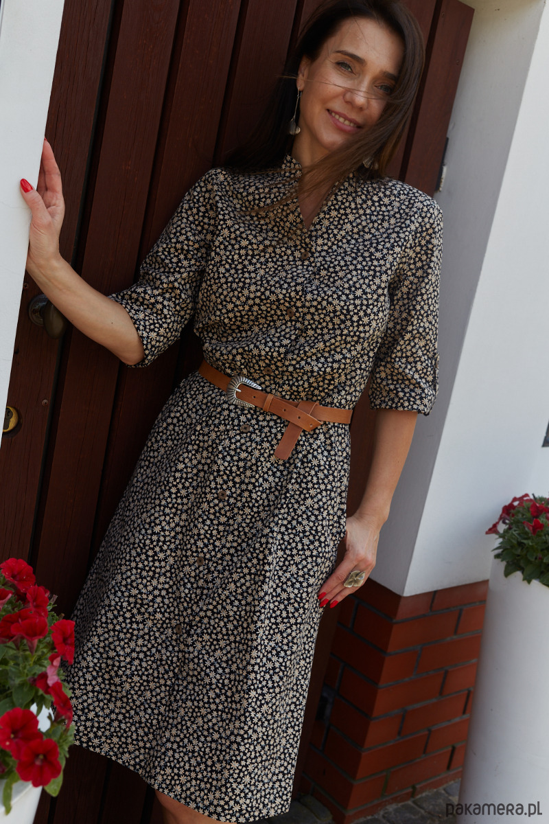 Wiosenno/letnia, bardzo kobieca sukienka wykonana z bawełny dodatkiem elastanu w kolorze czarnym w delikatne kwiatuszki w kolorach beżu, posiada rękaw 3/4 z możliwością podwinięcia. Sukienka o długości za kolano, w pasie wiązana paskiem. Posiada kieszenie. Fason od pasa lekko rozkloszowany. Alla to niezwykle uniwersalna sukienka, która sprawdza się w wielu odsłonach. Wystarczy, że założysz szpilki, a usta posmarujesz czerwoną szminką, by stworzyć elegancką stylizację. Z kolei trampki i kurtka jeansowa nadadzą sukience codziennego charakteru. Jeżeli szukasz ponadczasowej sukienki, która zachwyca w każdej wersji, jest to model właśnie dla Ciebie. Sukienka występuje w trzech rozmiarach: S, M i L. Uszyta jest w kameralnej pracowni na warszawskiej Pradze. Do kompletu pasek w kolorze NIEBIESKIM.