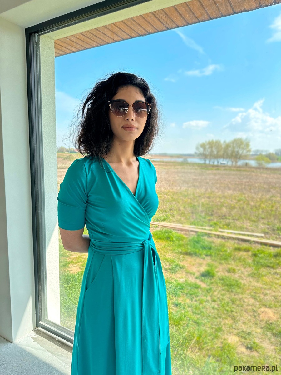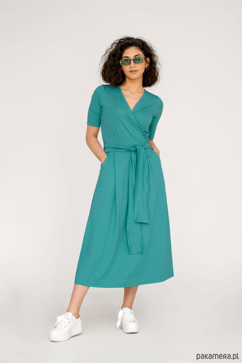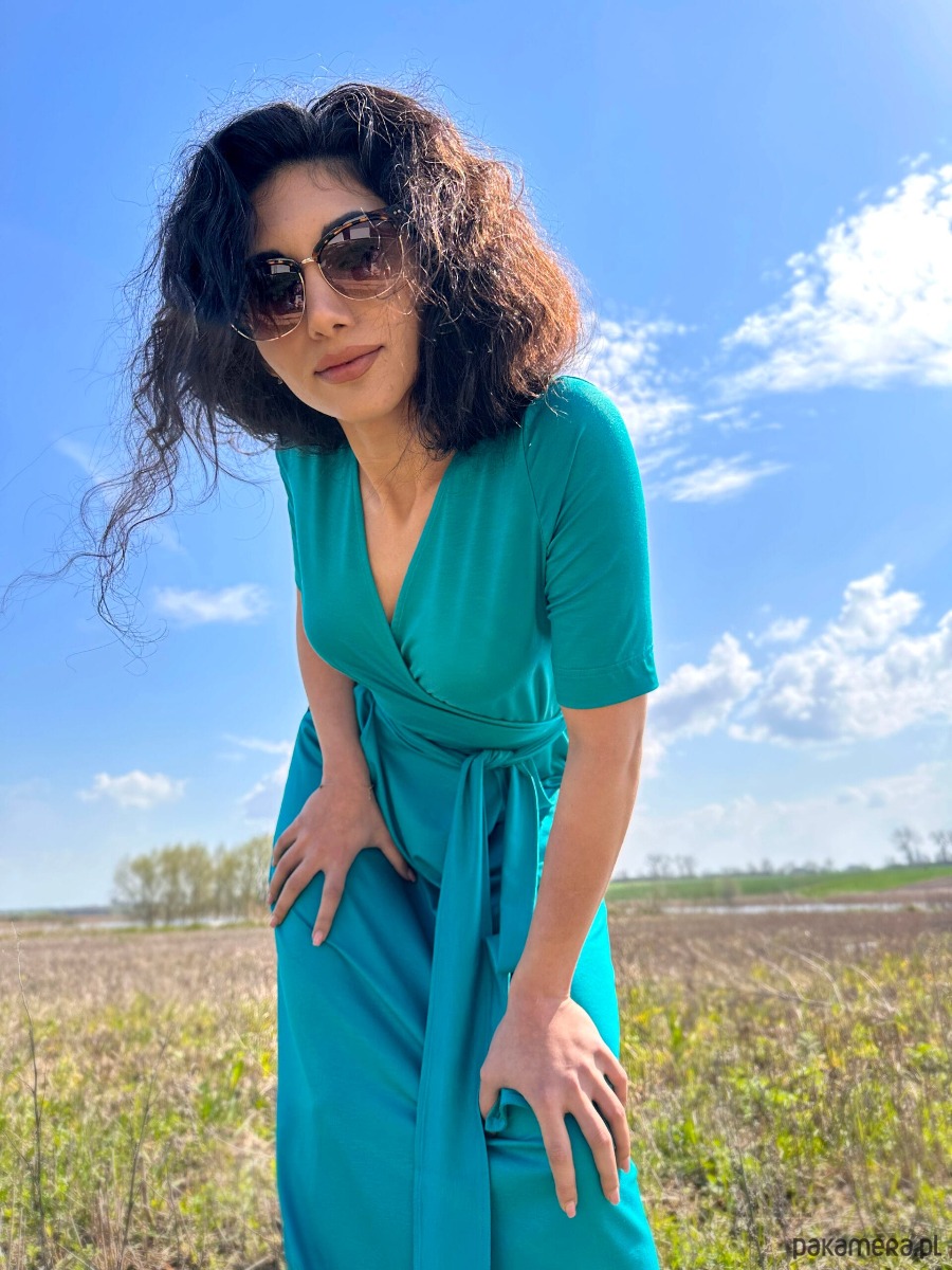 Amelia to sukienka z lekko dopasowaną, kopertową górą. Subtelnie podkreśla i modeluje biust niezależnie od jego rozmiaru.