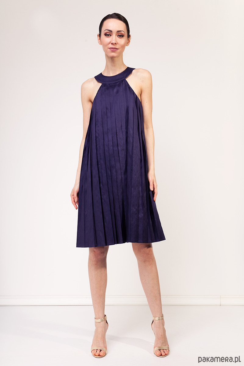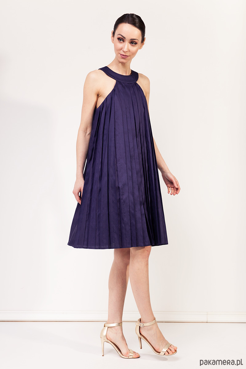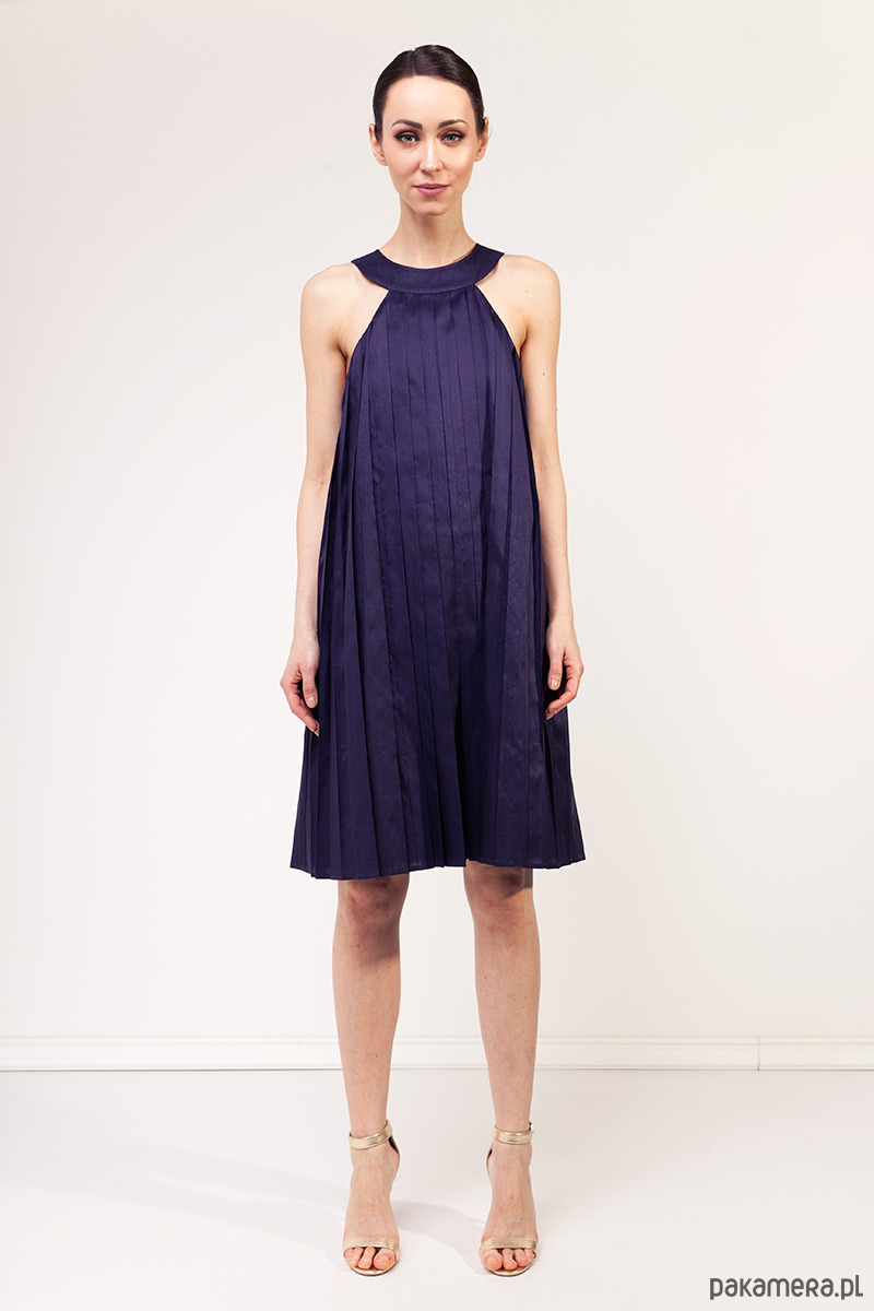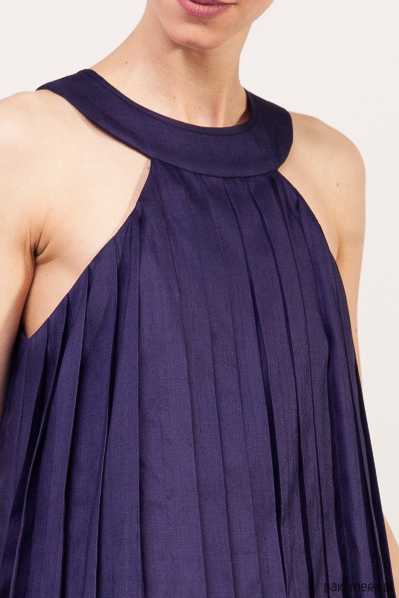 Ekskluzywna sukienka z kolekcji specjalnej uszytej na tajski tydzień mody. Wykonana z tajskiego, ręcznie tkanego jedwabiu królewskiego w kolorze fioletowym. Tkanina nie jest elastyczna. Fason z luźną talią i biodrami poszerzony ku dołowi. Góra lekko dopasowana, całość na wiskozowej podszewce. Tkanina wierzchnia jest ręcznie plisowana, zamek kryty z tyłu, długość około 100 cm.