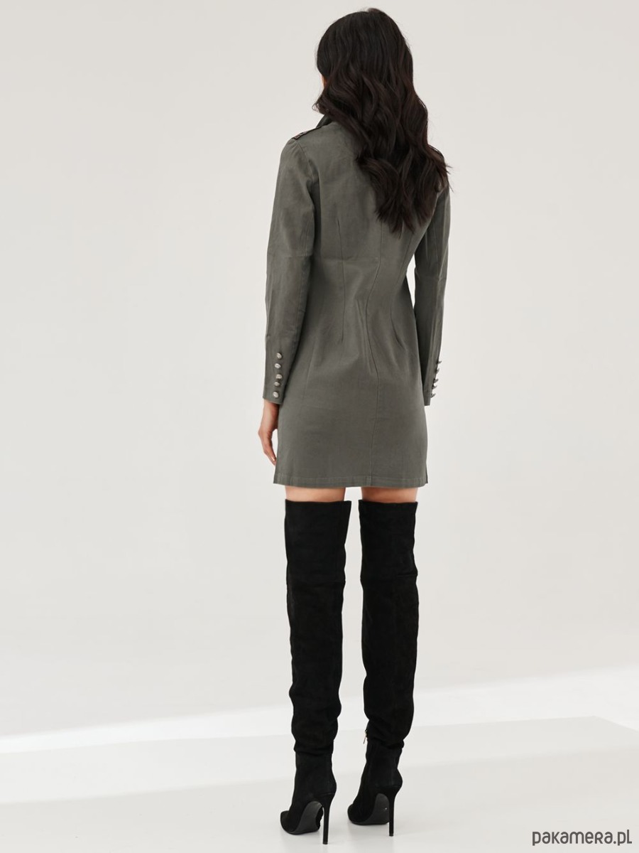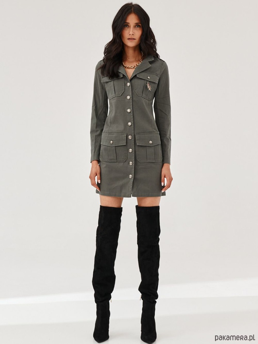 Sukienka ATENA z bawełnianej, mocno elastycznej tkaniny. Efekt lekkiego sprania. Zapinana na przodzie na guziki. Ozdobne kieszonki, hafty oraz odznaki. Sukienka doskonale sprawdzi się również jako płaszczyk.