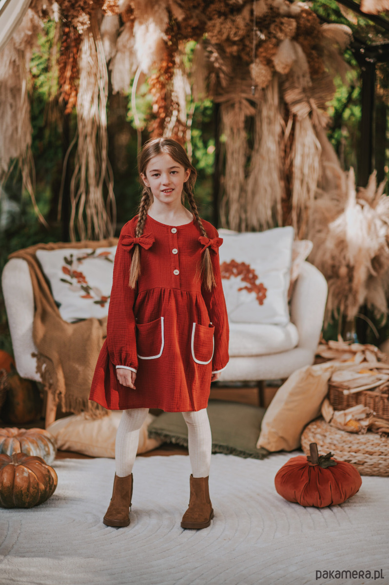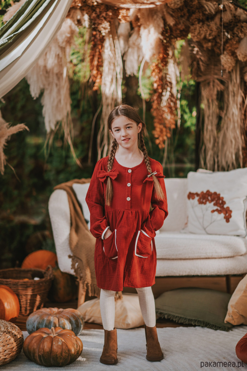 Muślinowa dziewczęca sukienka z uroczymi kieszonkami. Ozdobiona kremową lamówka. Z przodu zapinana na kokosowe guziki. Idealna na jesienne przygody!