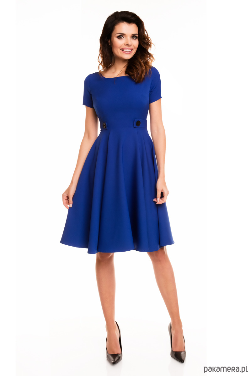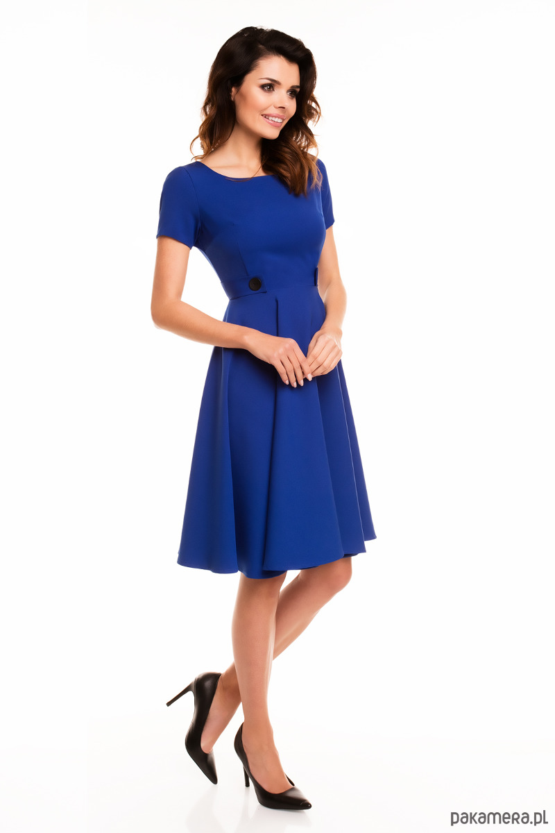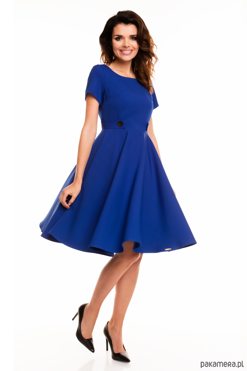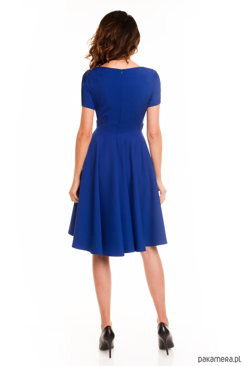 Rozkloszowana sukienka z krótkimi rękawami. Delikatnie rozszerza się ku dołowi.