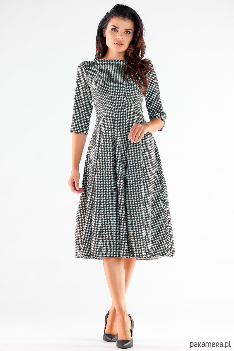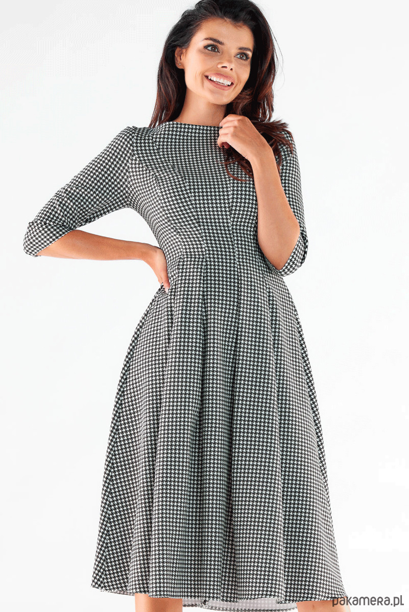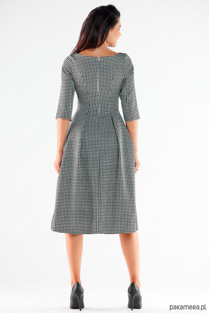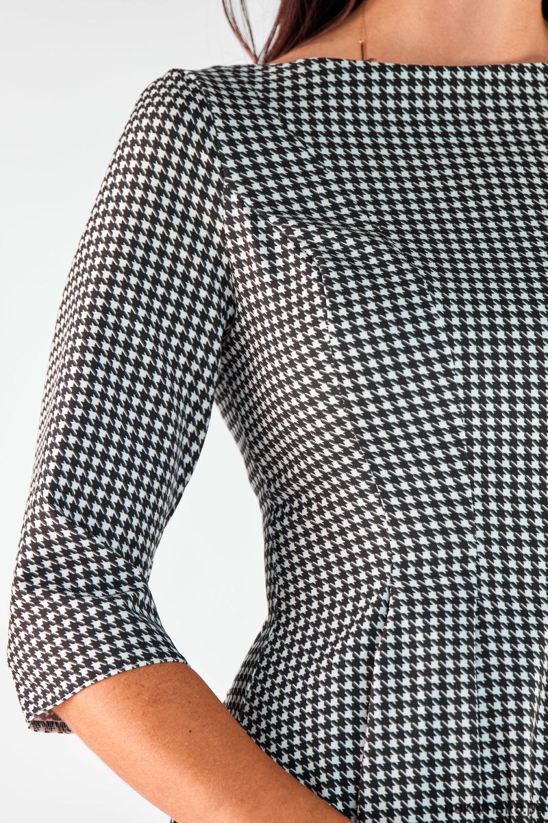 Zapięcie z tyłu – zamek kryty. Uszyta z tkaniny w modną pepitkę.