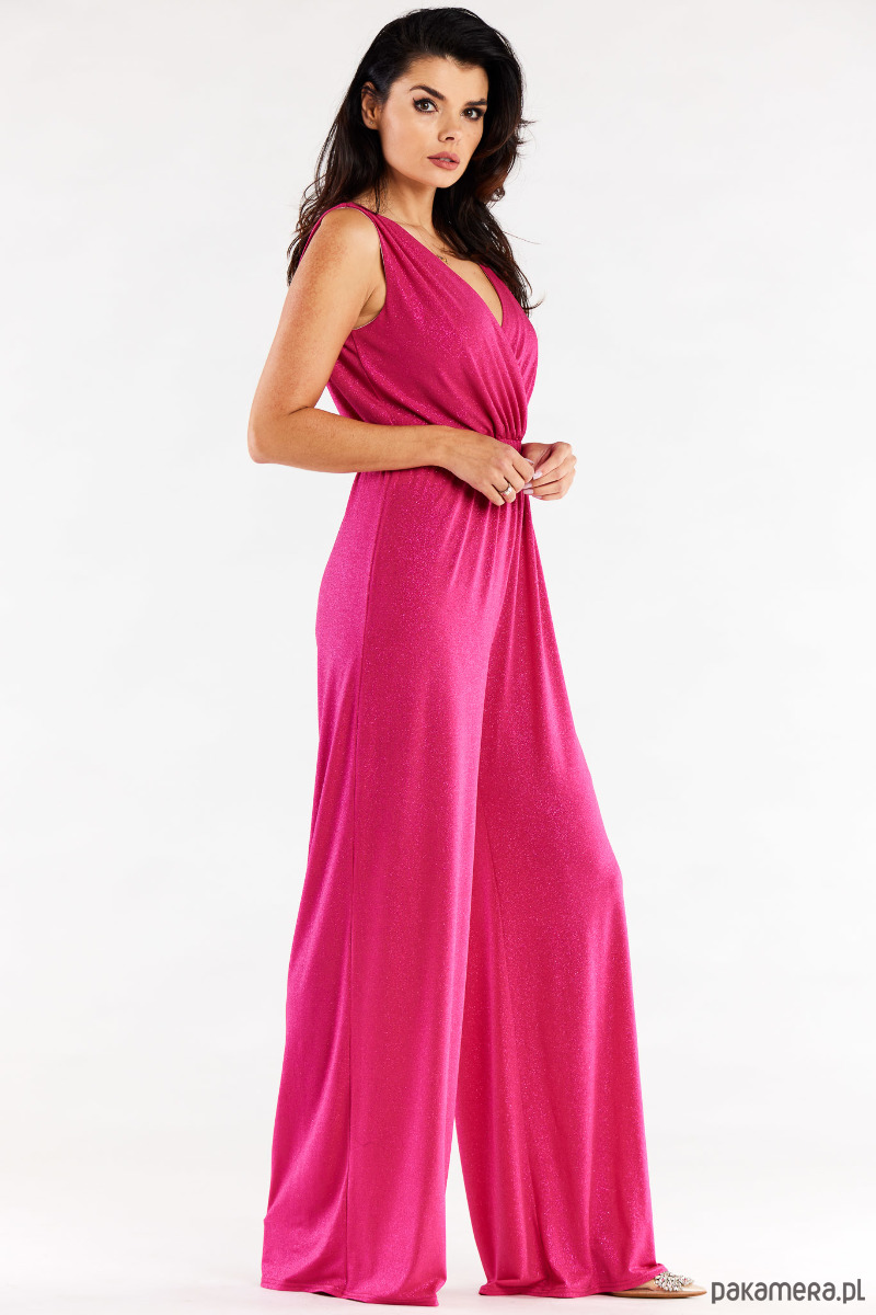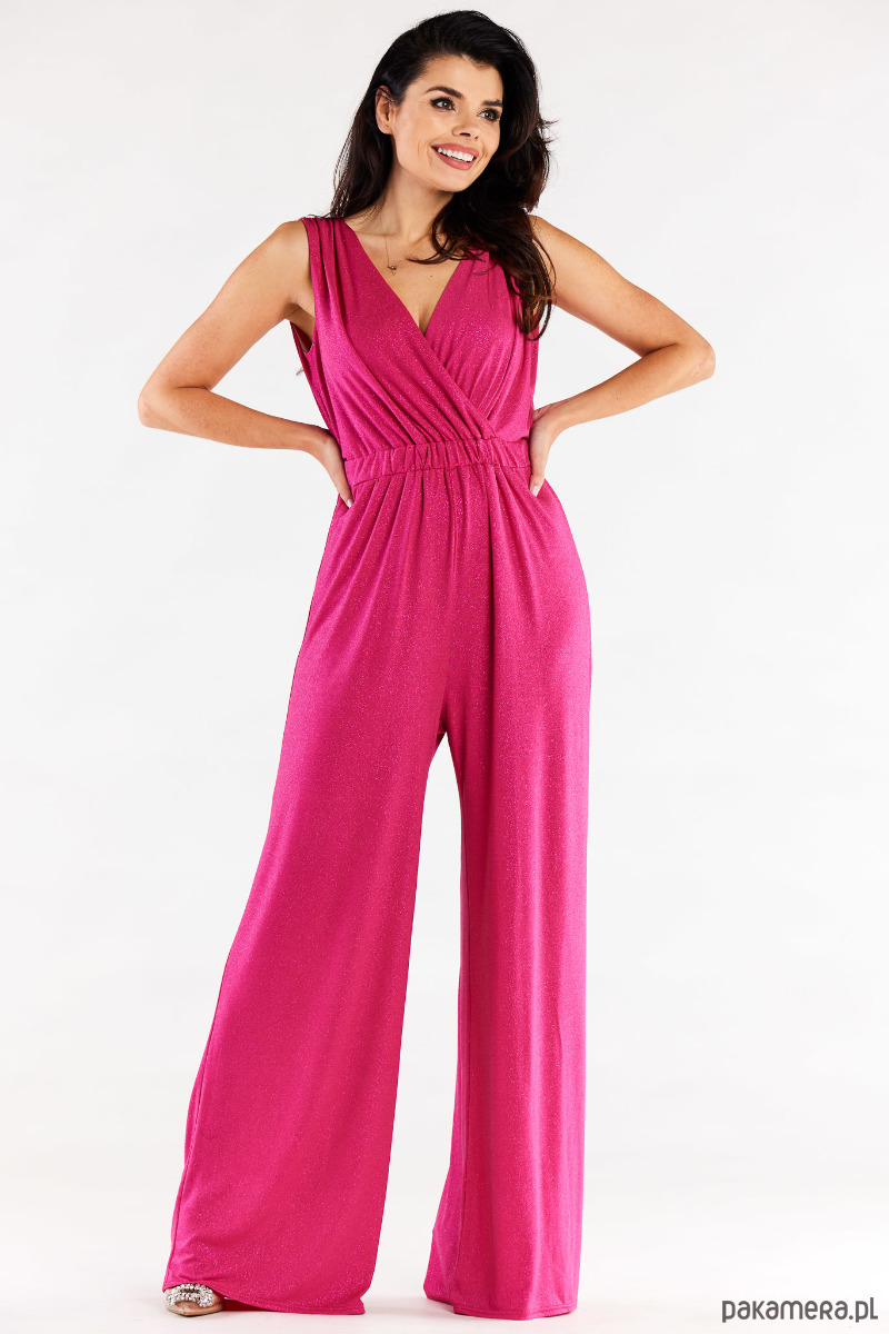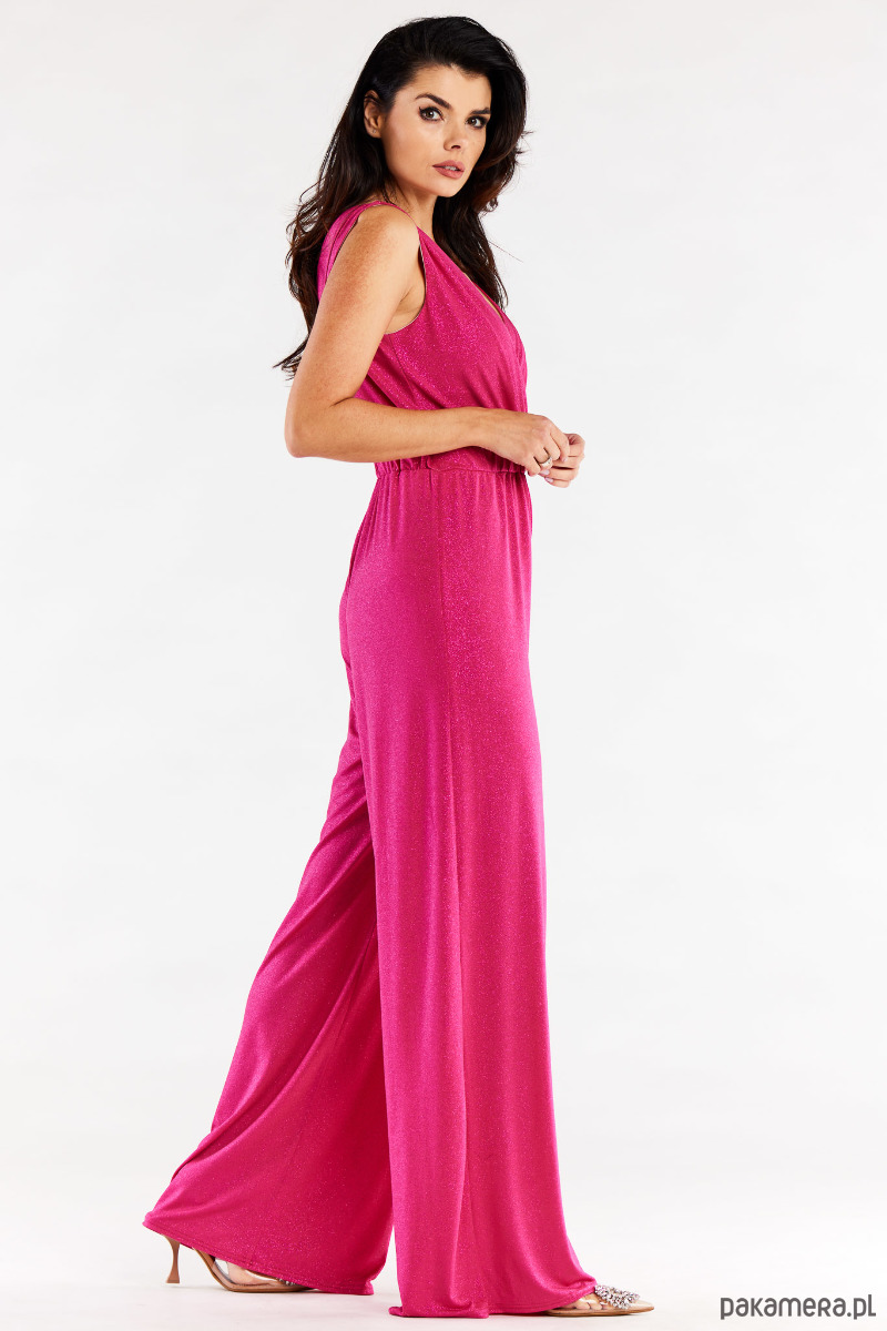 Kombinezon z szerokimi spodniami i kopertową górą, marszczony szeroką gumą w pasie.