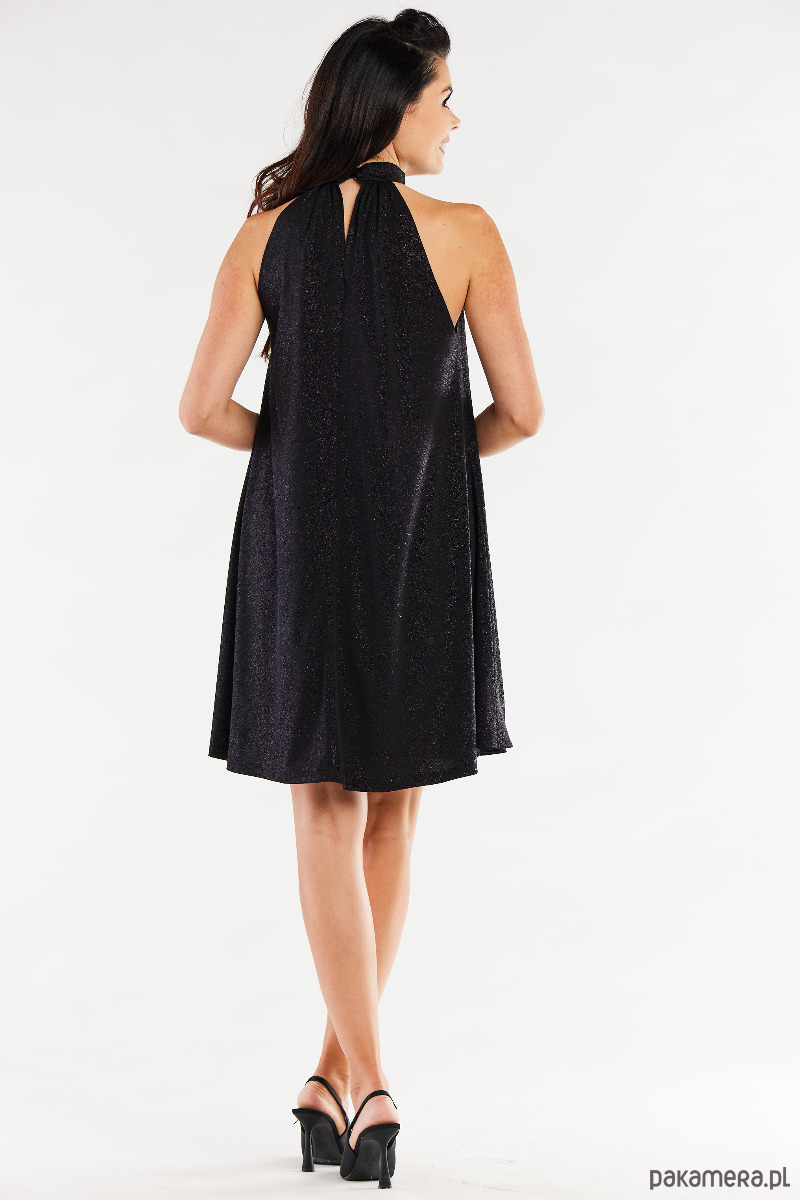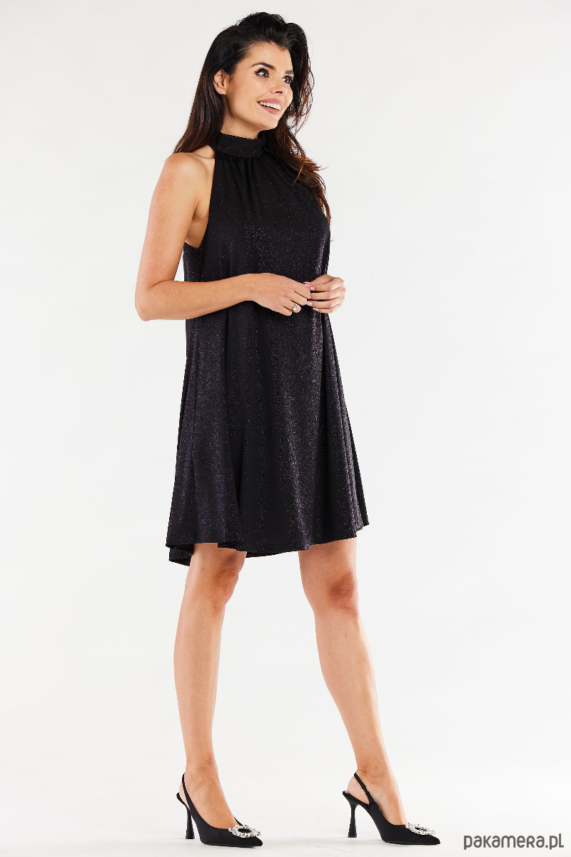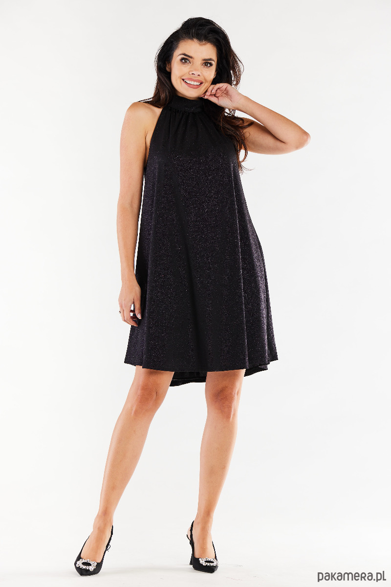Krótka, rozkloszowana sukienka z ozdobnym marszczeniem dekoltu, na stójce zapinanej na guziczek. Sukienka uszyta na elastycznej podszewce.