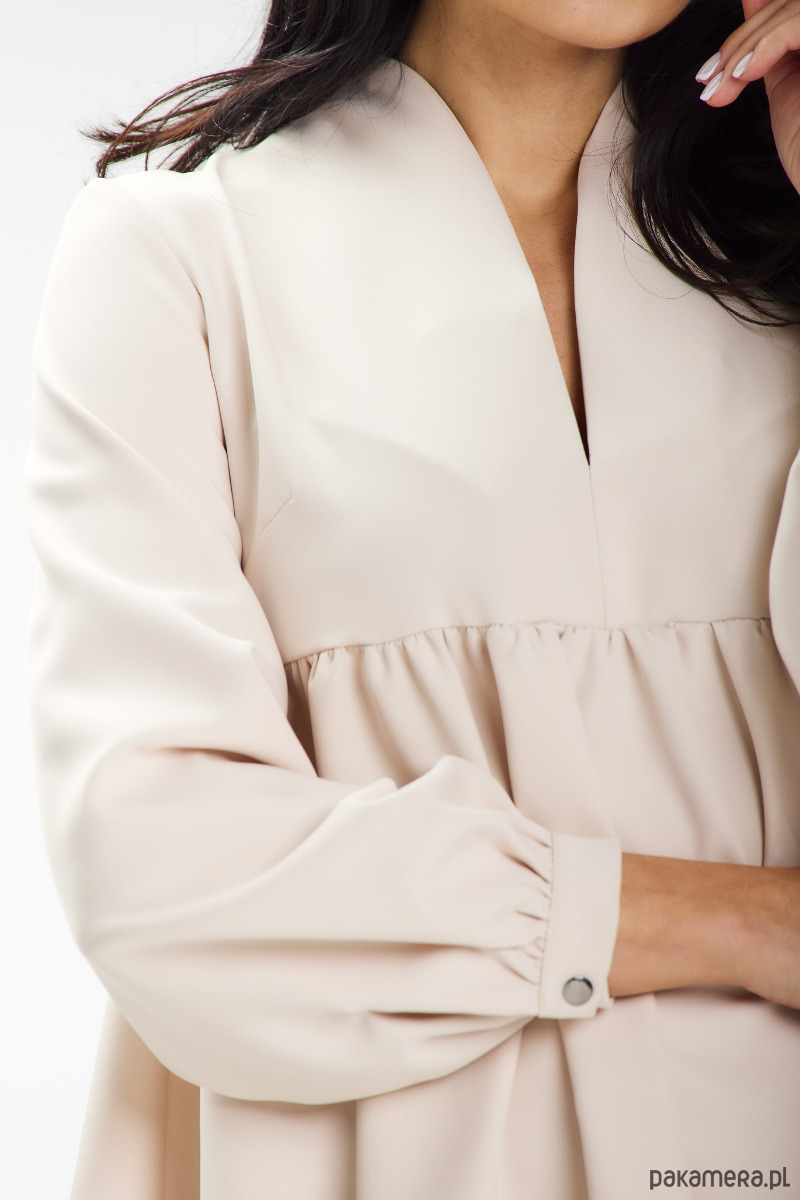 Model lekko dopasowany na górze, a na dole rozkloszowany.