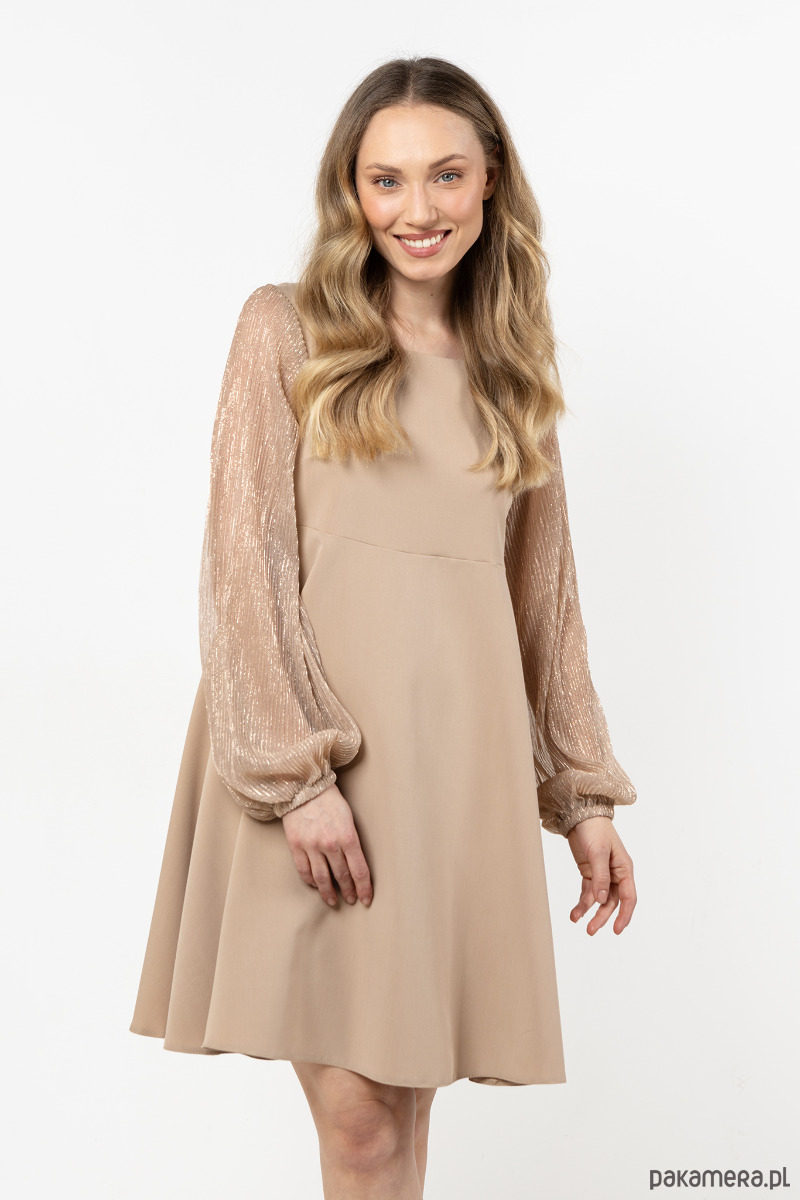 Ta sukienka to połączenie klasyki i luksusowego akcentu. Trapezowy krój zapewnia swobodę, a transparentne rękawy z tiulu z połyskiem dodają jej wyjątkowego charakteru. Kryty zamek gwarantuje idealne dopasowanie, podkreślając sylwetkę. Doskonała na eleganckie przyjęcia i uroczystości.