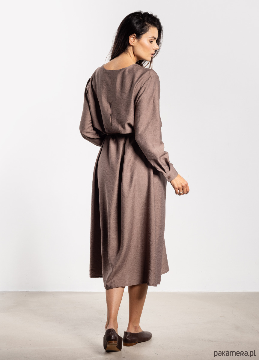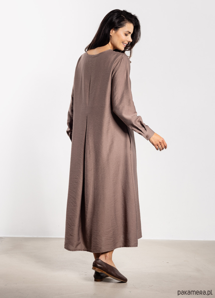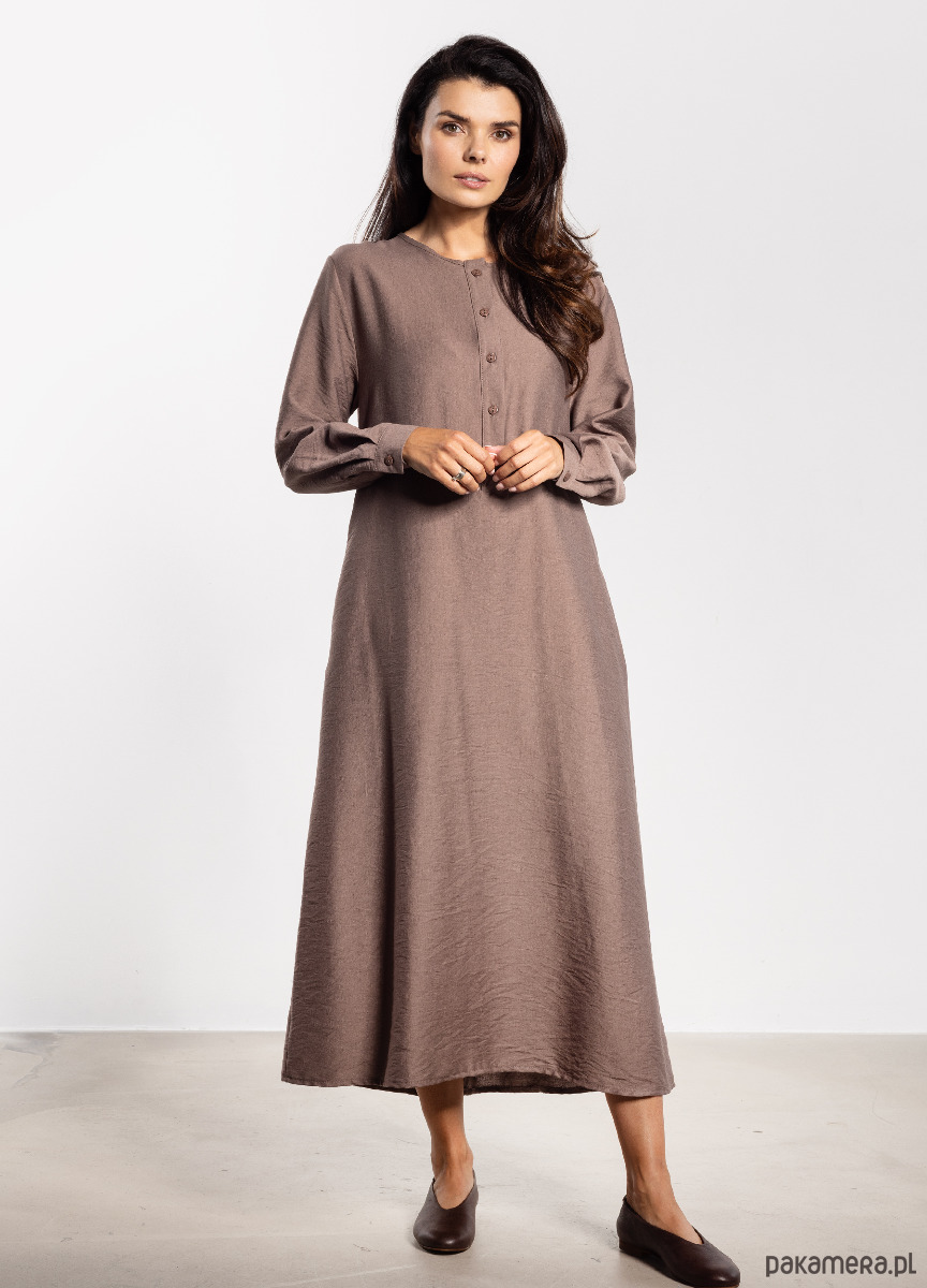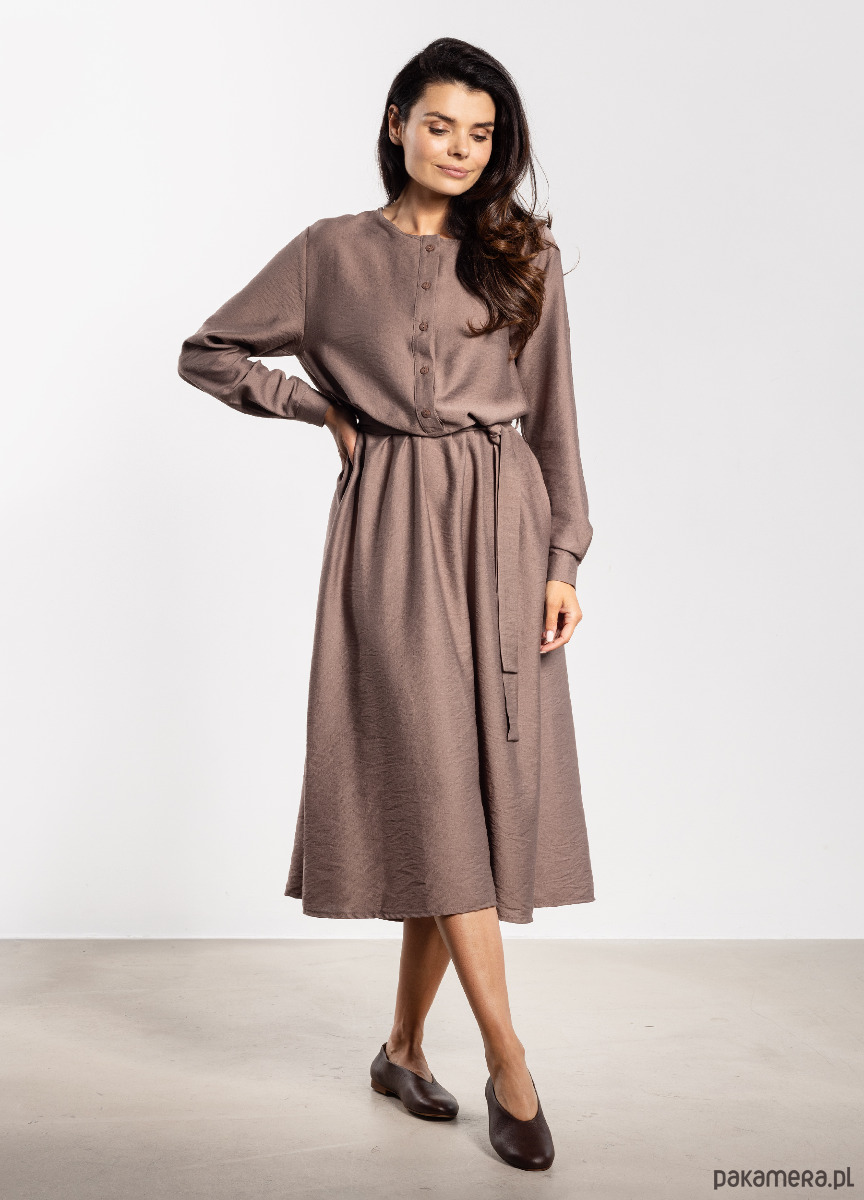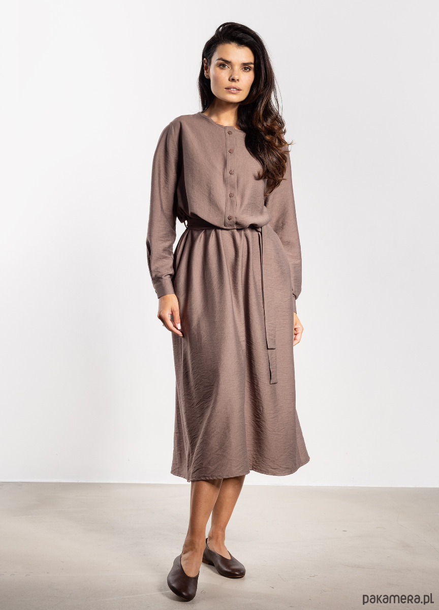 Sukienka maxi w fasonie A to idealny wybór dla kobiet ceniących prostotę i elegancję. Jej długość do kostek optycznie wysmukla sylwetkę, a luźny krój nadaje lekkości i nowoczesnego charakteru. Subtelny rząd guzików z przodu przełamuje minimalistyczną formę i dodaje całości uroku. Dołączony pasek z tego samego materiału pozwala nosić sukienkę na dwa sposoby – swobodnie lub przewiązaną w talii, by podkreślić kobiece kształty. Długie rękawy zakończone mankietami zapewniają wygodę i sprawiają, że model świetnie sprawdzi się zarówno w codziennych stylizacjach, jak i podczas bardziej eleganckich okazji.