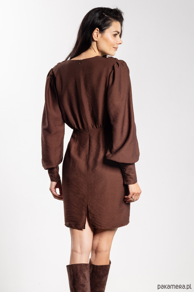 Ta kobieca sukienka mini to idealny wybór na wyjątkowe okazje, kiedy chcesz wyglądać zmysłowo i stylowo. Dopasowana góra z głębokim dekoltem w kształcie litery V podkreśla biust i wysmukla sylwetkę, a delikatne marszczenie w talii dodaje proporcji i elegancji. Atutem są długie, lekko bufiaste rękawy zakończone mankietami z guzikami – modny detal, który nadaje całości wyjątkowego charakteru. Krótsza długość eksponuje nogi i sprawia, że sukienka świetnie prezentuje się podczas wieczornych spotkań, przyjęć czy uroczystości wymagających efektownej stylizacji.