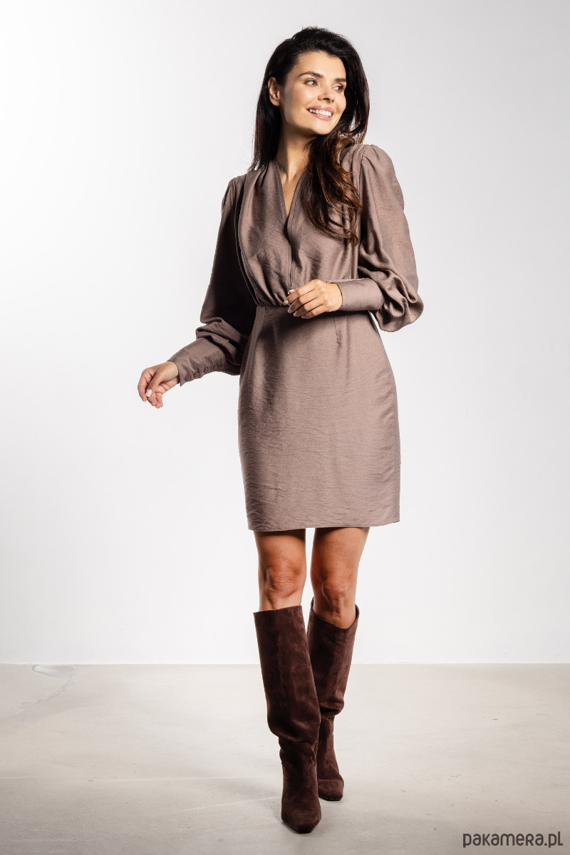 Ta kobieca sukienka mini to idealny wybór na wyjątkowe okazje, kiedy chcesz wyglądać zmysłowo i stylowo. Dopasowana góra z głębokim dekoltem w kształcie litery V podkreśla biust i wysmukla sylwetkę, a delikatne marszczenie w talii dodaje proporcji i elegancji. Atutem są długie, lekko bufiaste rękawy zakończone mankietami z guzikami – modny detal, który nadaje całości wyjątkowego charakteru. Krótsza długość eksponuje nogi i sprawia, że sukienka świetnie prezentuje się podczas wieczornych spotkań, przyjęć czy uroczystości wymagających efektownej stylizacji.