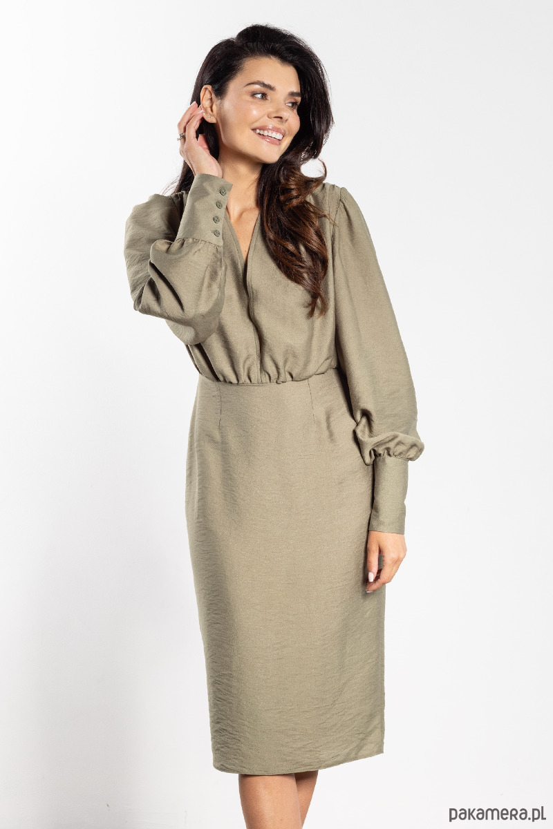 Ta elegancka sukienka midi to idealny wybór na wyjątkowe okazje. Głęboki dekolt w kształcie litery V subtelnie podkreśla linię biustu i wysmukla szyję, nadając stylizacji kobiecego uroku. Delikatne marszczenie w talii pięknie modeluje sylwetkę, a dopasowany, ołówkowy dół podkreśla jej klasyczny charakter. Długie bufiaste rękawy wykończone szerokimi mankietami przełamują prostotę fasonu, dodając mu lekkości i nowoczesnego akcentu. Długość sięgająca za kolano sprawia, że kreacja prezentuje się niezwykle szykownie i ponadczasowo.