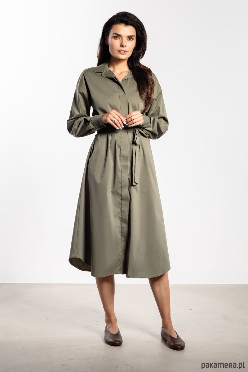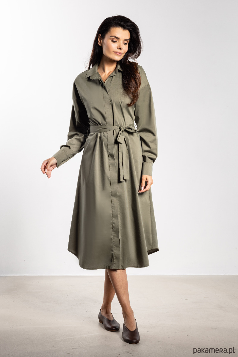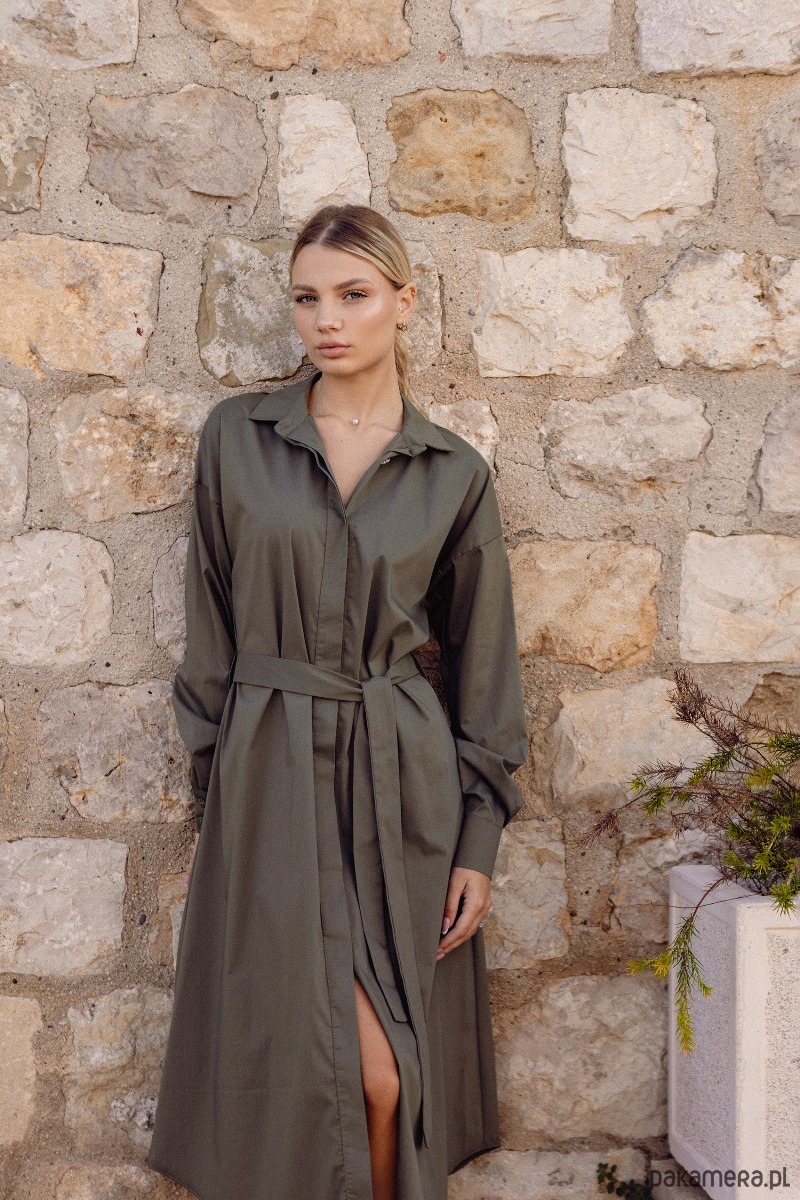 Sukienka midi w koszulowym stylu to uniwersalny model idealny na co dzień i na specjalne okazje. Klasyczny fason zapinany na guziki, z kołnierzykiem i długimi rękawami zakończonymi mankietami, prezentuje się niezwykle elegancko i ponadczasowo. Dołączony pasek z tego samego materiału pozwala nosić sukienkę na dwa sposoby – luźno lub przewiązaną w talii, podkreślając kobiecą sylwetkę. Długość midi sięgająca za kolano dodaje szyku, a komfortowy, przyjemny w dotyku materiał sprawia, że sukienka jest wygodna przez cały dzień. To model, który świetnie sprawdzi się w pracy, podczas spotkań rodzinnych czy wieczornych wyjść.
