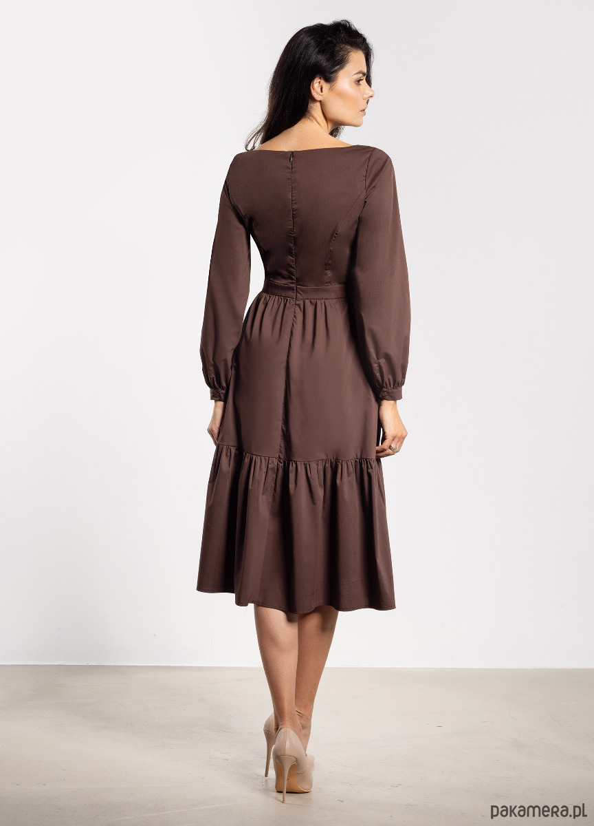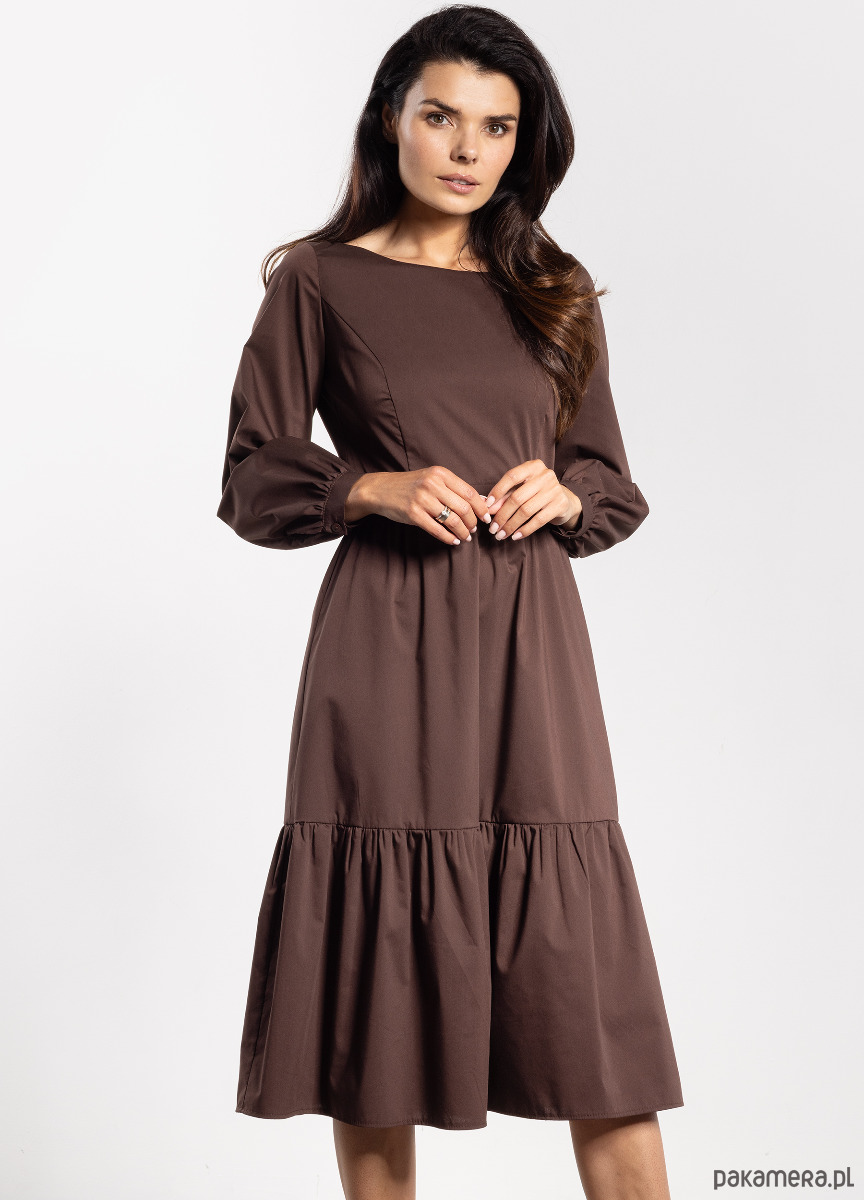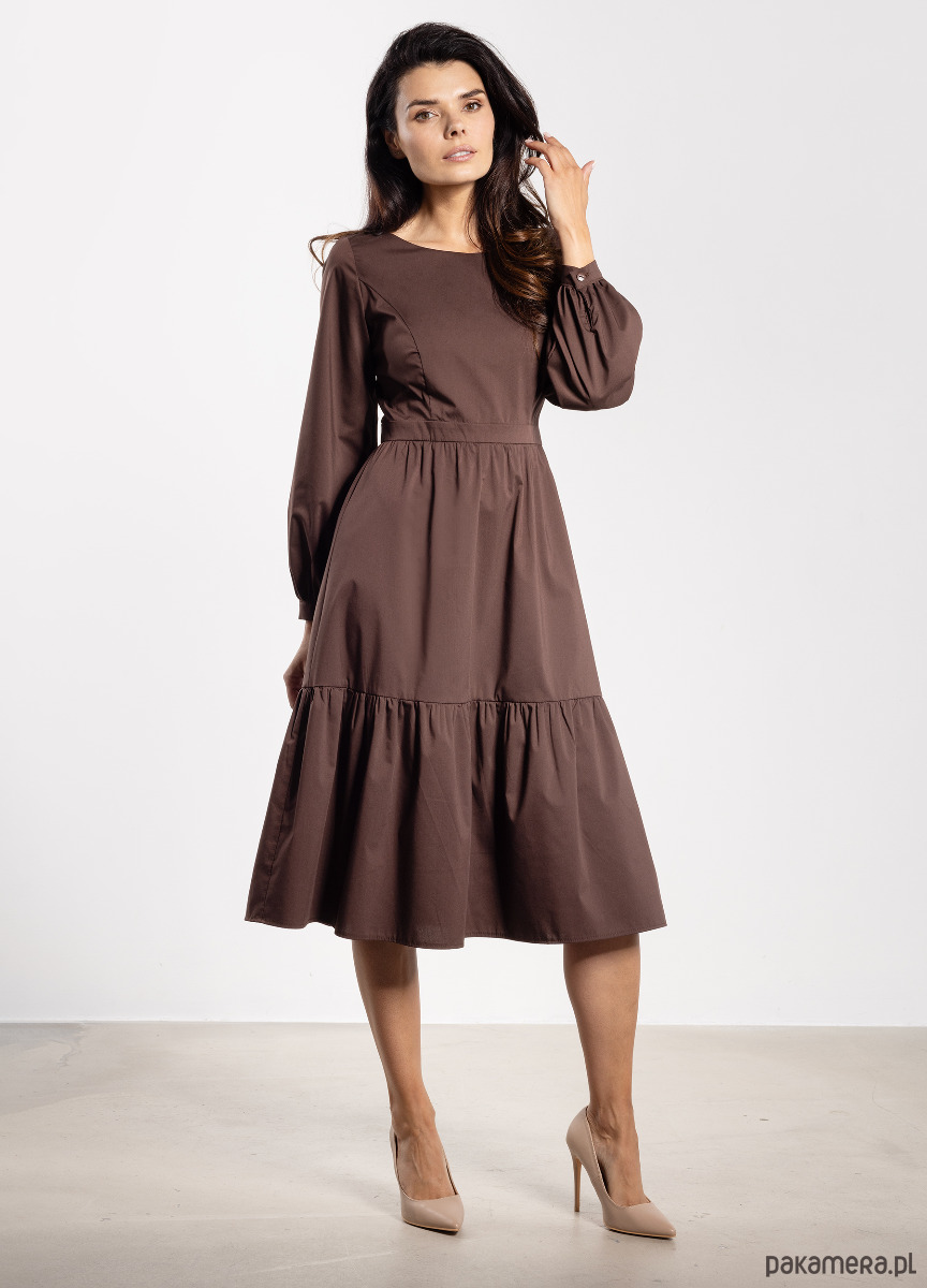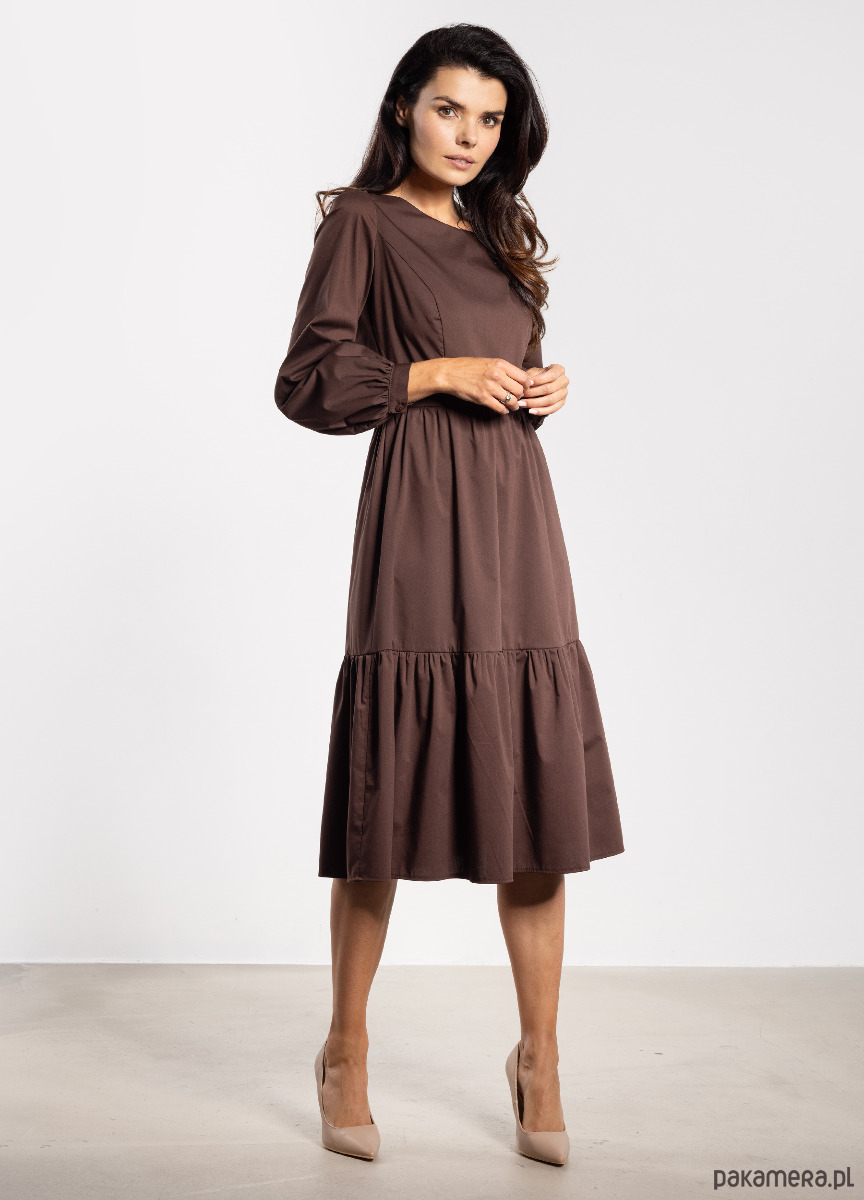 Ta sukienka midi łączy elegancję z kobiecym urokiem. Dopasowana góra i odcięcie w talii podkreślają sylwetkę, a rozkloszowany dół z szeroką falbaną dodaje lekkości i romantycznego charakteru. Długie rękawy zakończone mankietami z guzikiem wprowadzają subtelną elegancję, dzięki czemu sukienka sprawdzi się zarówno na co dzień, jak i podczas bardziej formalnych okazji. Długość midi gwarantuje uniwersalność, a przyjemny w dotyku materiał zapewnia komfort noszenia przez cały dzień. To model, który pięknie łączy kobiecy styl z wygodą i szykiem.