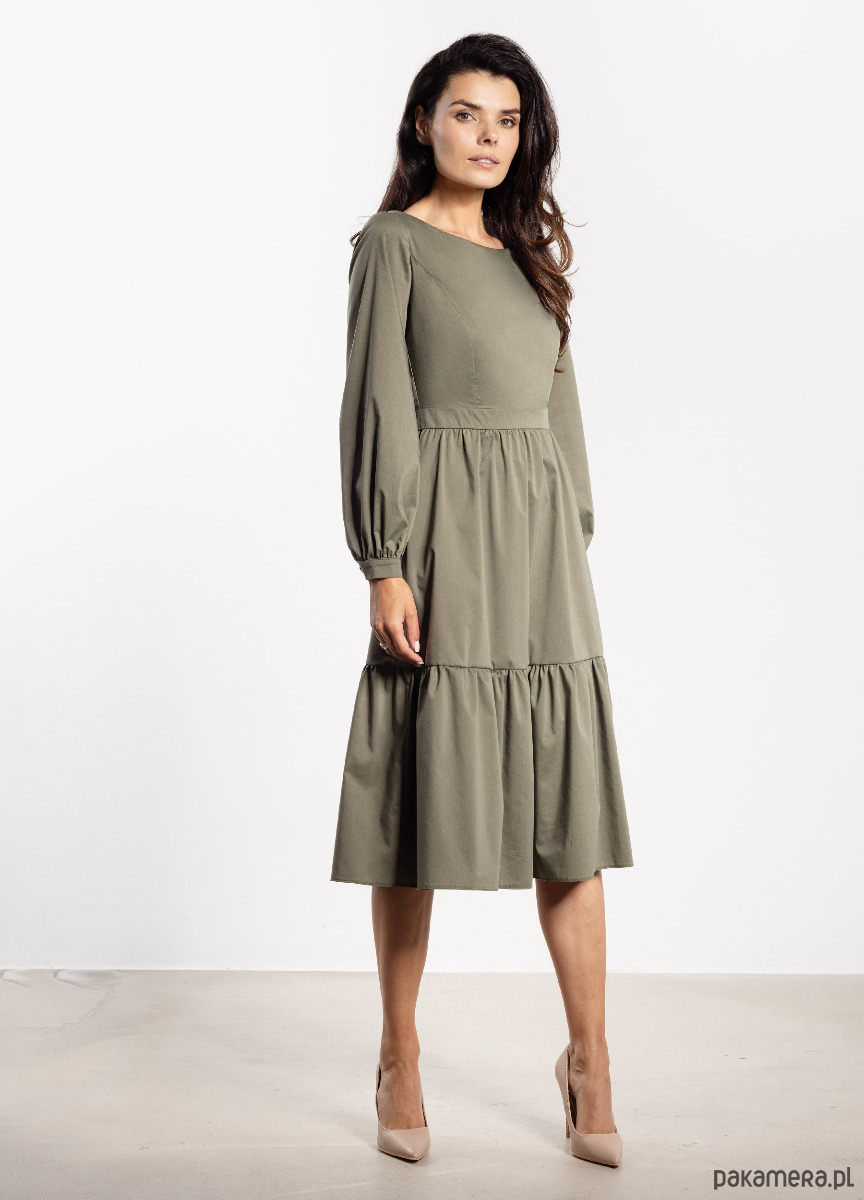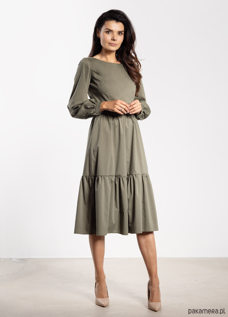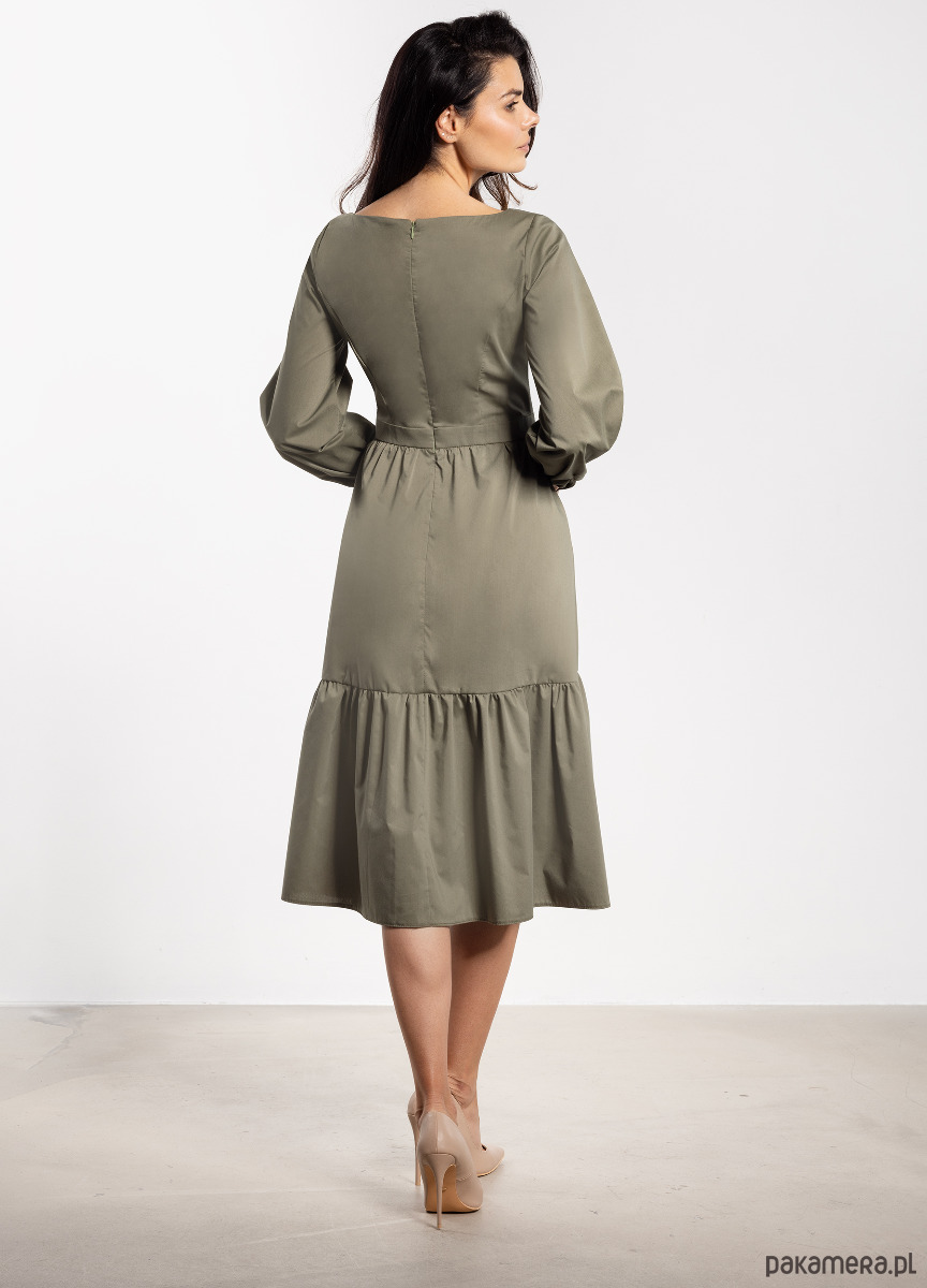 Ta sukienka midi łączy elegancję z kobiecym urokiem. Dopasowana góra i odcięcie w talii podkreślają sylwetkę, a rozkloszowany dół z szeroką falbaną dodaje lekkości i romantycznego charakteru. Długie rękawy zakończone mankietami z guzikiem wprowadzają subtelną elegancję, dzięki czemu sukienka sprawdzi się zarówno na co dzień, jak i podczas bardziej formalnych okazji. Długość midi gwarantuje uniwersalność, a przyjemny w dotyku materiał zapewnia komfort noszenia przez cały dzień. To model, który pięknie łączy kobiecy styl z wygodą i szykiem.