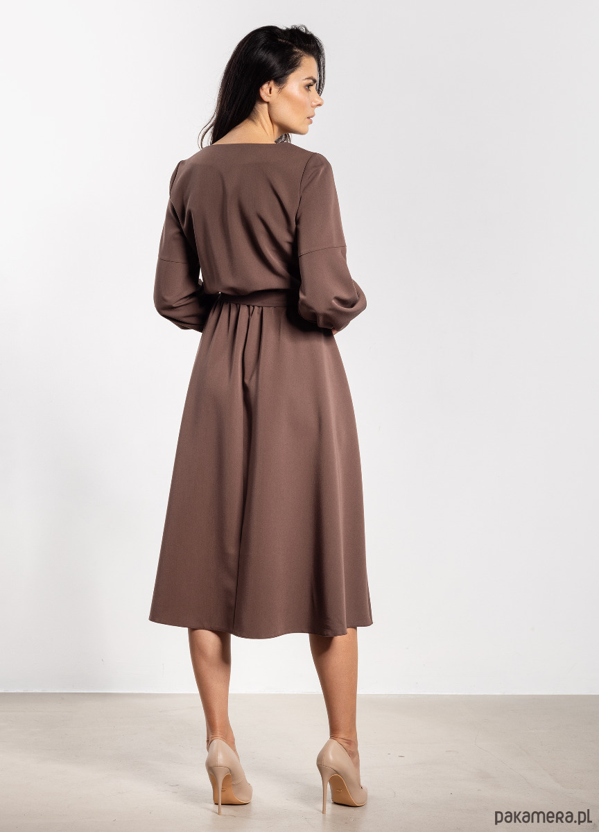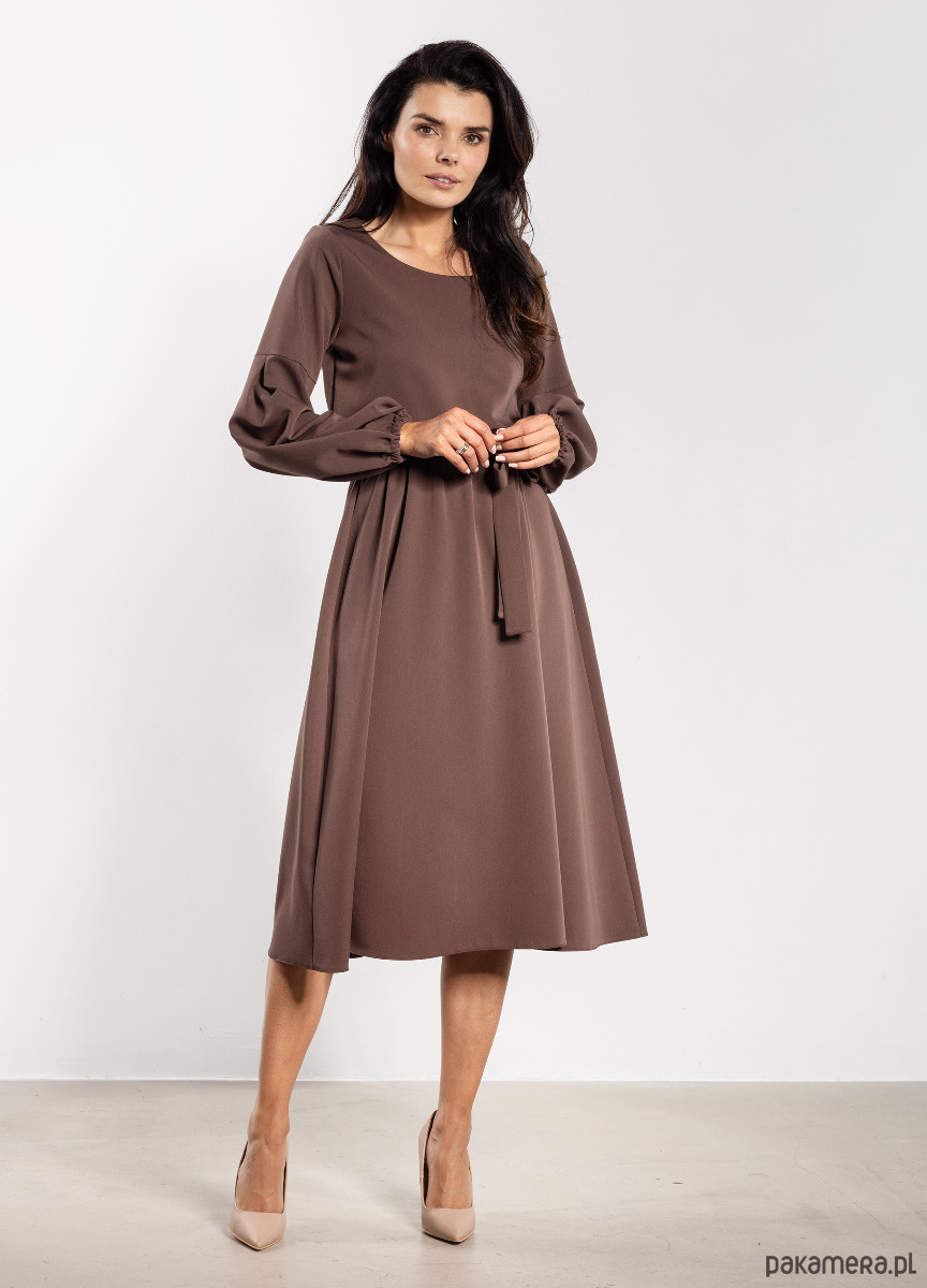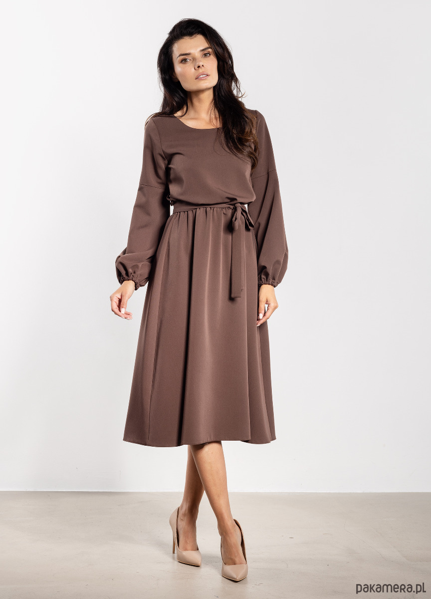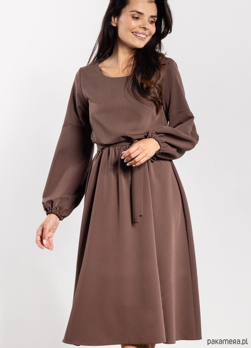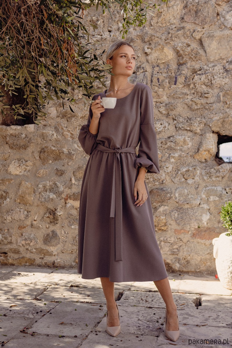Ta sukienka midi łączy elegancję z komfortem. Luźny fason zapewnia wygodę przez cały dzień, a gumka w talii delikatnie dopasowuje się do sylwetki, subtelnie podkreślając kształty. Dołączony pasek pozwala dodatkowo zaakcentować talię, nadając stylizacji kobiecy charakter. Długie bufiaste rękawy z marszczeniem przy mankiecie dodają lekkości, a klasyczny okrągły dekolt sprawia, że sukienka jest ponadczasowa i uniwersalna. Lekko rozkloszowany dół oraz długość za kolano czynią model idealnym zarówno na codzienne stylizacje, jak i na wyjątkowe okazje.