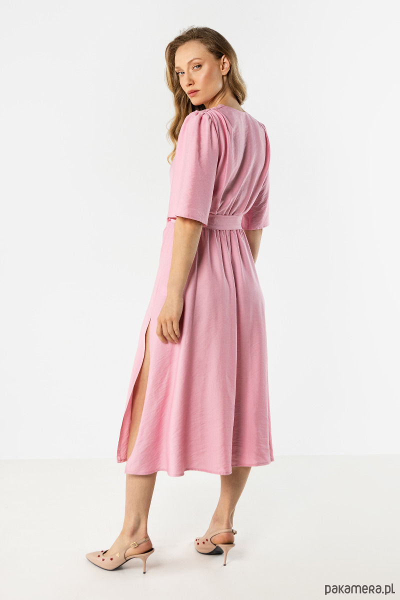 Różowa sukienka kopertowa midi zachwyca subtelnym, kobiecym charakterem. Model z wiązaniem w talii, dekoltem w serek i luźnymi rękawami 3/4 pięknie układa się na sylwetce. Zwiewna tkanina oraz asymetryczny dół nadają całości lekkości, elegancji i romantycznego uroku.