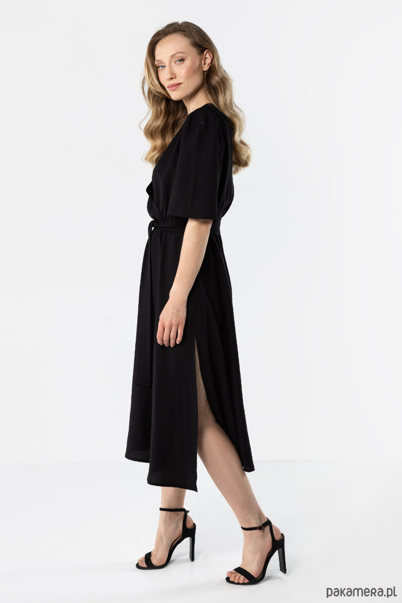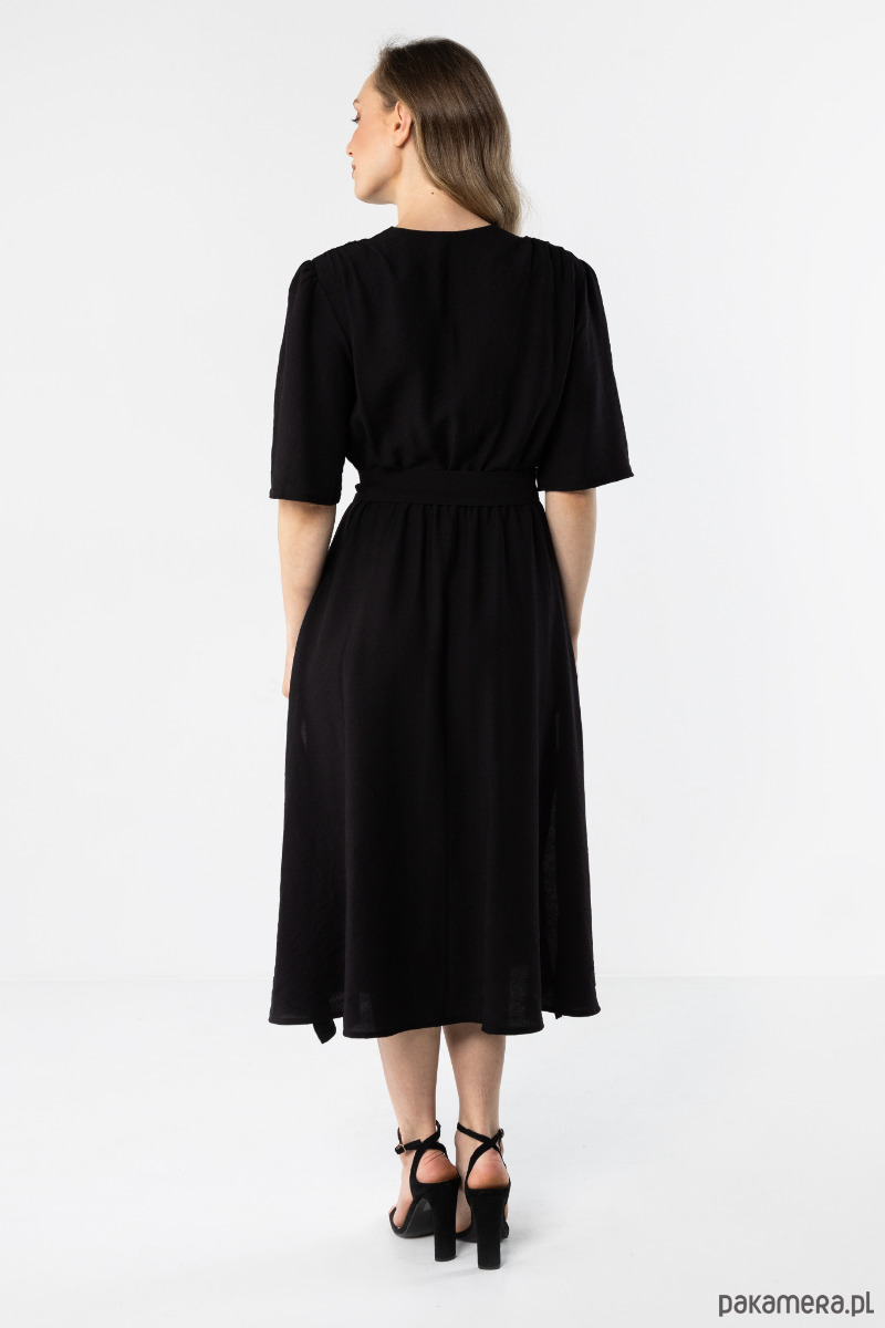 Czarna sukienka kopertowa midi o ponadczasowym, eleganckim charakterze. Model z wiązaniem w talii, dekoltem w serek i swobodnymi rękawami 3/4 pięknie podkreśla sylwetkę. Lekko układająca się tkanina oraz asymetryczny dół dodają stylizacji lekkości i kobiecego wdzięku.