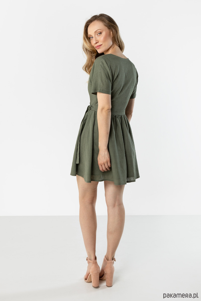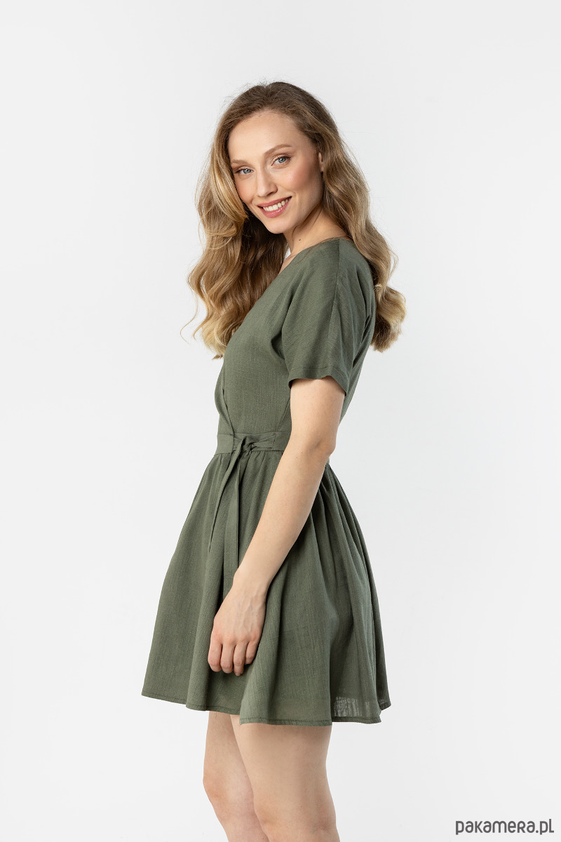 Sukienka w stonowanym kolorze khaki o kobiecym, lekko rozkloszowanym kroju. Kopertowy dekolt, krótki rękaw i wiązanie w talii pięknie modelują sylwetkę, a lekki materiał dodaje stylizacji swobody. Świetnie sprawdzi się na co dzień, na lato i na spotkania.