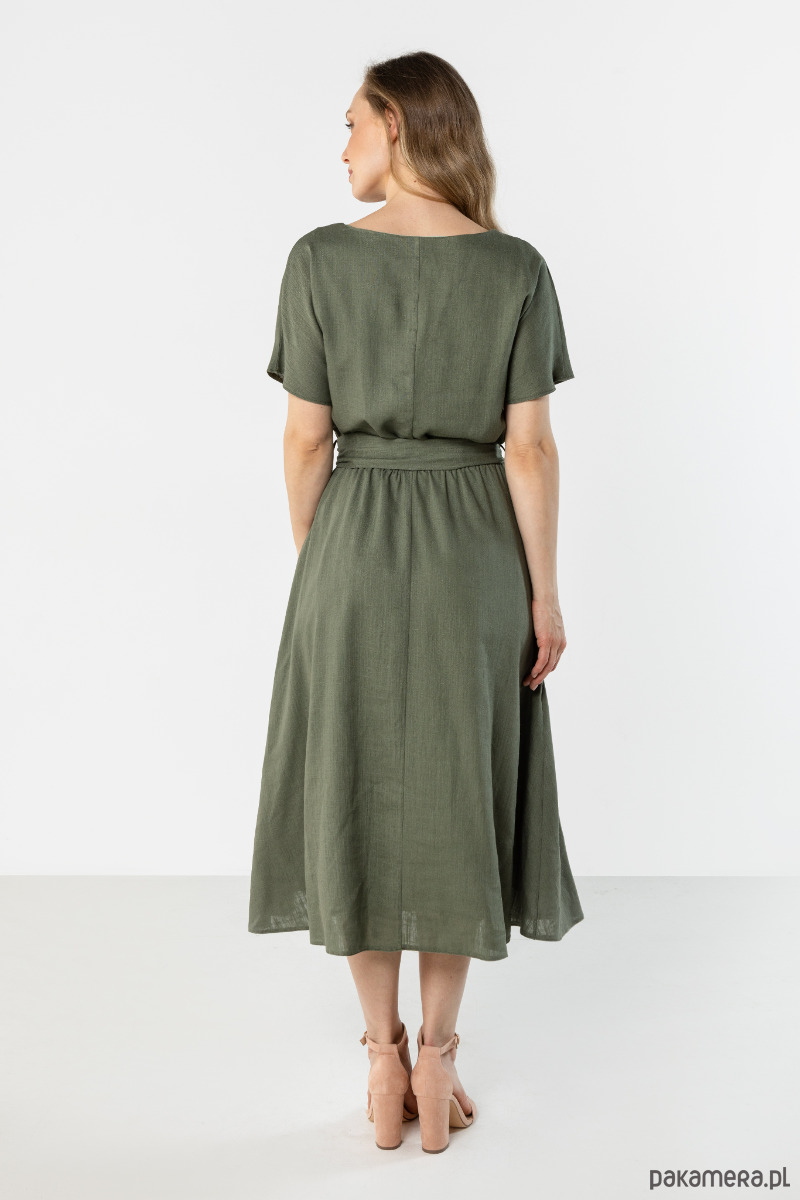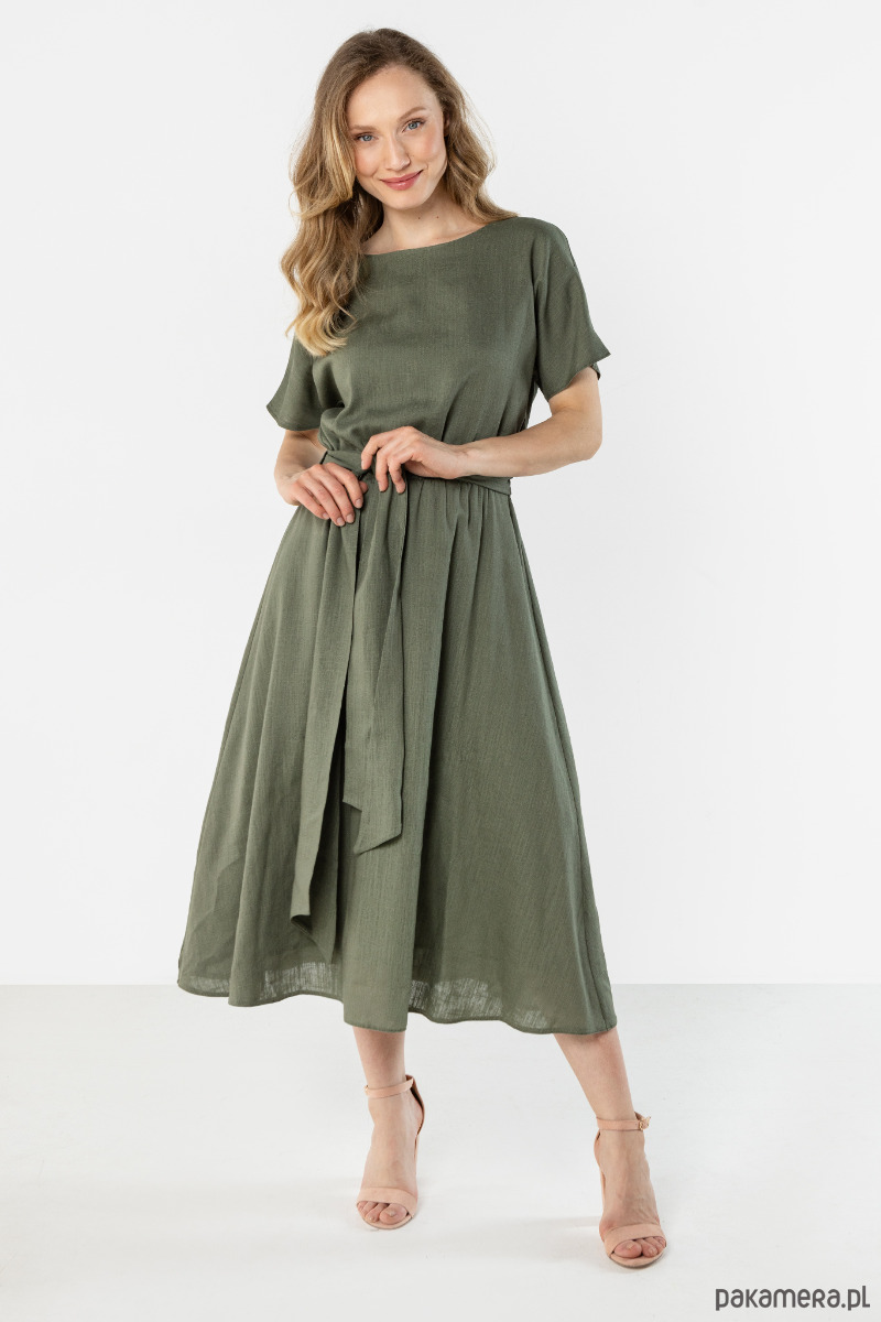 Sukienka w stonowanym kolorze khaki o lekkim, swobodnie układającym się kroju. Model z krótkim rękawem, wiązaniem w talii i rozkloszowanym dołem pięknie podkreśla sylwetkę. Zwiewna forma nadaje całości naturalny, kobiecy i elegancki charakter.