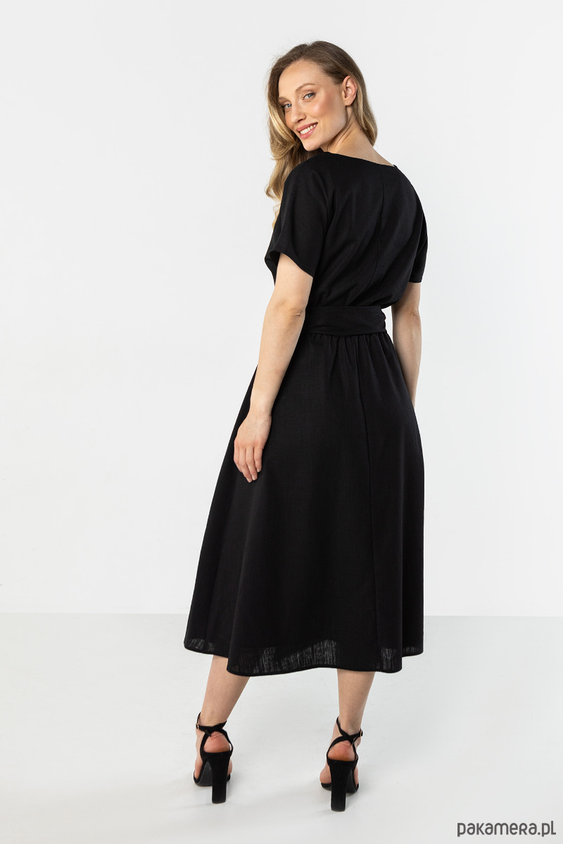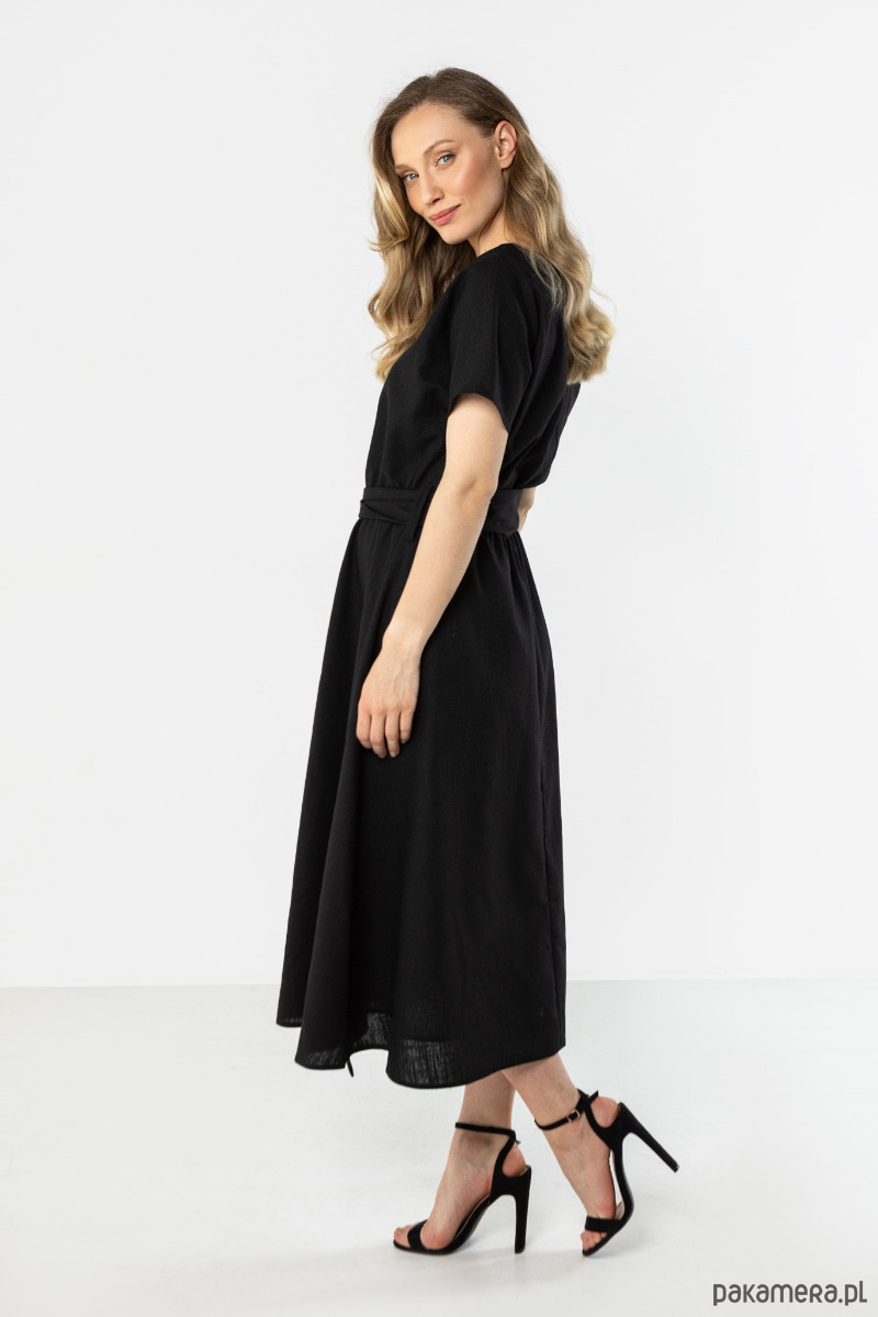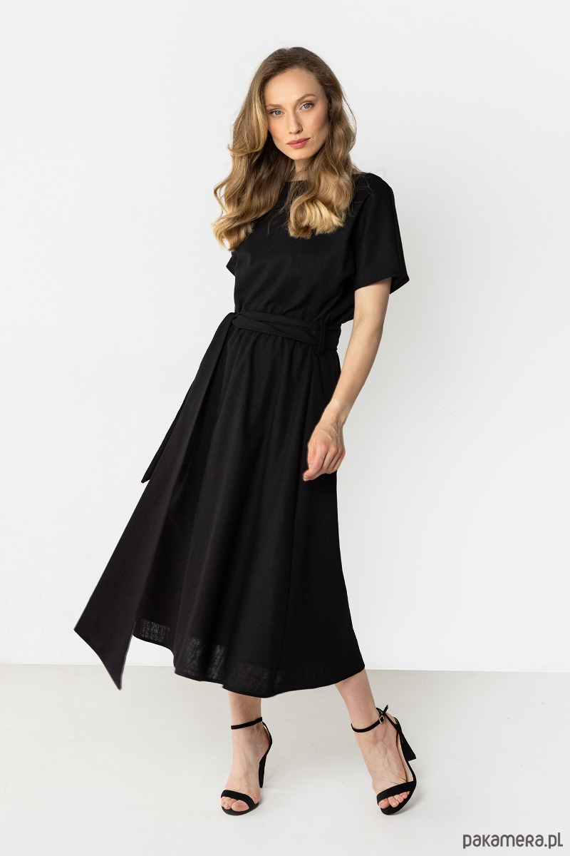 Sukienka w klasycznym czarnym kolorze o lekkim, swobodnie układającym się kroju. Model z krótkim rękawem, wiązaniem w talii i rozkloszowanym dołem subtelnie podkreśla sylwetkę. Zwiewna forma nadaje całości ponadczasowy, kobiecy i elegancki charakter.