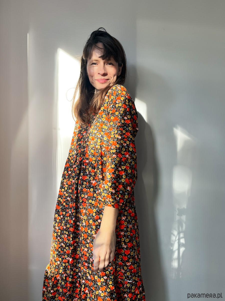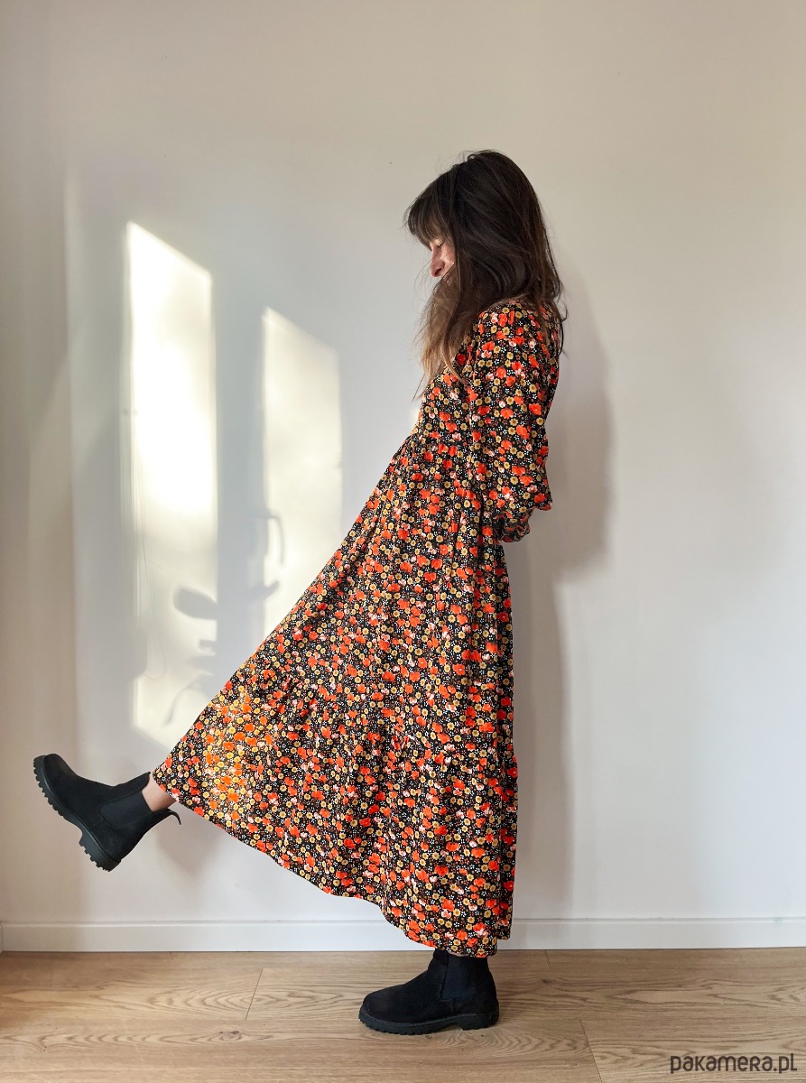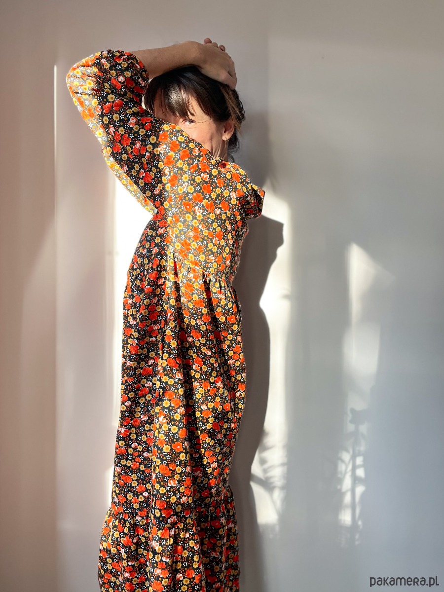 Falbaniasta sukienka z szerokim rękawem, uszyta z unikatowej bawełny w kwiaty.