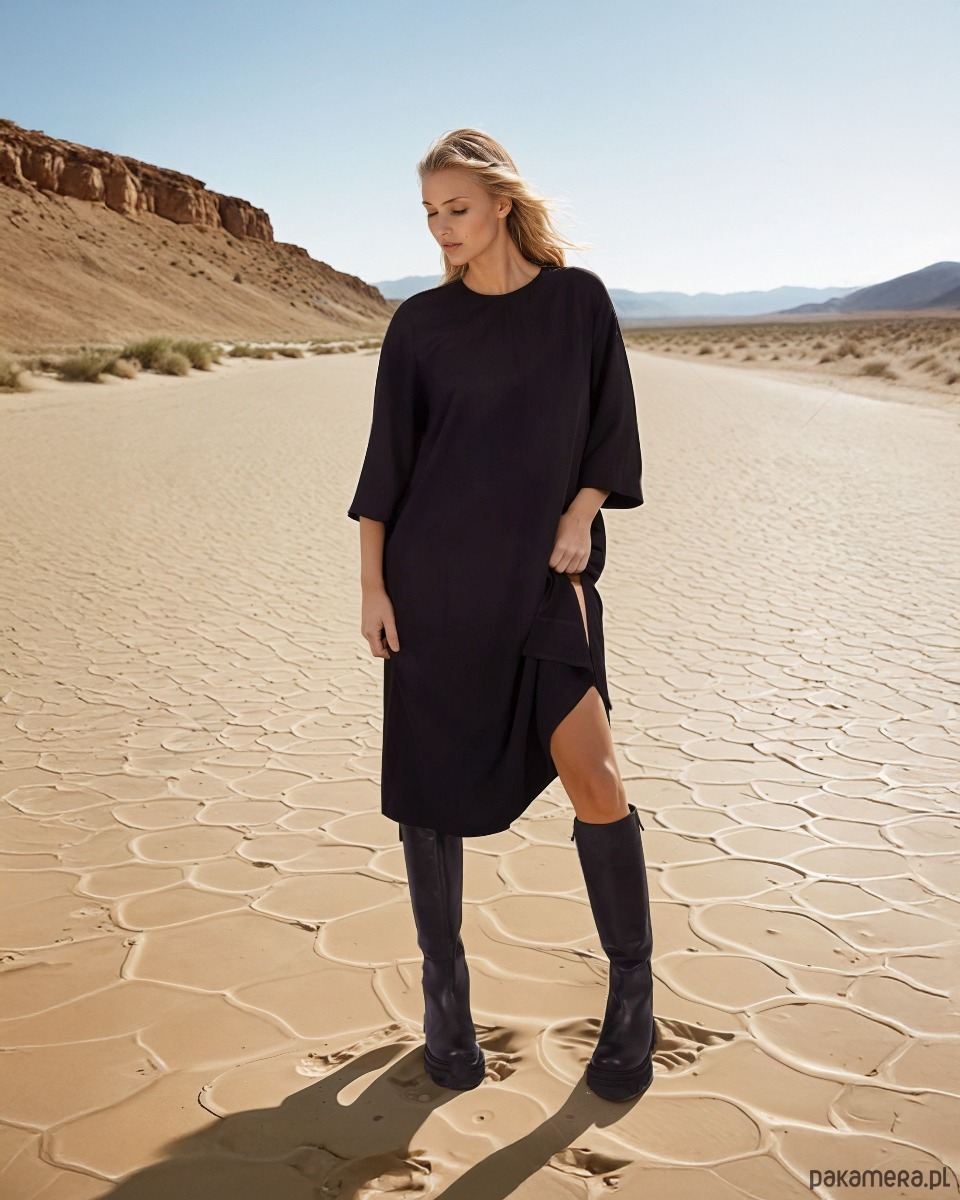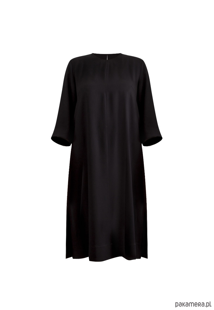 Czarna, klasyczna sukienka za kolano może być podstawą wielu ciekawych stylizacji. Luźny krój o linii A zapewnia swobodę ruchów a kieszenie w szwach bocznych to obowiązkowa wygoda każdego outfitu. Z tyłu przy szyi zapinana na guzik. Uszyta z wiskozy co sprawia, że jest przewiewna co zapewnia komfort noszenia przez cały dzień.