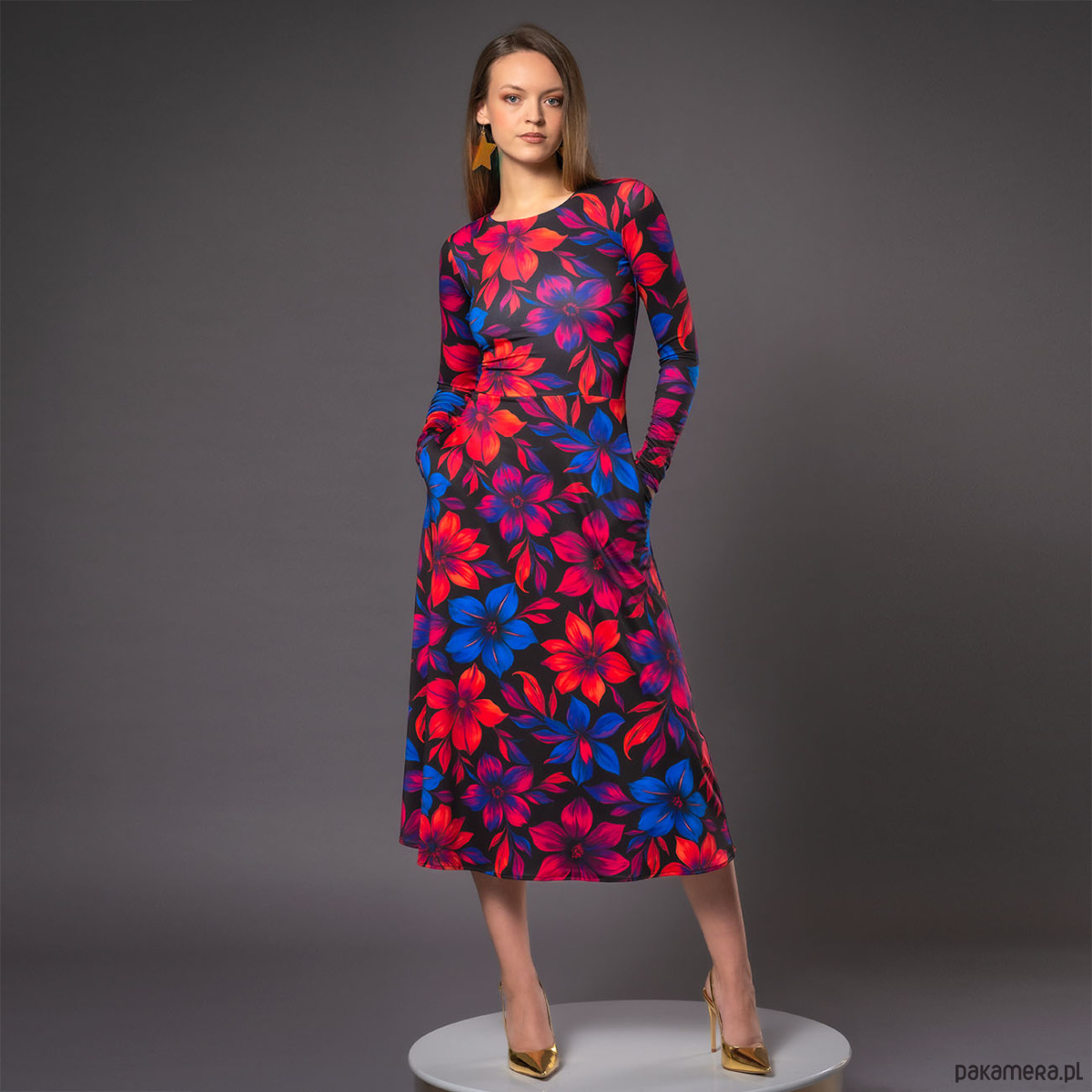 Dopasowana góra z zabudowanym dekoltem i długim rękawem podkreśla sylwetkę, a dół w literę „A” nadaje całości lekkości i świetnie układa się w ruchu.