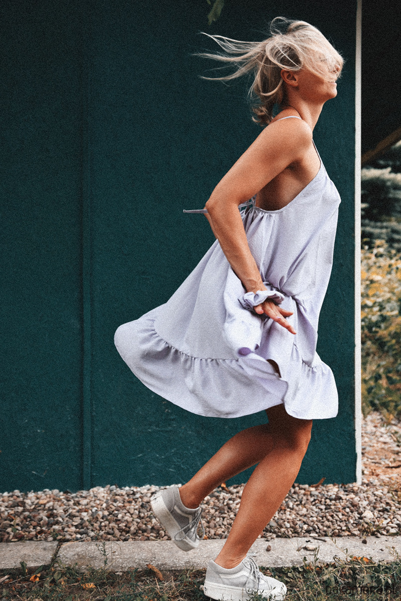 Opalone plecy, dekolt, nogi i ten pudrowy odcień fioletowego. Mów co chcesz, ale napięcie rośnie. Możesz ją wiązać na kilka sposobów i każdy iskrzy. Klasycznie na ramionach, na karku albo na krzyż. Dlaczego? Bo tak. Długie troczki pozwalają regulować co i jak chcesz odsłonić.