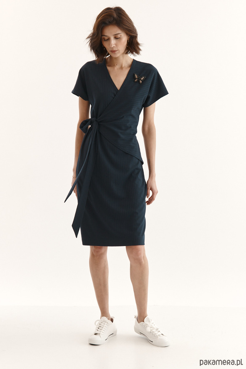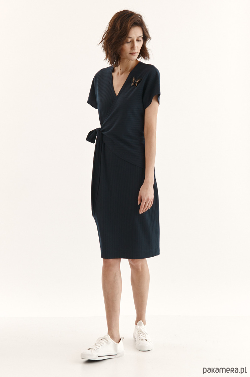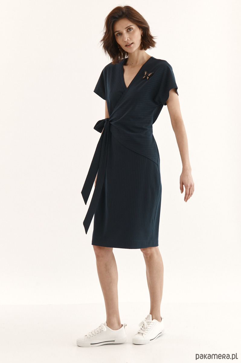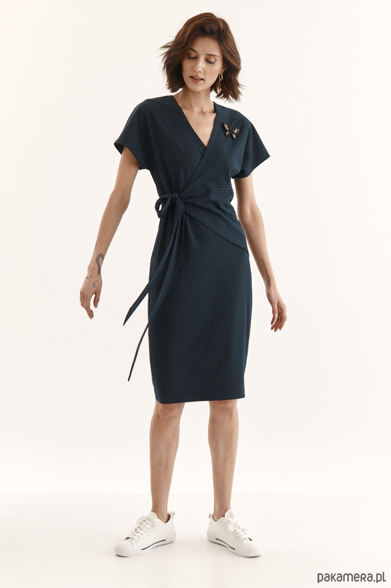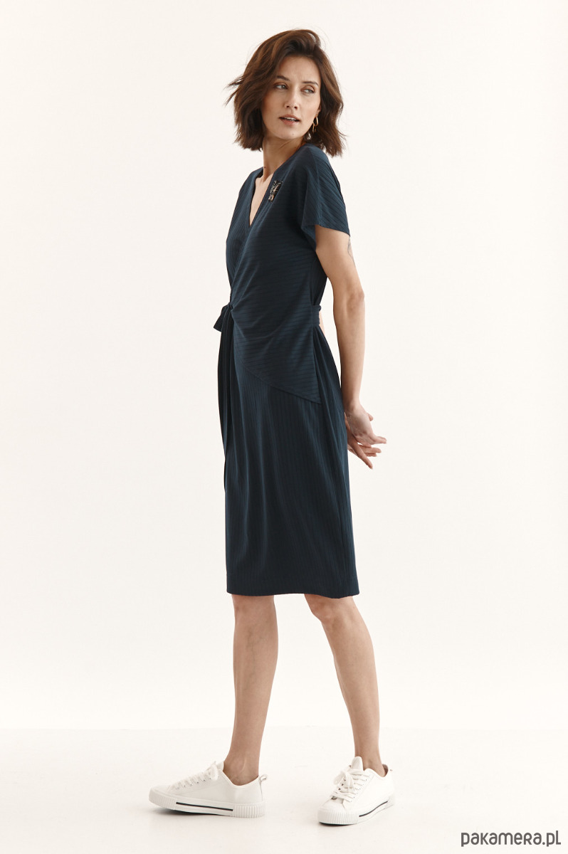 Sukienka Beata ze strukturalnej dzianiny z delikatnym prążkiem. Przód w kopertowym przodem - jeden stały, drugi do regulacji dekoltu. Wiązanie w talii - dookoła sukienki. Kieszeń w bocznym szwie. Ozdobna przypinka na sukience.