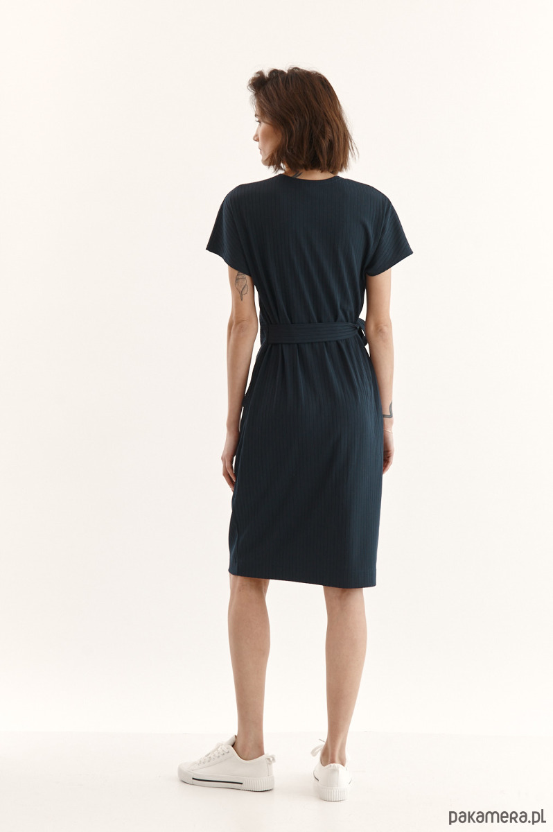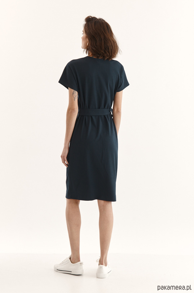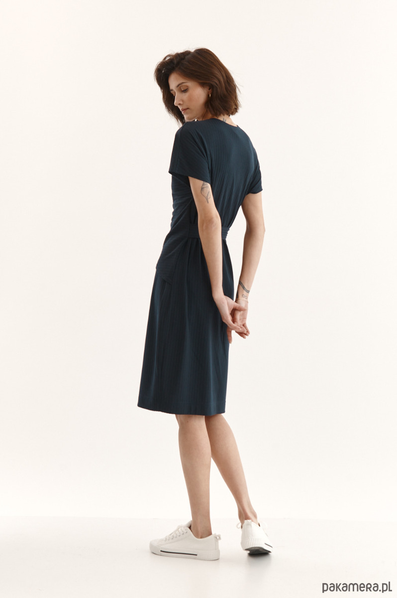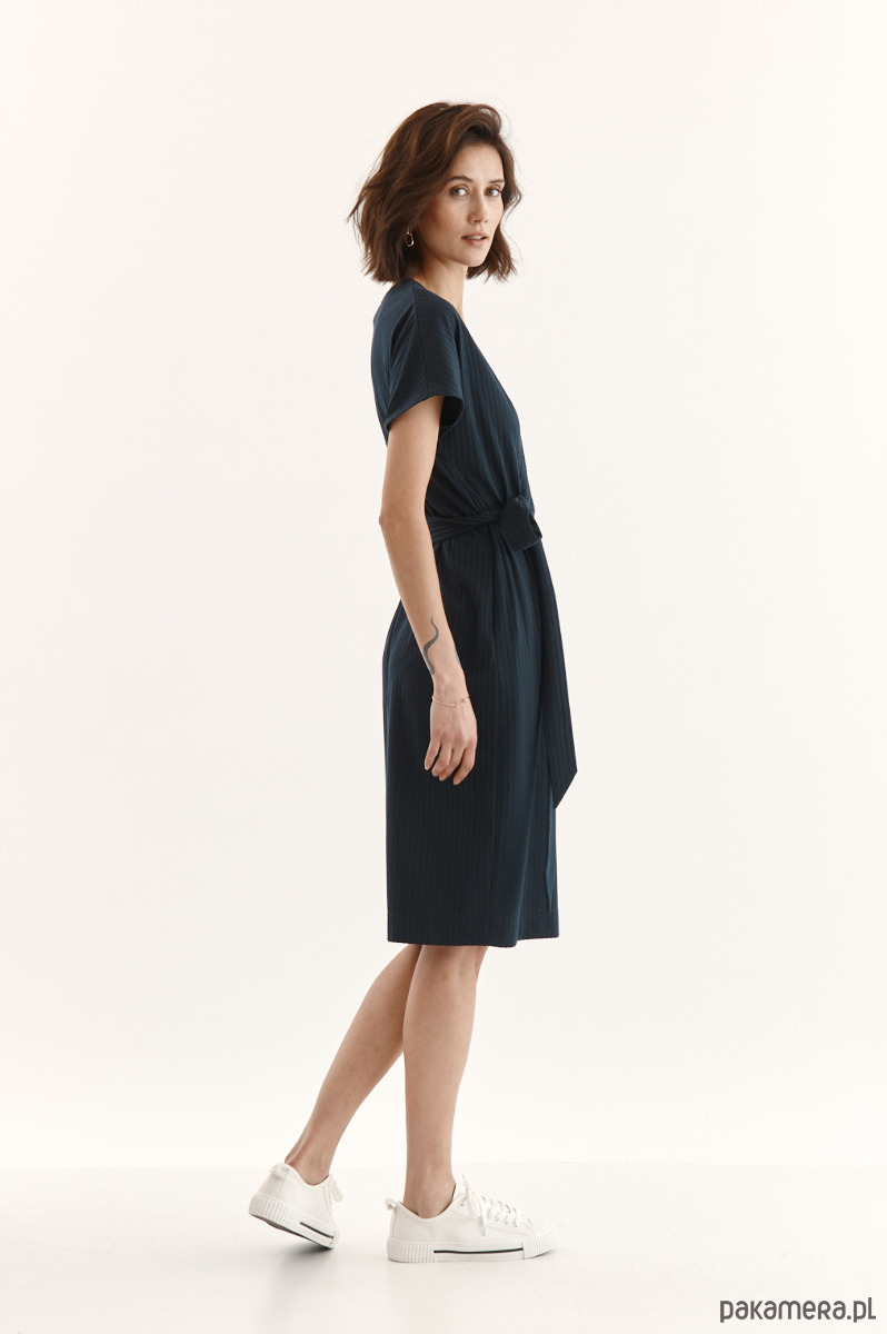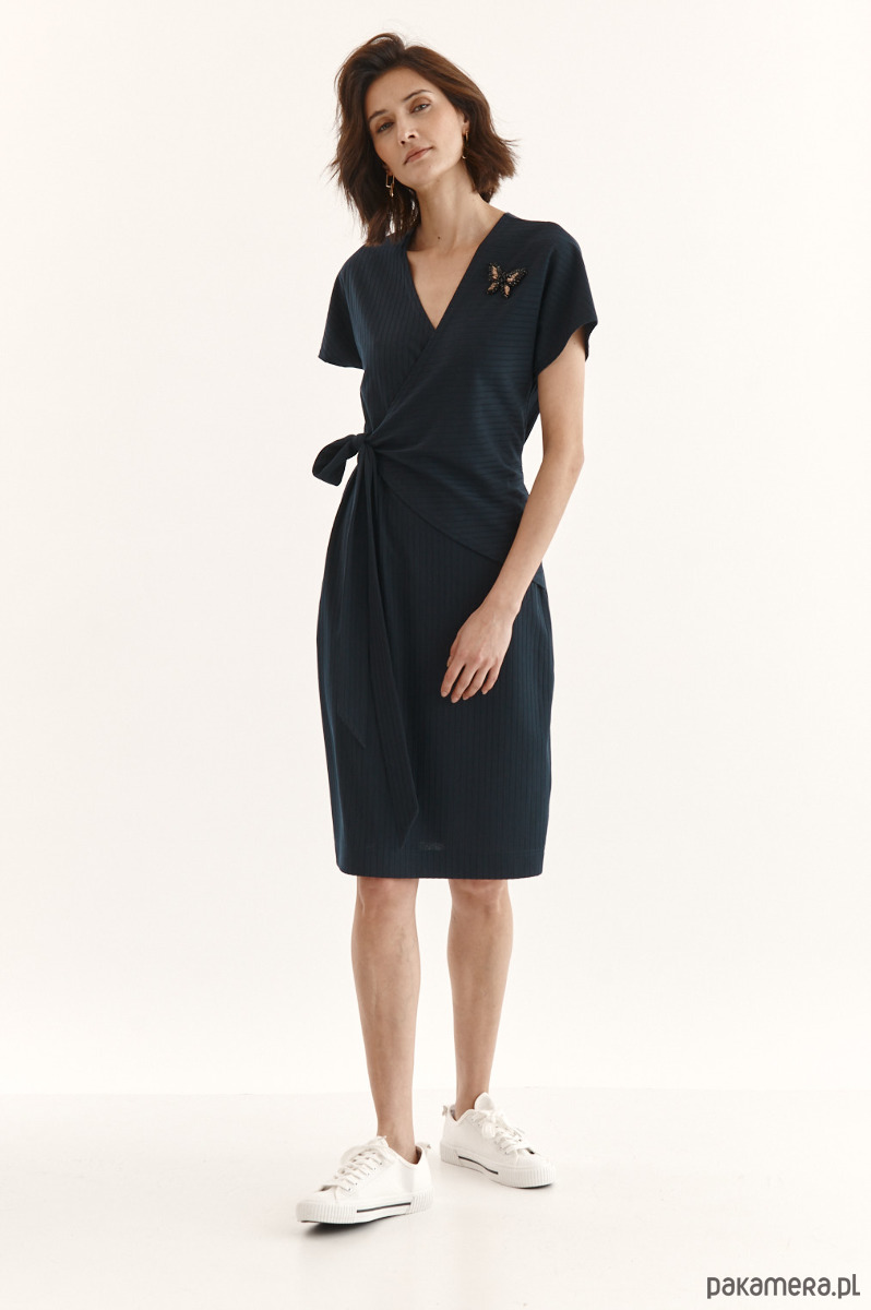 Sukienka Beata ze strukturalnej dzianiny z delikatnym prążkiem. Przód w kopertowym przodem - jeden stały, drugi do regulacji dekoltu. Wiązanie w talii - dookoła sukienki. Kieszeń w bocznym szwie. Ozdobna przypinka na sukience.