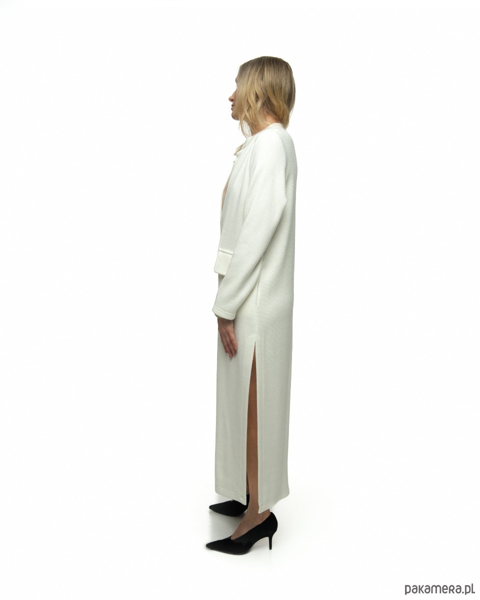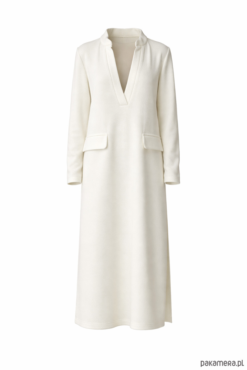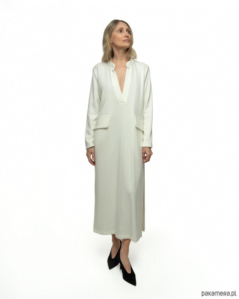 Praktyczne kieszenie ukryte są w bocznych szwach, co pozwala zachować czystą linię fasonu. Wysoki rozporek nadaje sukience lekkości i kobiecej zmysłowości, jednocześnie zapewniając swobodę ruchów.