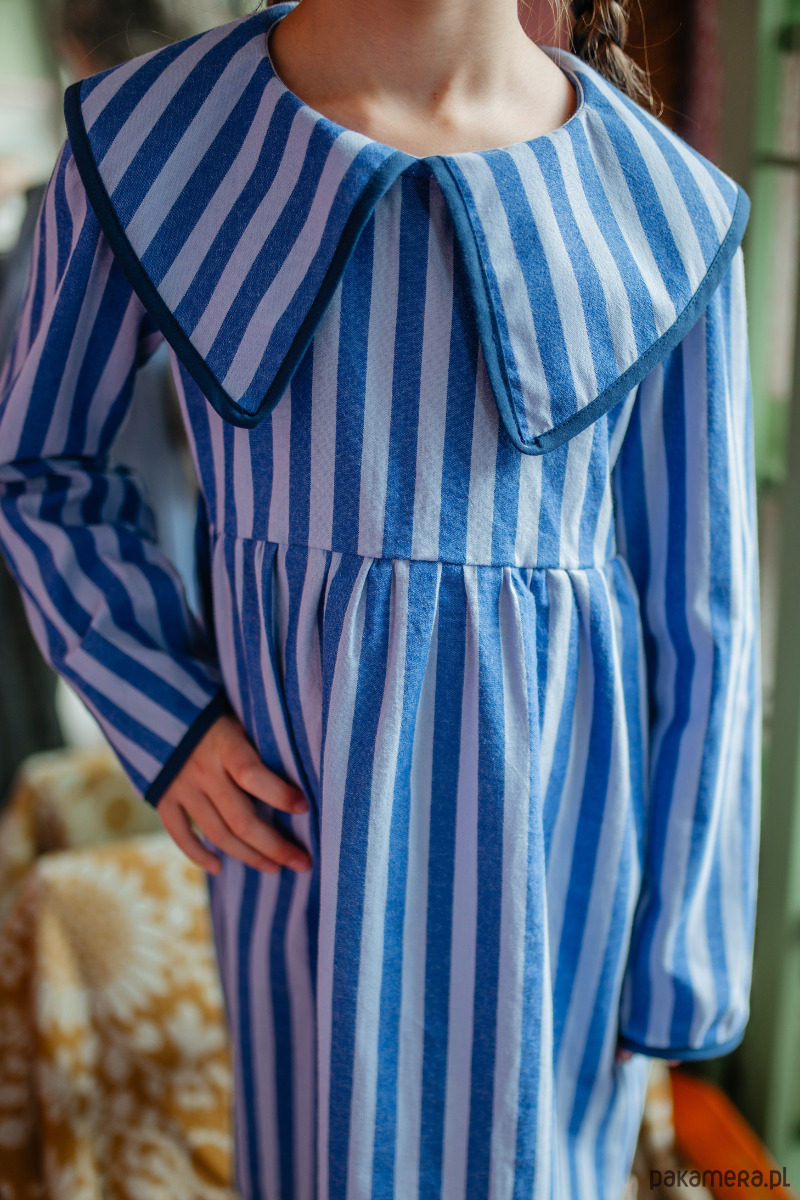 Piękna i bardzo oryginalna sukienka w stylu vintage. Uroczy kołnierzyk w stylu marynarskim dodaje jej uroku. Ozdobiona bawełnianą lamówką. To kreacja obok której nie przejdzie się obojętnie.