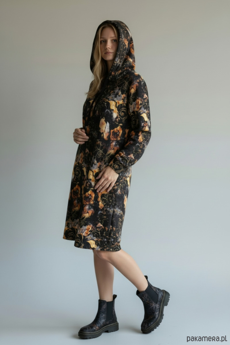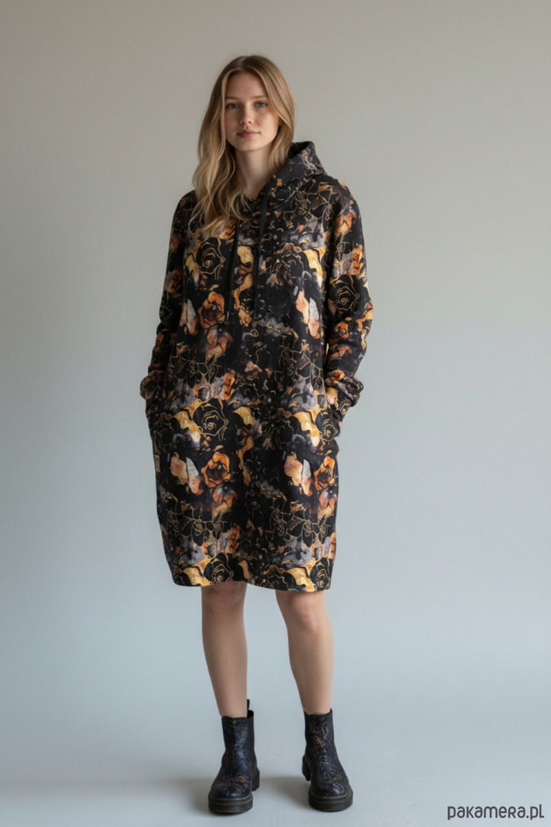 Elegancka sukienka bluza dresowa z motywem czarno-złotych róż, która łączy wygodę casualowej bluzy z kobiecym fasonem sukienki. Model Dharana powstał jako pojedynczy egzemplarz, z dbałością o detale i estetyczne wykończenie, co sprawia, że jest propozycją niepowtarzalną i pełną charakteru.