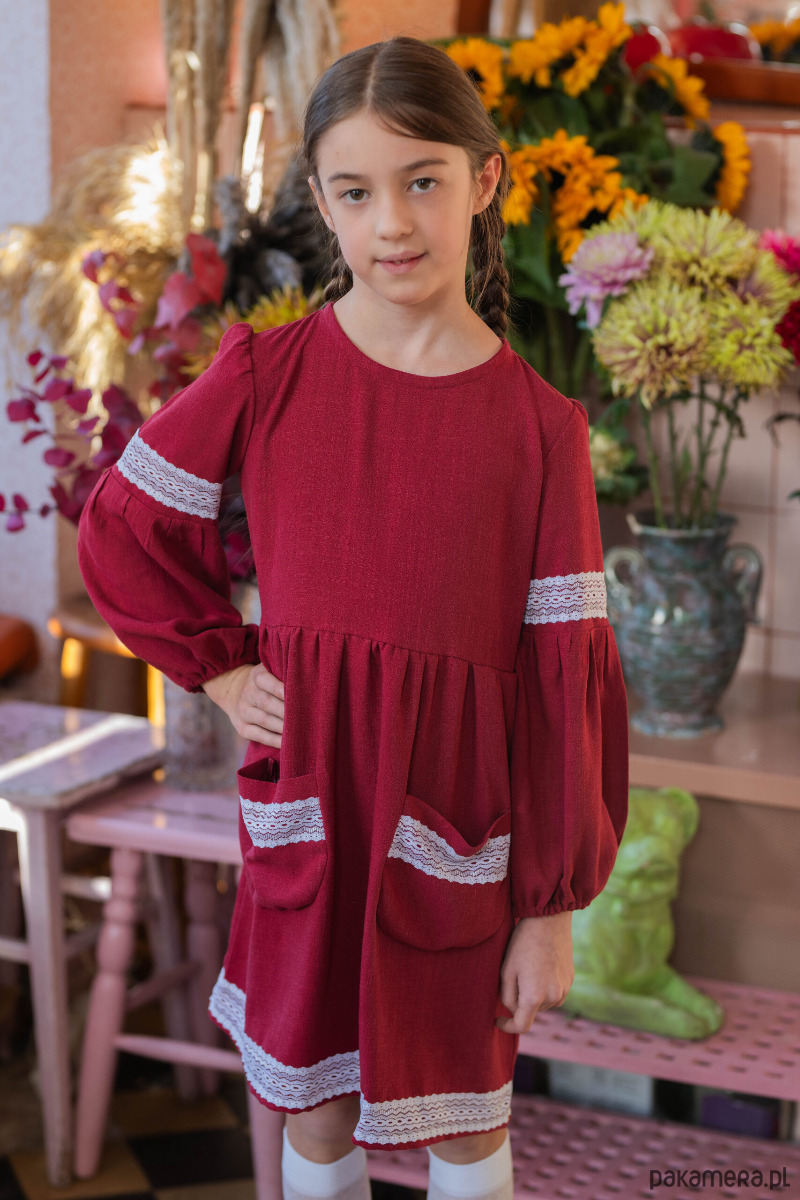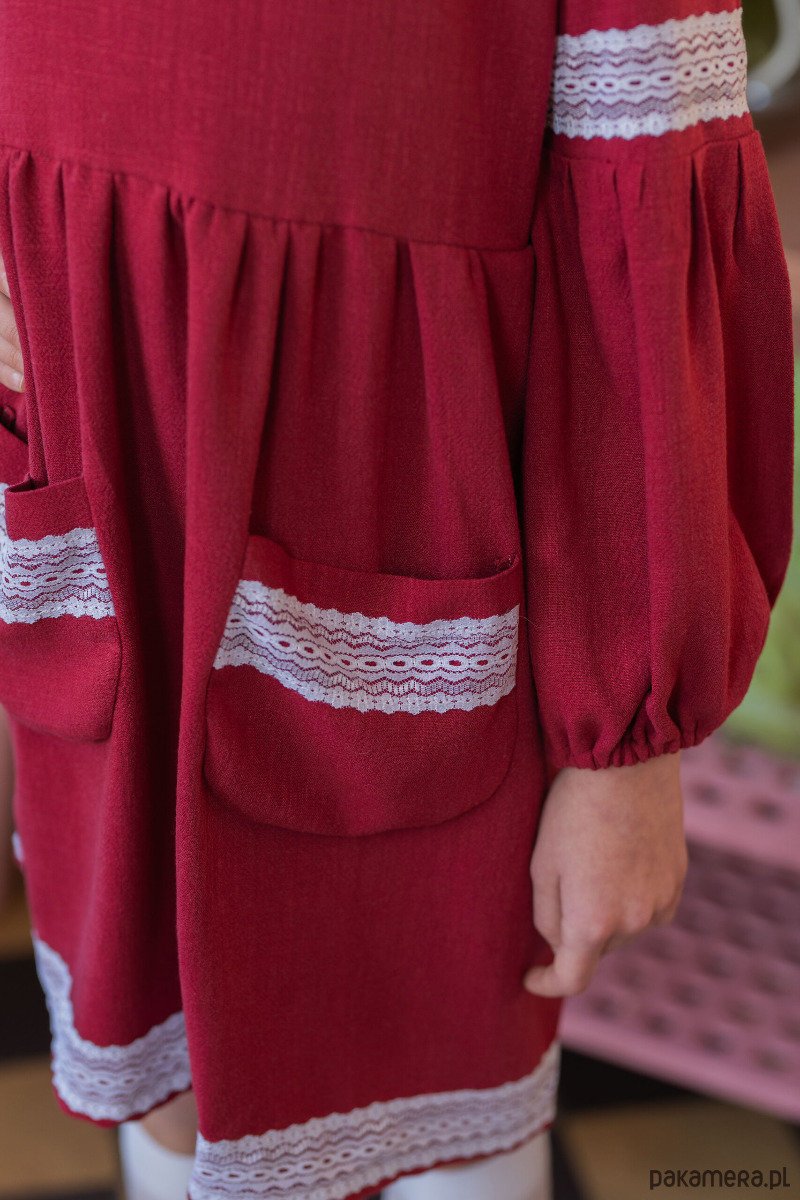 Piękna i elegancka sukienka z uroczymi kieszonkami. Ozdobiona bawełnianą koronką. Bufiaste rękawki nadają jej szyku i elegancji. Polecana na wyjątkowe uroczystości oraz klimatyczne sesje zdjęciowe.