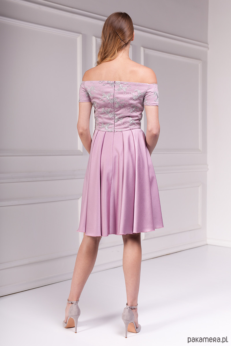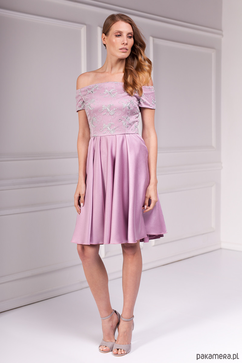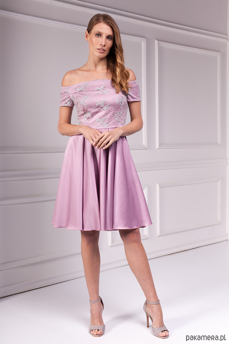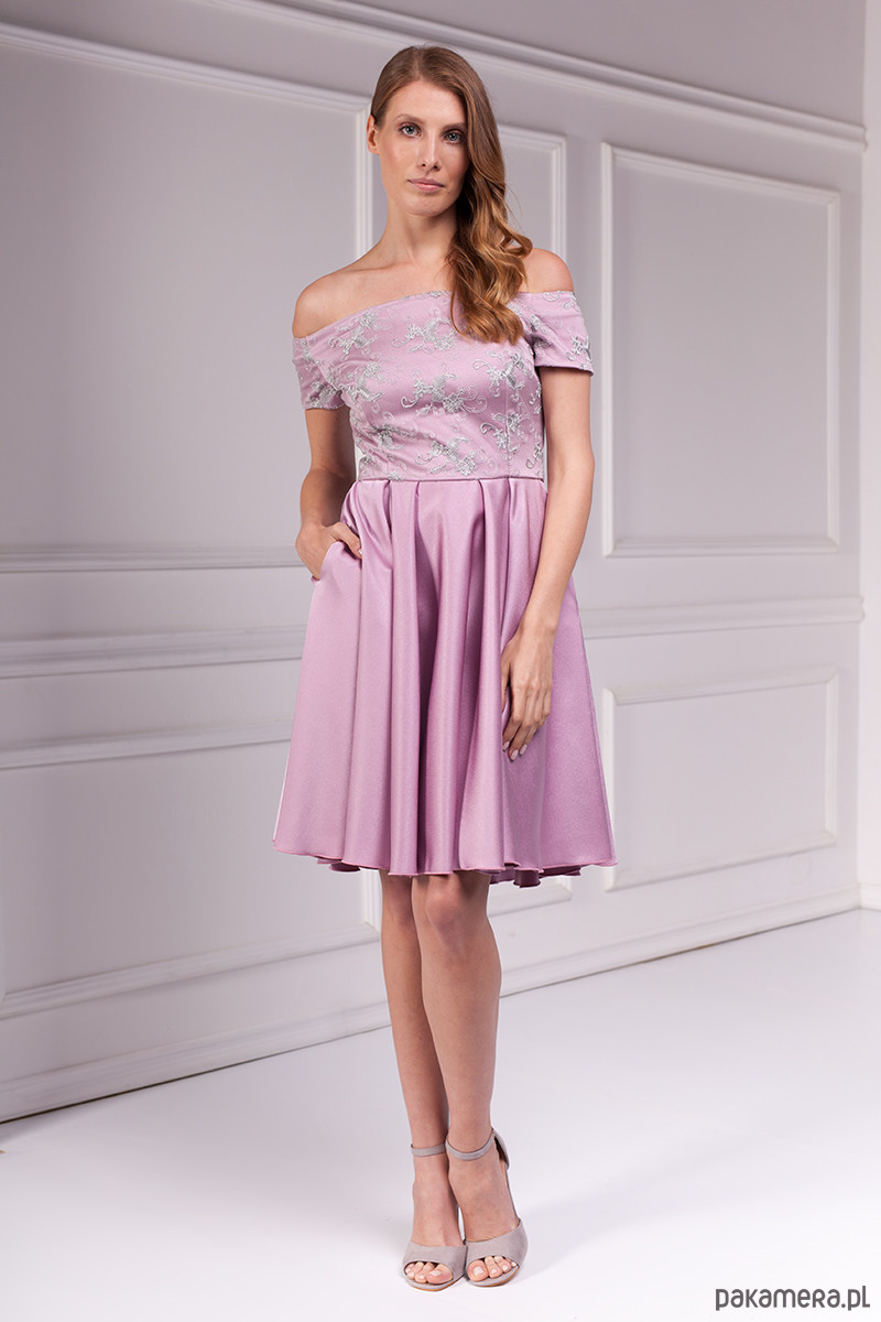 Romantyczna sukienka z ekskluzywnej kolekcji Premium uszyta z wysokiej jakości lekko elastycznego atłasu w kolorze wrzosowym. Góra dopasowana z naszytą szarą koronką eksponująca ramiona. Dół rozkloszowany z efektownymi zakładkami i kieszeniami w bokach. Zamek kryty z tyłu, długość od talii 60 cm.